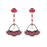 Madhubani Phoolkari Fables Oxidised Enamel Earrings—an exquisite blend of heritage and modern charm, designed for the woman who carries culture with confidence. Crafted from high-quality brass with silver plating, these danglers celebrate the artistic richness of Madhubani art, brought to life through delicate enamel detailing and intricate jali work. The earrings feature vivid red floral motifs, echoing age-old storytelling, while the elegant pearl drop adds a sophisticated touch. Whether it's a festive celebration like Diwali or Rakshabandhan, a thoughtful gift for a mother, sister, girlfriend, or wife, or an accessory that effortlessly elevates your office jewelry or vacation wear, these statement earrings seamlessly balance tradition and trendiness. Pair them with Indo-western outfits, chic ensembles, or ethnic attire—they’re versatile enough for daily wear, travel, and special occasions alike. An artistic gift that speaks volumes, perfect for Christmas, New Year, Valentine's Day, and beyond!