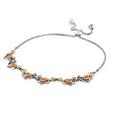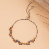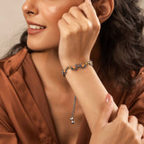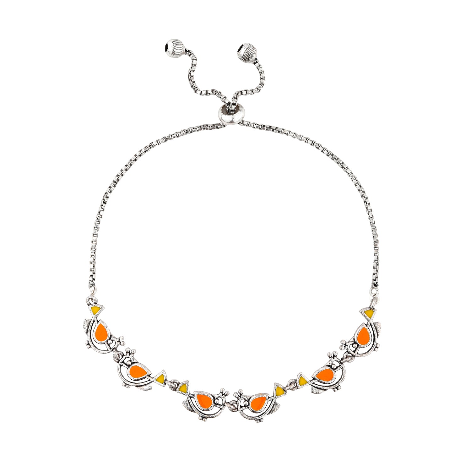 A poetic celebration of nature, tradition, and artistic finesse, the Madhubani Vihang Vibes Oxidised Enamel Bracelet is a masterpiece that blends heritage with everyday elegance. Crafted from brass with an oxidized silver finish, this link bracelet features exquisitely detailed bird-shaped charms, each adorned with enamel accents in warm hues of orange and yellow—a tribute to the vibrant storytelling of Madhubani art. The adjustable sliding bead mechanism ensures a comfortable fit, making it a perfect companion for office jewelry, vacation wear, or festive celebrations like Diwali, Rakshabandhan, Holi, and Christmas. Whether styled with traditional attire or contemporary fusion outfits, this designer bracelet adds a graceful charm to any look, making it a thoughtful gift for women—ideal for Valentine’s Day, a rakhi gift for sisters, or a special present for a girlfriend, wife, mother, or lover. With its chic, trendy appeal and cultural storytelling, this piece is more than jewelry—it’s a wearable piece of art.