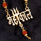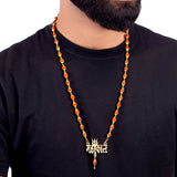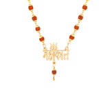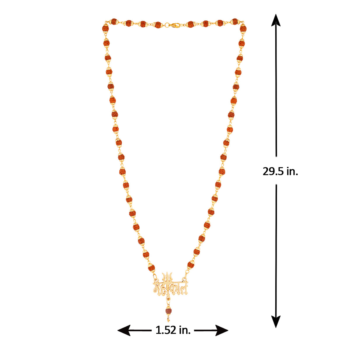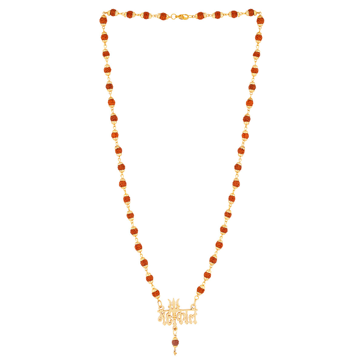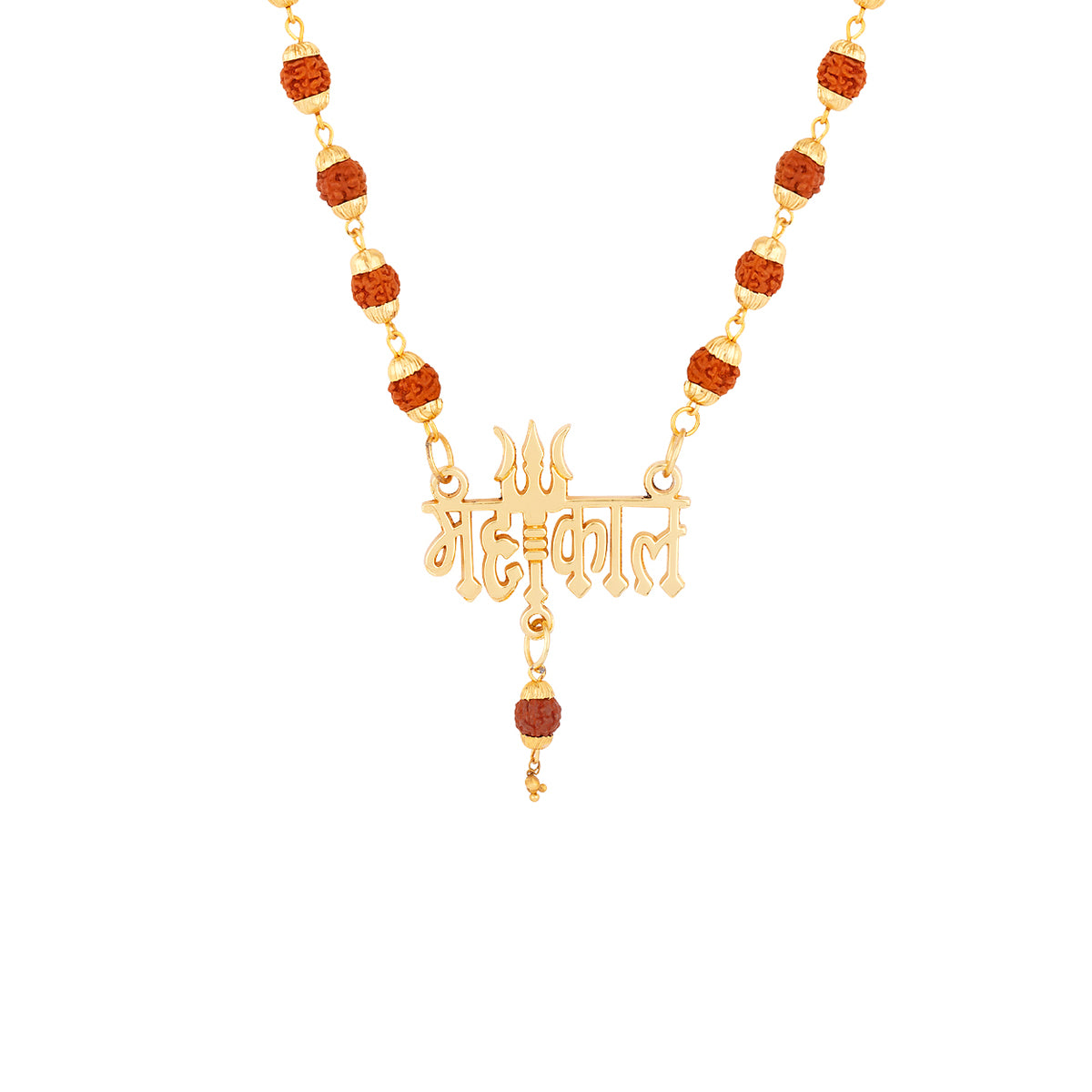 Yellow gold plated trishul motif and inscription pendant for men. Threaded in a Rudraksha beads chain. Pair with ethnic looks. To make your accessories last longer avoid harsh chemicals and moisture. Keep dry, clean with dry cloth and wear with panache. "India?s largest fashion jewelry brand DARE, comes from the House of Voylla as a limited edition of handcrafted accessories for the modern Indian men. "