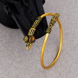 OM open bracelet for men made from brass and oxidized gold plated. Wear with a formal kurta. To make your accessories last longer avoid harsh chemicals and moisture. Keep dry, clean with dry cloth and wear with panache. "India�s largest fashion jewelry brand DARE, comes from the House of Voylla as a limited edition of handcrafted accessories for the modern Indian men. "