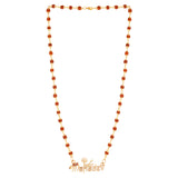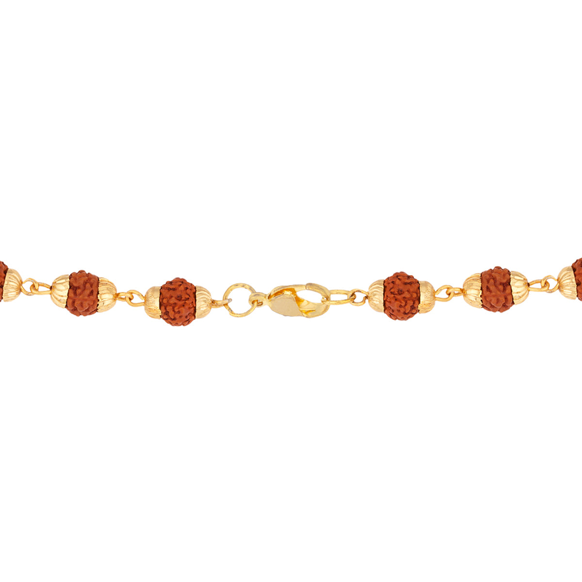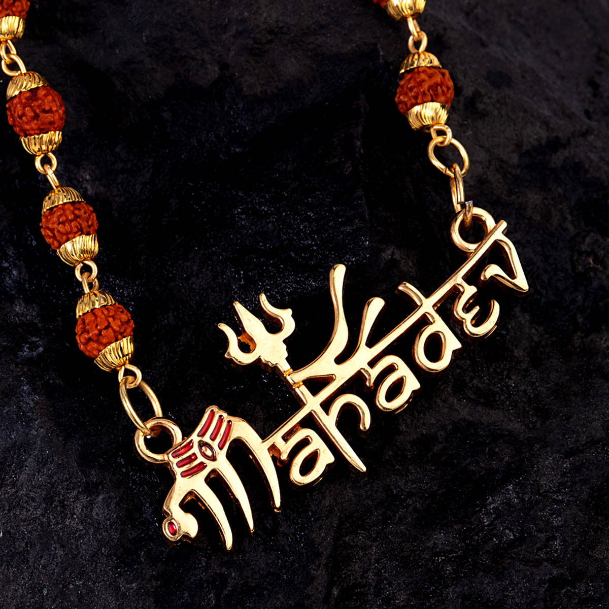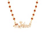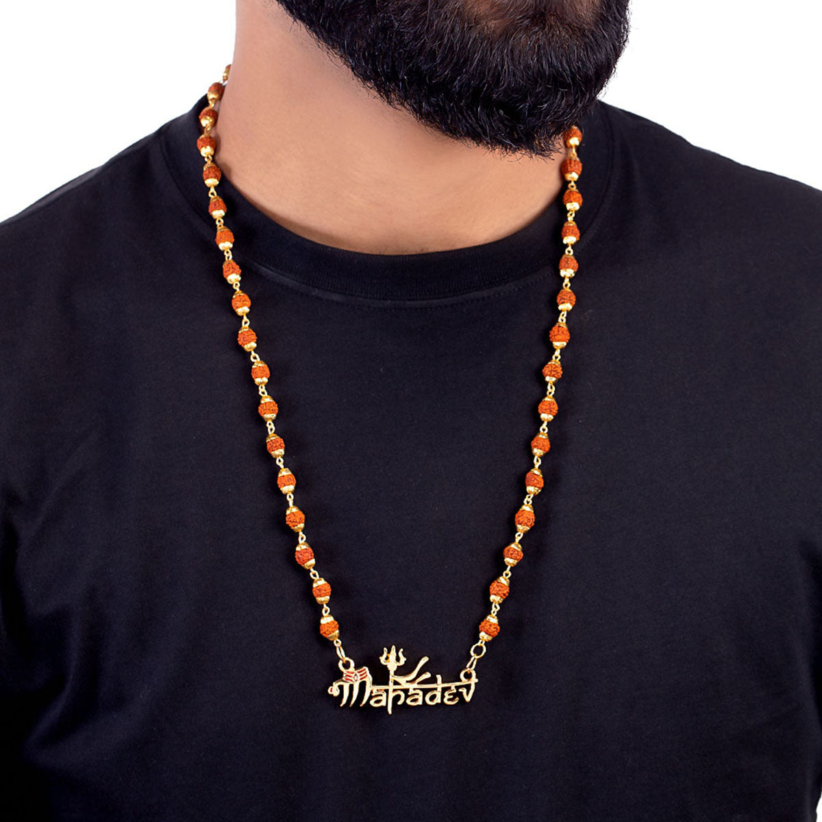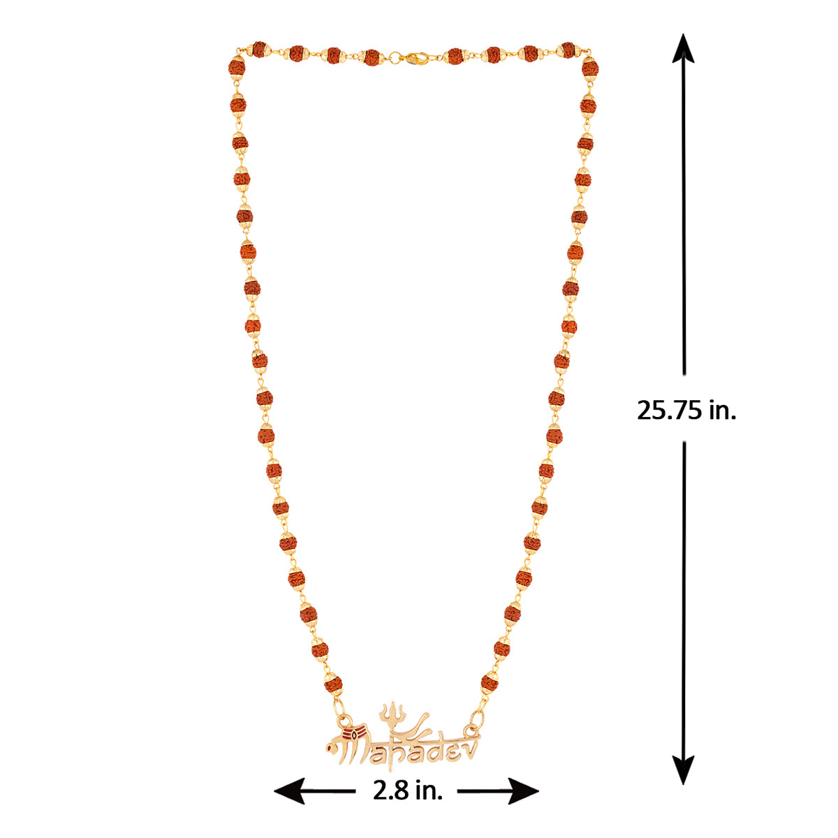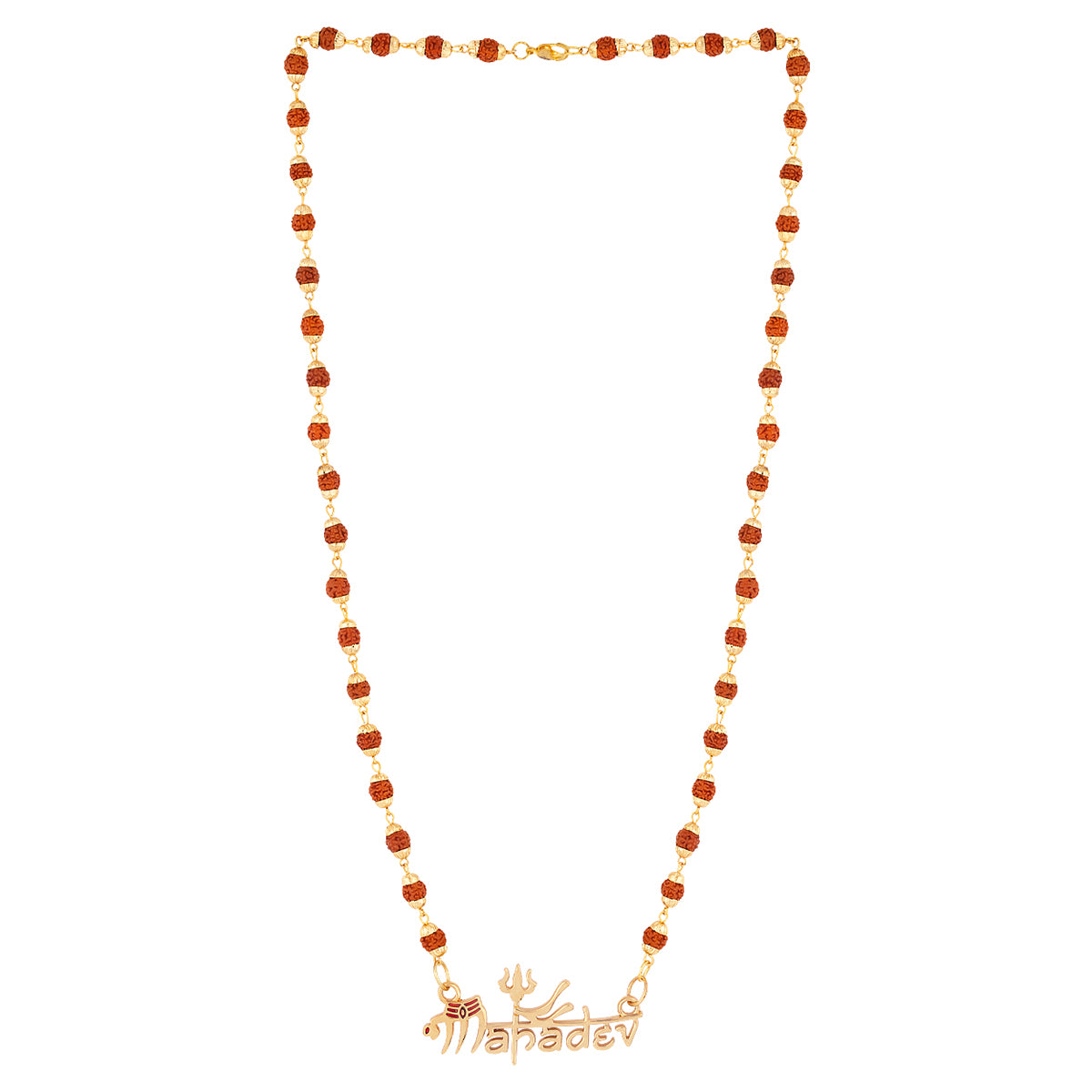 Trishul and inscription pendant threaded in a Rudraksha chain. Yellow gold plated. Wear with formal attire. To make your accessories last longer avoid harsh chemicals and moisture. Keep dry, clean with dry cloth and wear with panache. "India?s largest fashion jewelry brand DARE, comes from the House of Voylla as a limited edition of handcrafted accessories for the modern Indian men. "