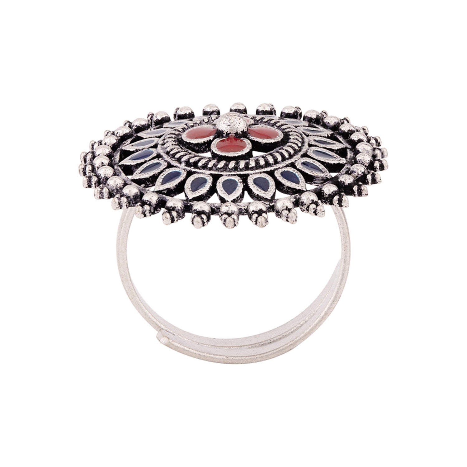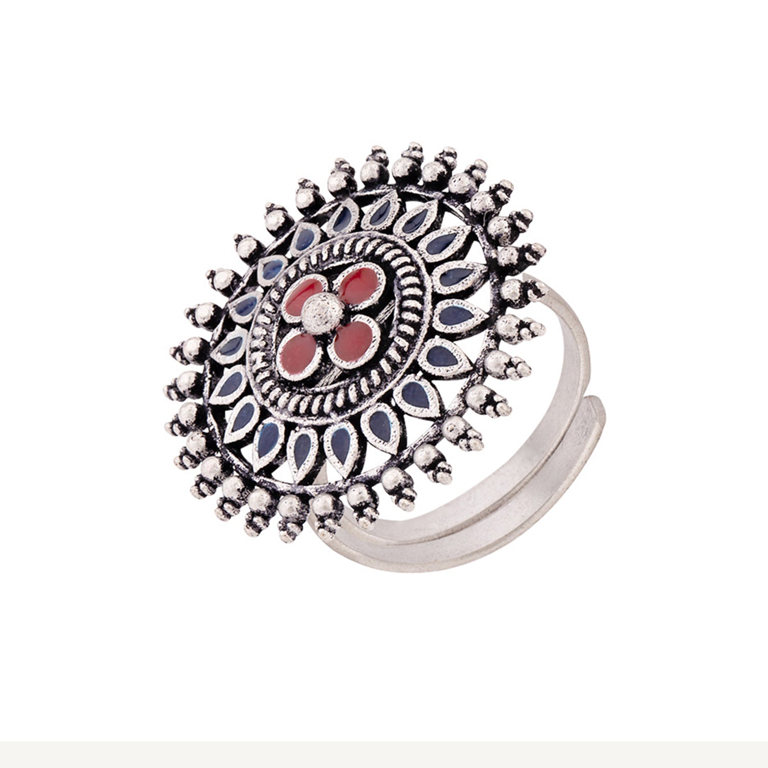 Floral finger ring made from brass. Oxidized silver plated and a good match for casual outfits.