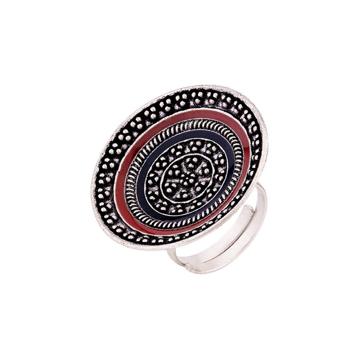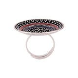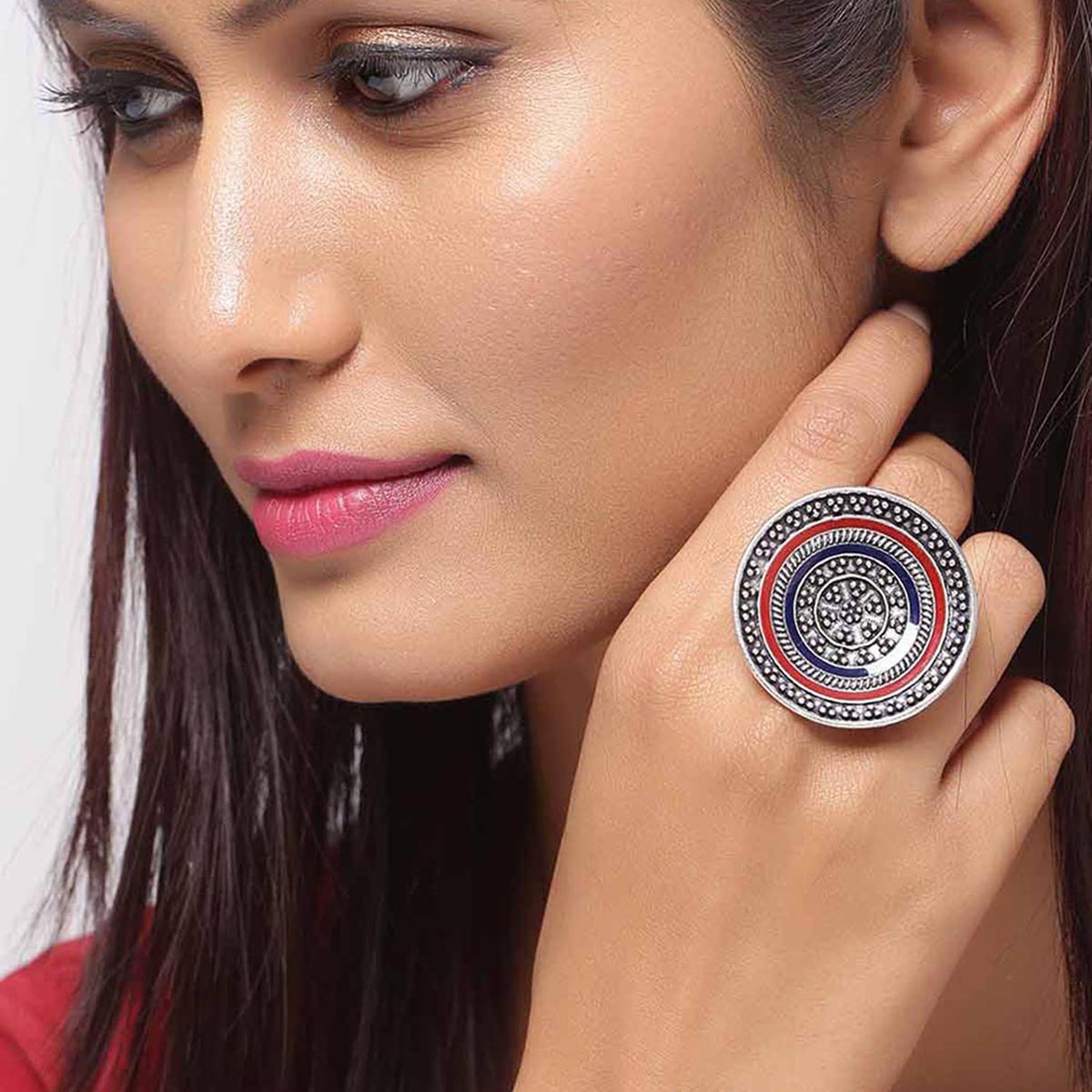 Large disc ring with enamel embellishments. Made from brass and oxidized silver plated. Wear with a casual saree.