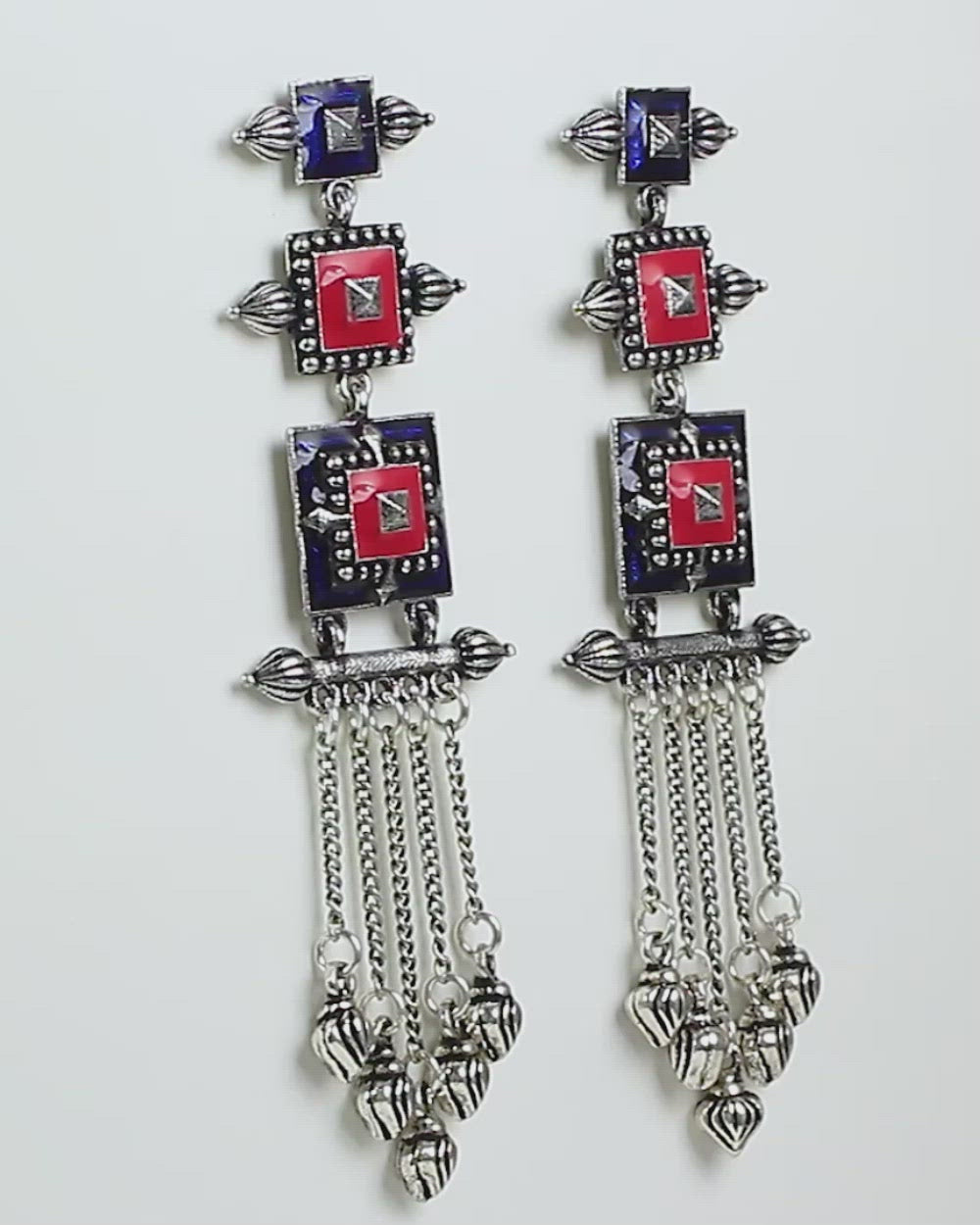 Layered square drop style earrings with enamel embellishments. Made from brass and oxidised silver plated. Wear with a formal kurta. This piece of jewelry comes with the Voylla assurance of quality and durability.