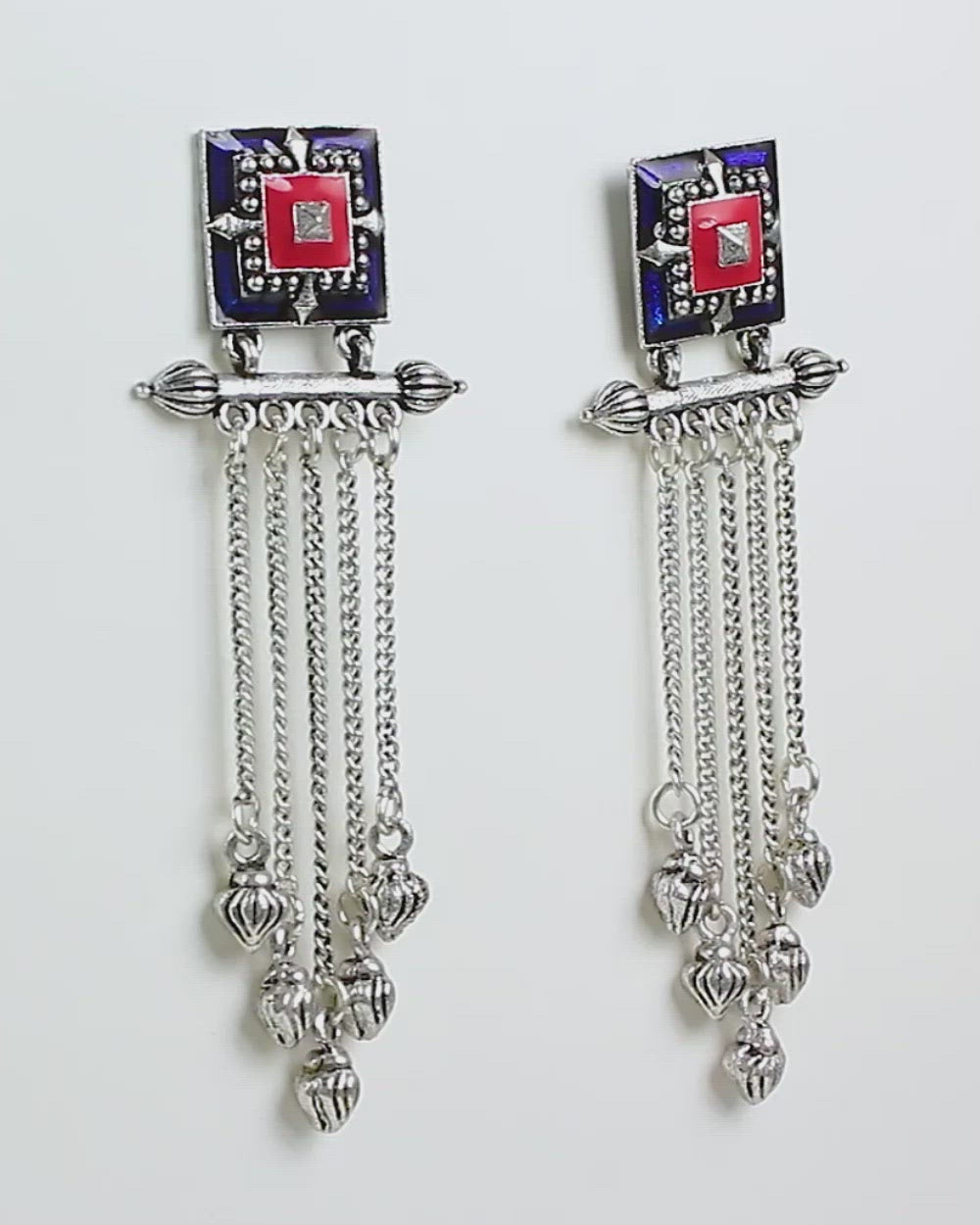 Rangoli inspired tassels drop earrings. Made from brass and oxidised silver plated. Good for formal wear. This piece of jewelry comes with the Voylla assurance of quality and durability.