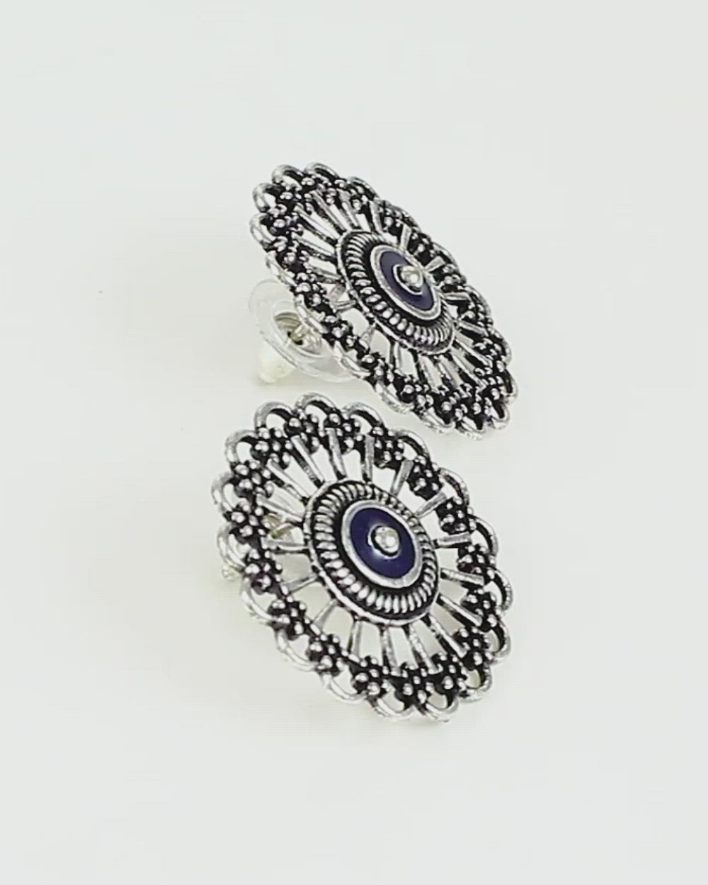 Tiny floral motifs adorned stud style brass earrings. Wear the oxidized silver plated pair with a summer dress.
