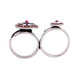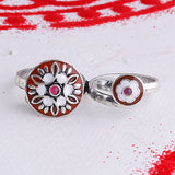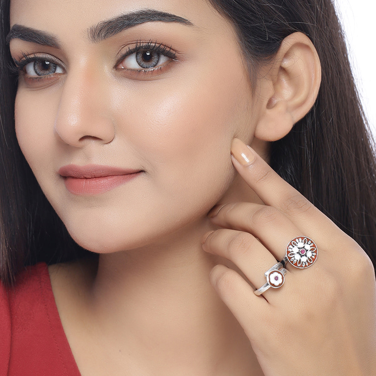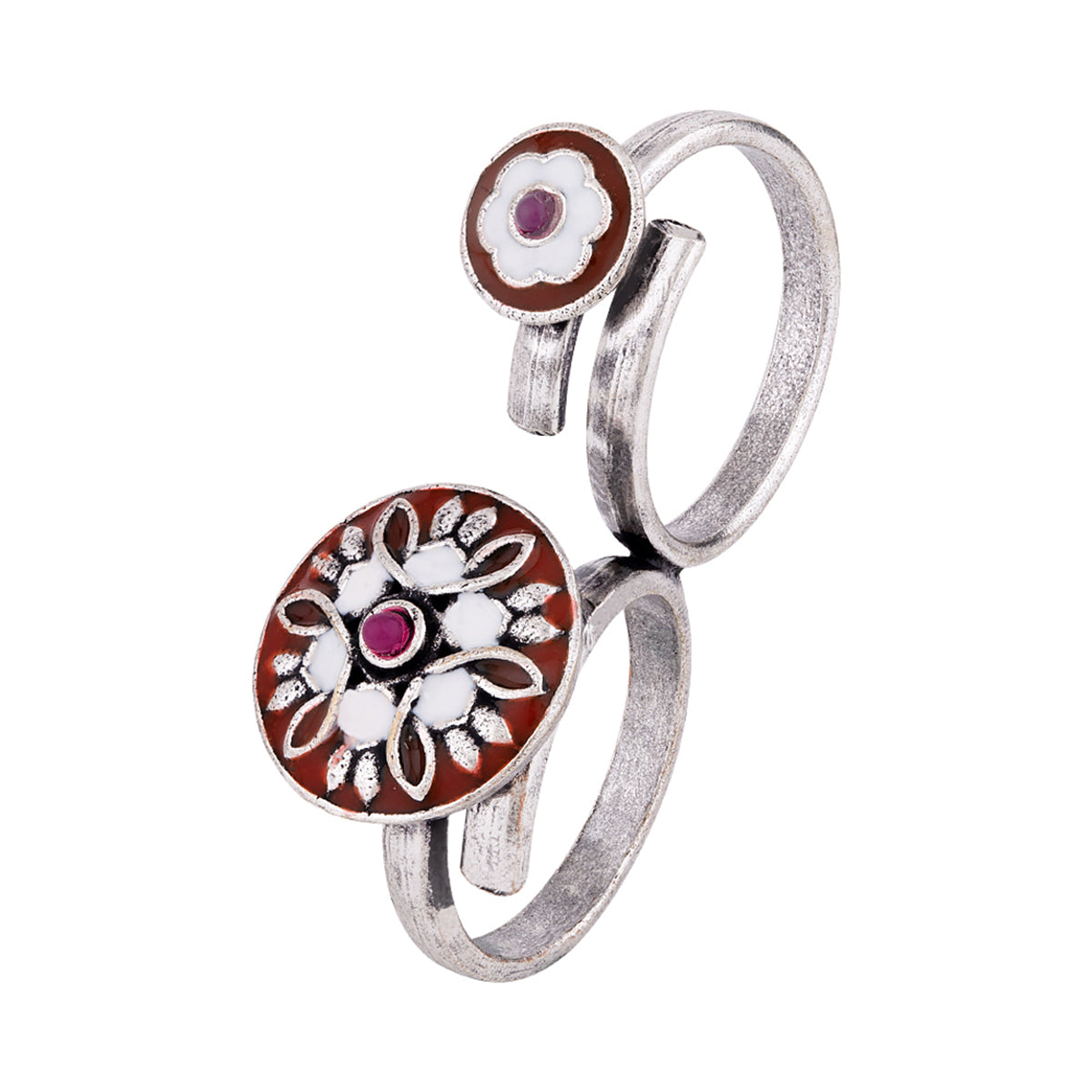 Dual finger ring made from brass and oxidised silver plated. Embossed with floral motifs and enameled. Wear with ethnic attire.