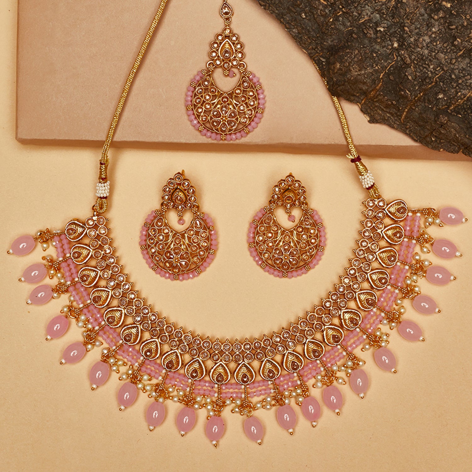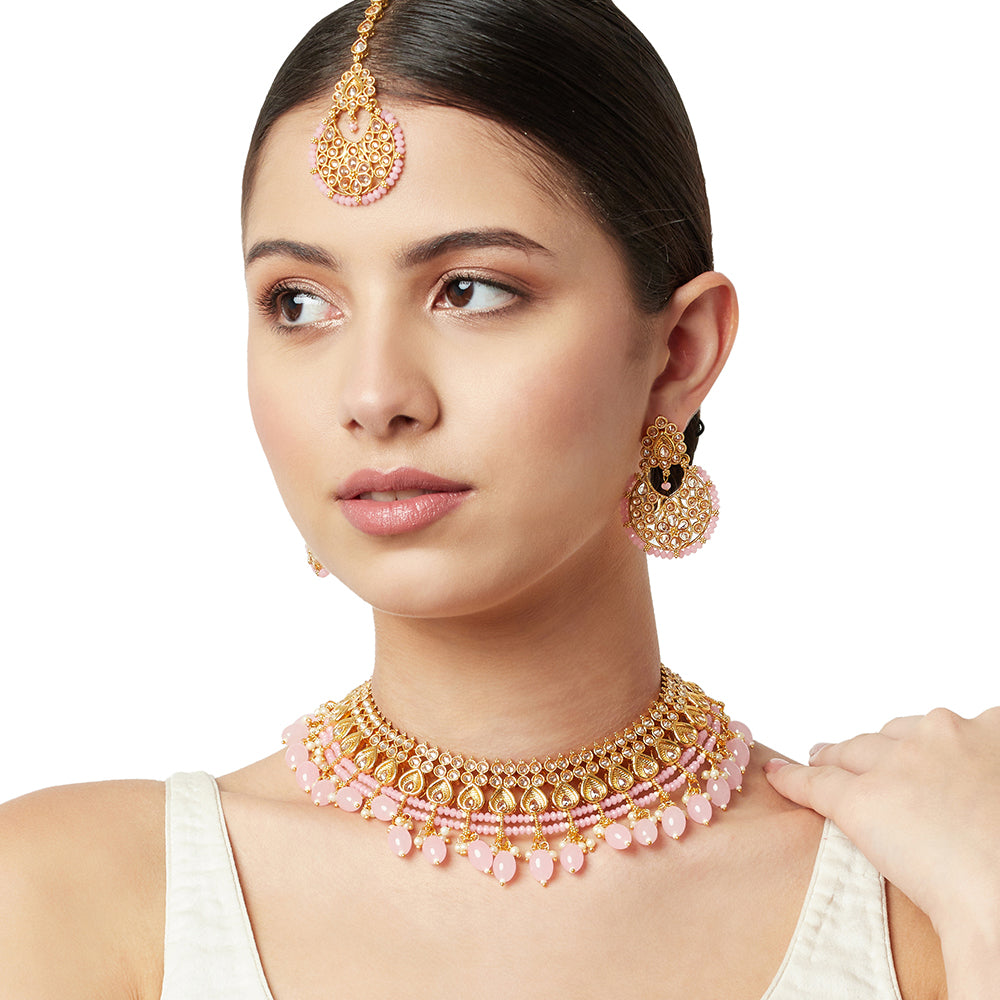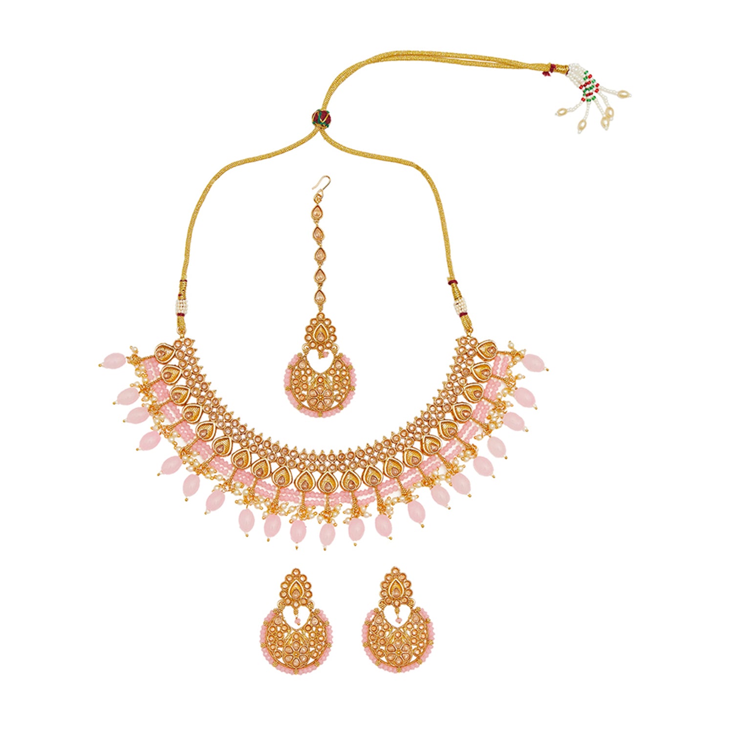 No matter whatever is the jewellery trend, traditional necklaces with mang tika sets are going to stay here. To make an everlasting collection of jewelry, this necklace from the gold oppulence collection is a must have. The dazzling gold finish with pink gemstones adds versatility and glamour. Alongside, the pair of earrings and beautifully curated tika are sufficient to complete the look for every event and occasion. Grab this forever beauty for upcoming festivities! This also makes the perfec jewel if you have opted on a subtle dress.