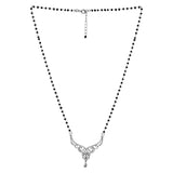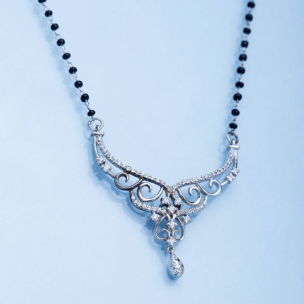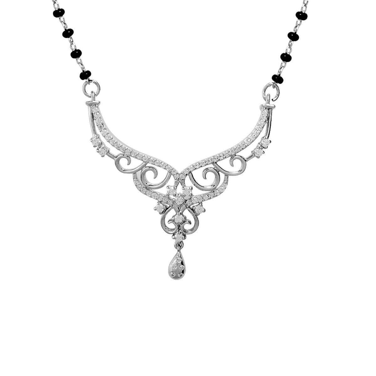 Get the perfect, Indian diva look by wearing this mangalsutra from the house of Voylla. Made from sterling silver, this mangalsutra has been embellished with American Diamond sparkling. You can wear this on an everyday basis to look feminine and avoid cluttering of jewelry.