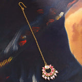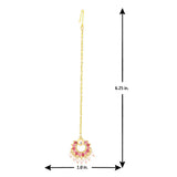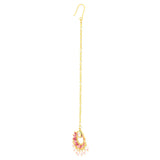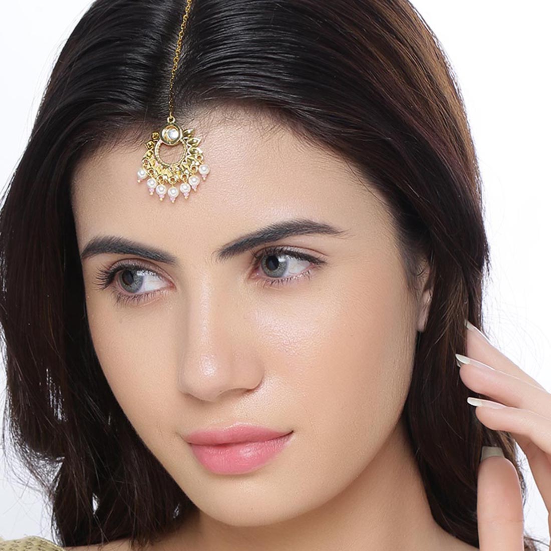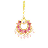 Floral style maang tika, inspired by the enigma and Indian symbolism of Radha and Krishna's love and longing. Made from brass and yellow gold plated. The enameled tika has been embellished with faux pearls and kundan gems. Pair with formal ethnic attire. This piece of jewelry comes with the Voylla assurance of quality and durability.