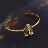 The graceful Indian symbols of Radha and Krishna's love have inspired this peacock dance bracelet, which has been crafted from brass. Enameled and lightly embellished, the yellow gold plated bracelet is a good match for formal ethnic wear.
