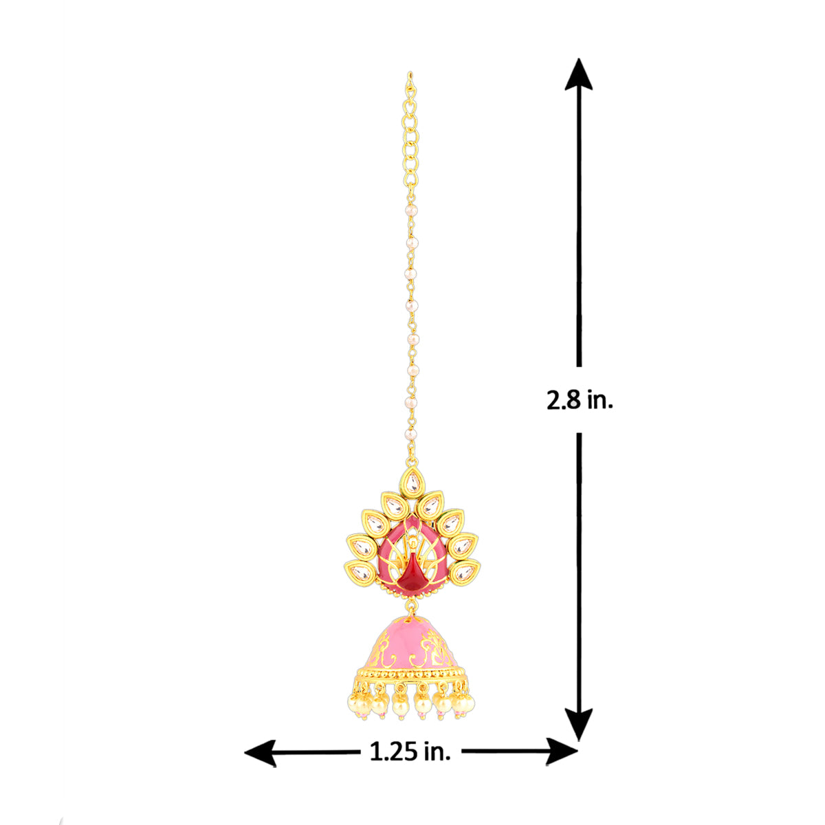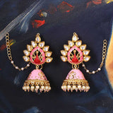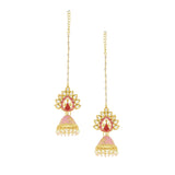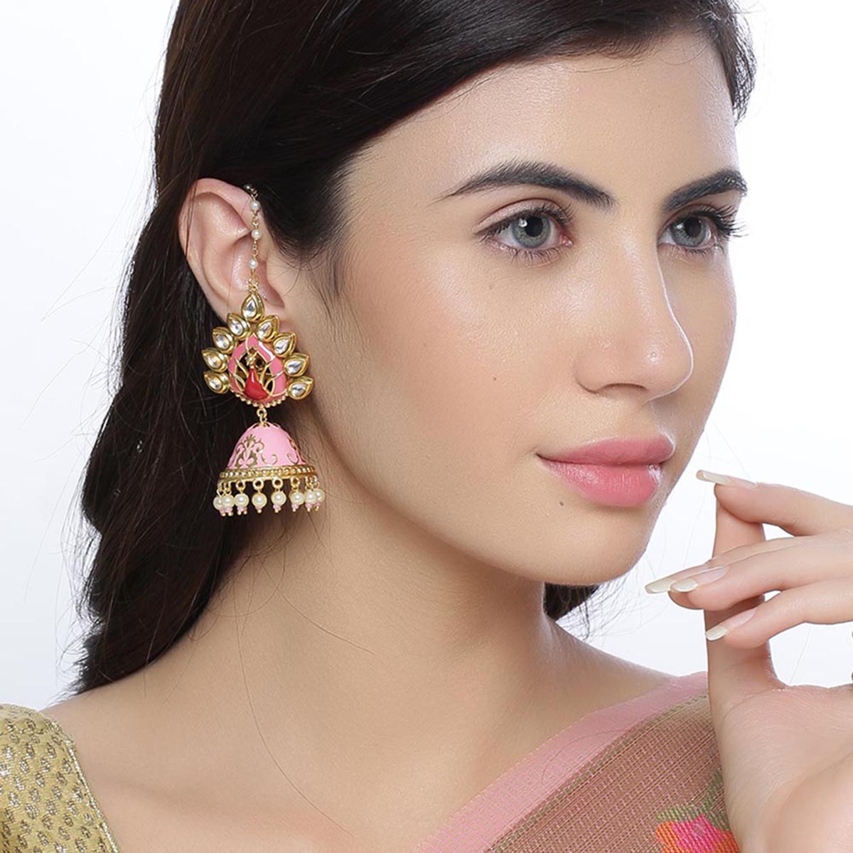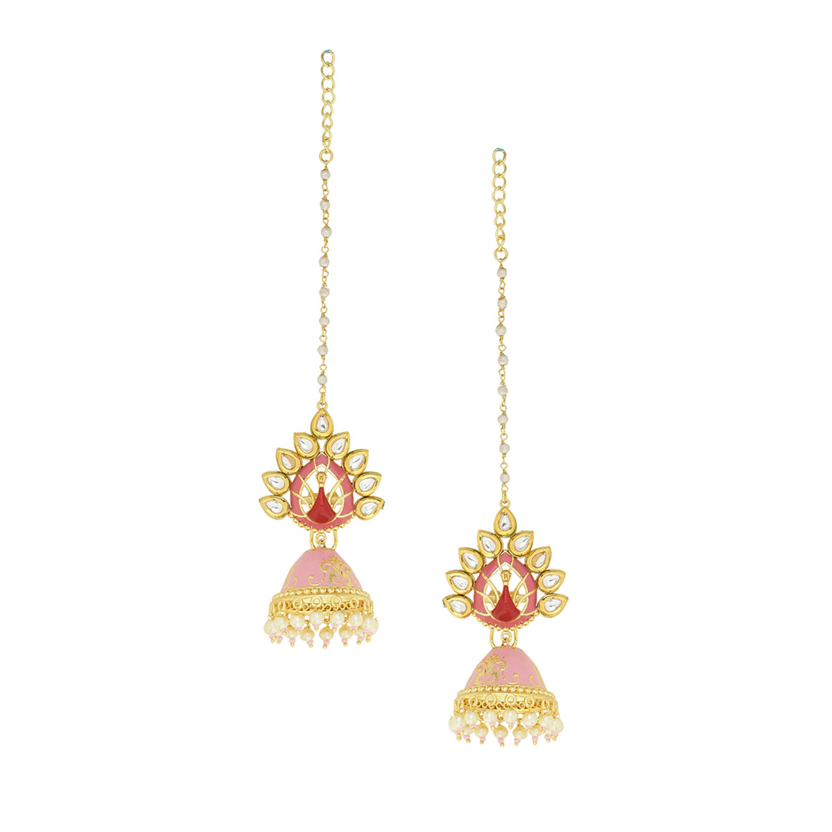 Peacock motif adorned jhumka drop earrings, inspired by the symbolism of Radha and Krishna's love, which embodies the Indian soul. The enameled pair has been embellished with faux pearls and kundan gems. Made from brass and yellow gold plated, the pair is a perfect match for ethnic looks of all kinds.