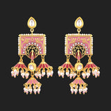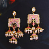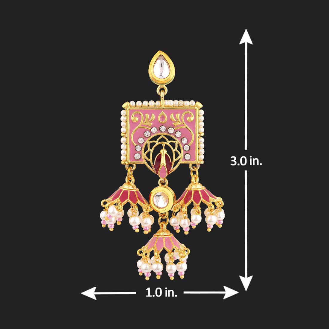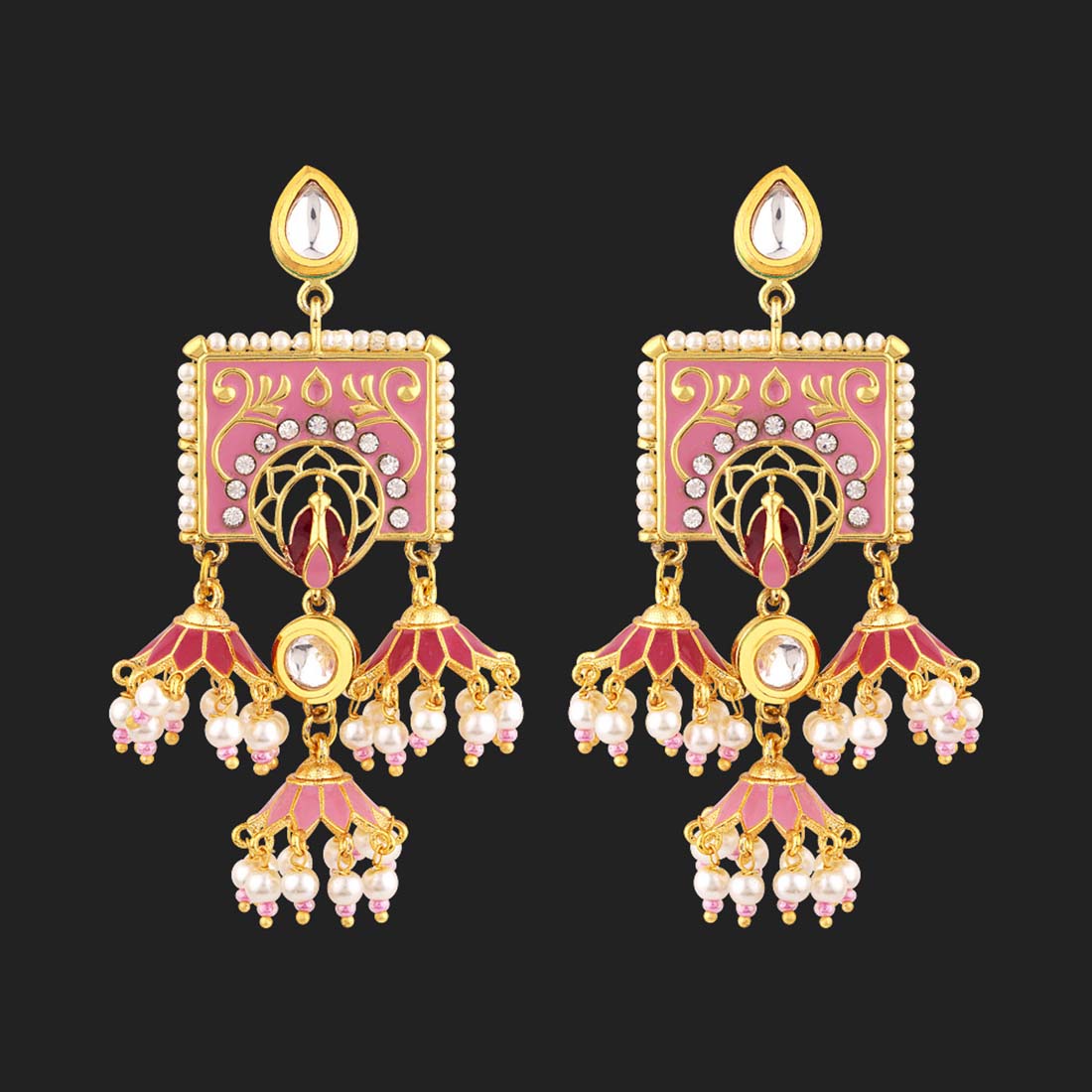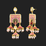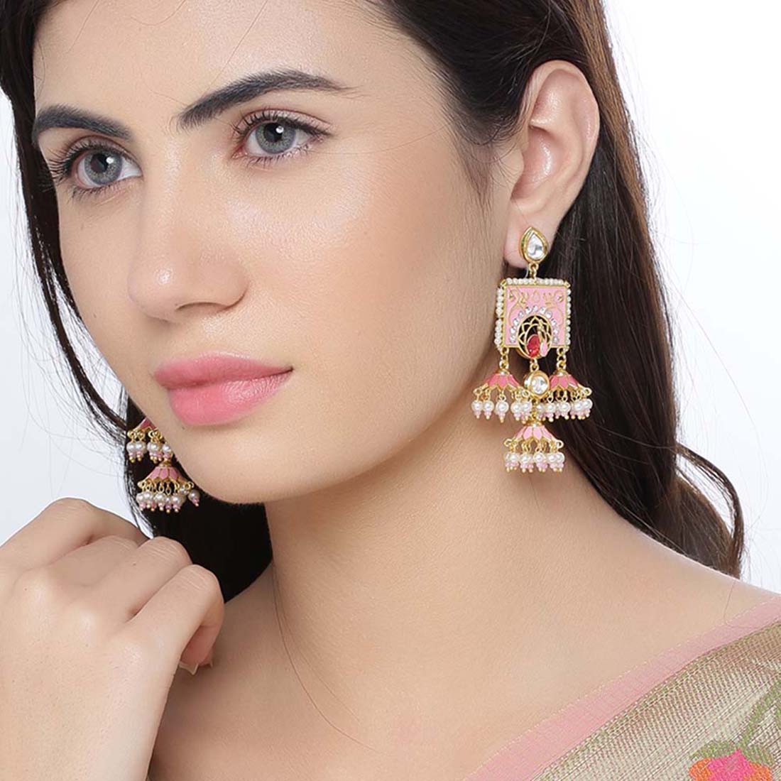 Embellished with faux pearls and kundan gems, these jhumka drop earrings have been inspired by the enigmatic love and longing of Radha and Krishna. Brass has been used in the making of this yellow gold plated enameled earrings, which will look splendid with formal ethnic attire. This piece of jewelry comes with the Voylla assurance of quality and durability. Caring for your fashion jewelry: We, at Voylla, take care of every piece of jewelry so that you don't spend hours caring for them.