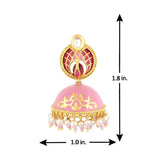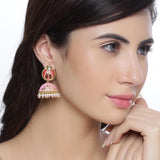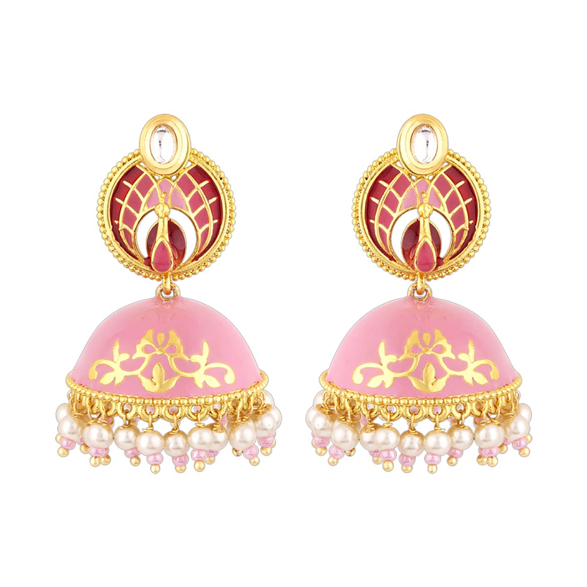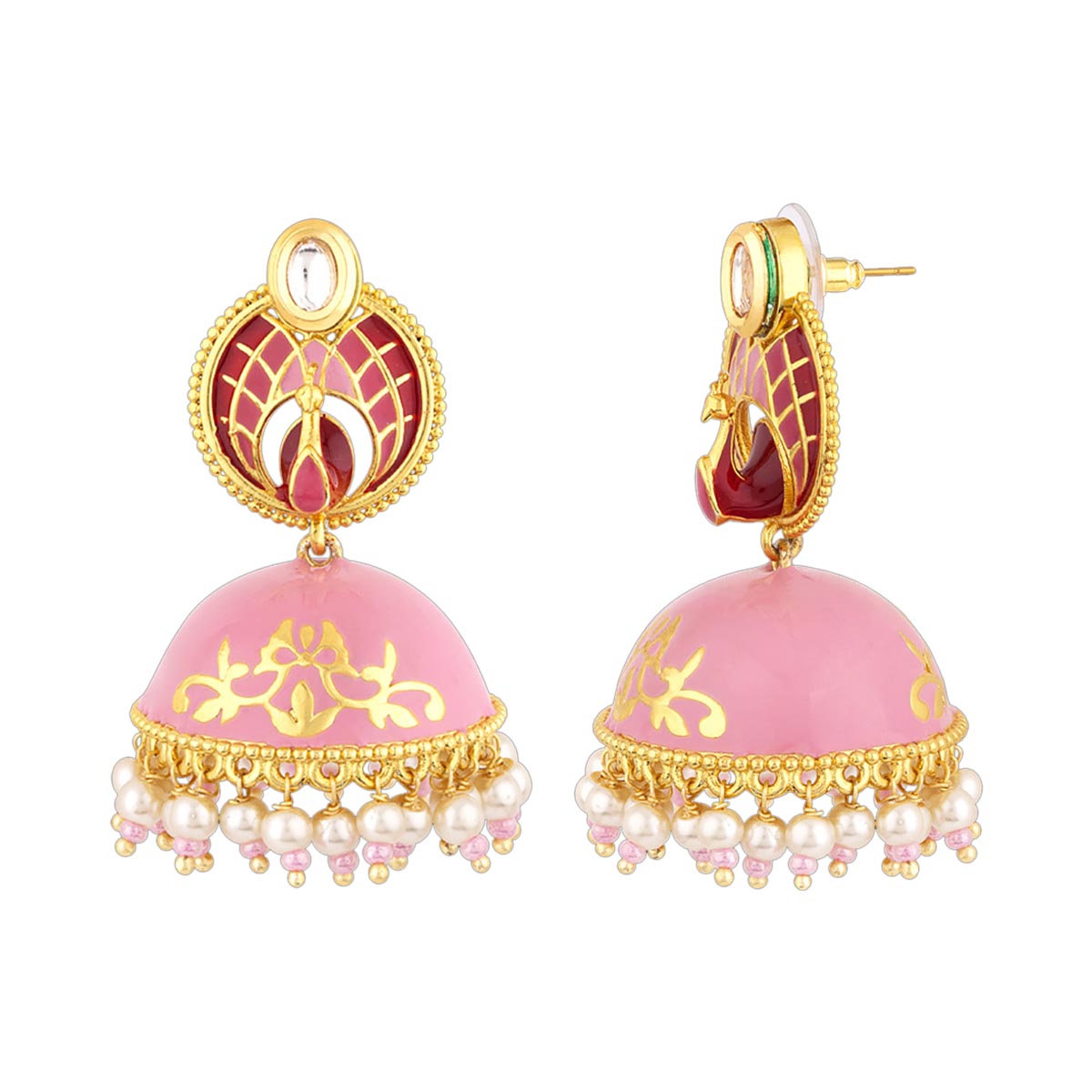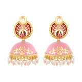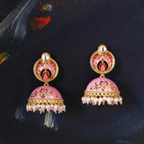Traditional jhumka drop earrings inspired by the enigmatic symbolism of Radha and Krishna's love and longing. Made from brass and yellow gold plated, the pair has been embellished with faux pearls and kundan gems. The enameled pair can be worn with formal and casual ethnic attire.