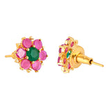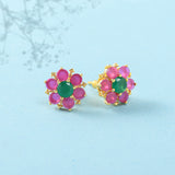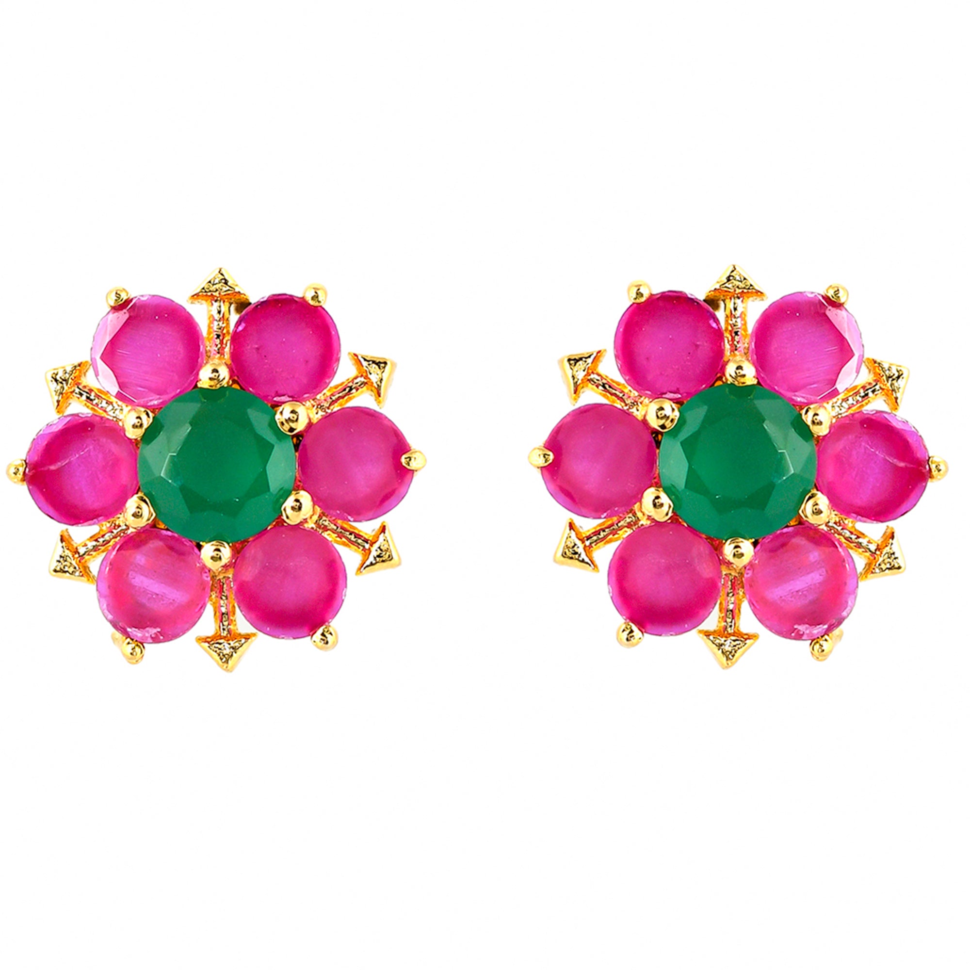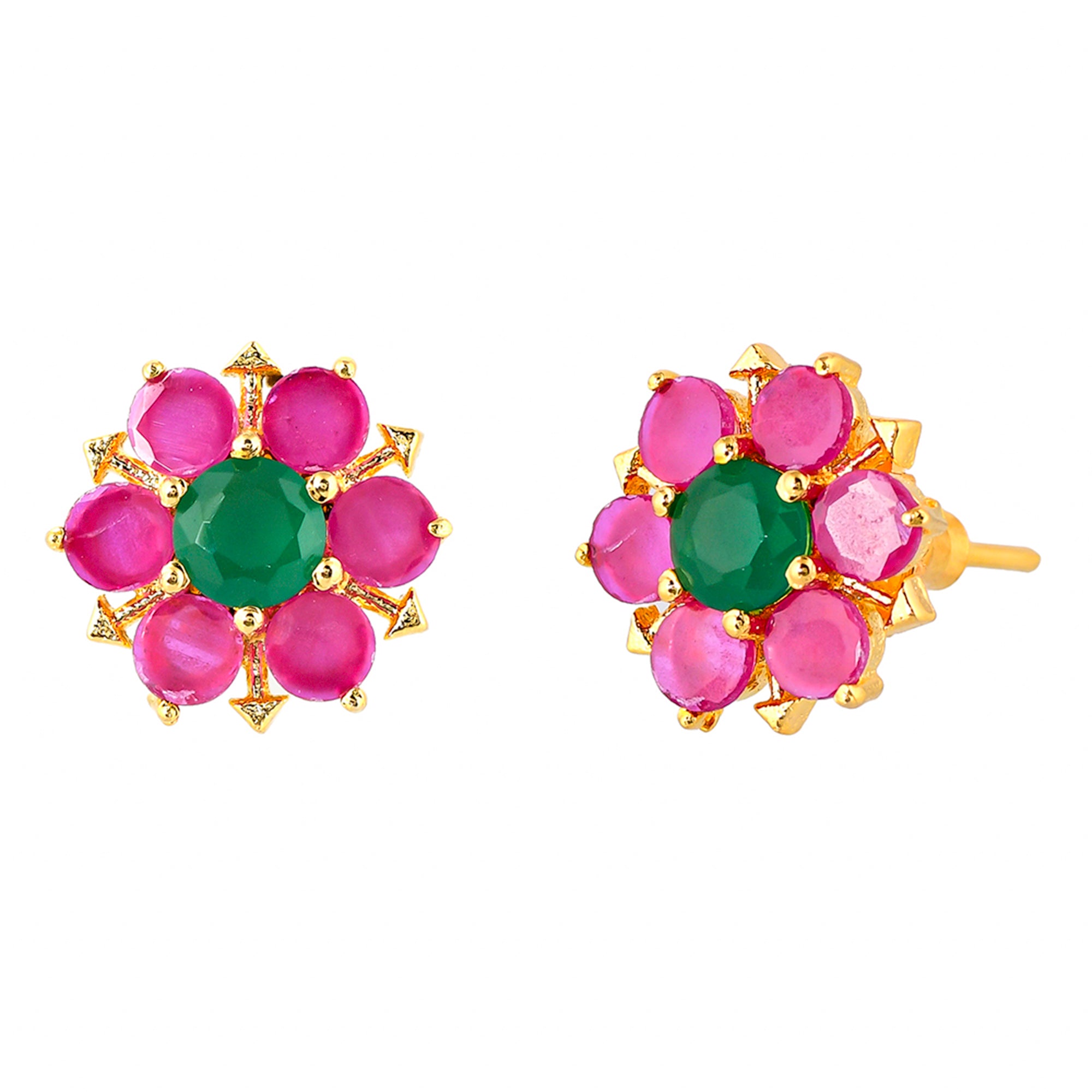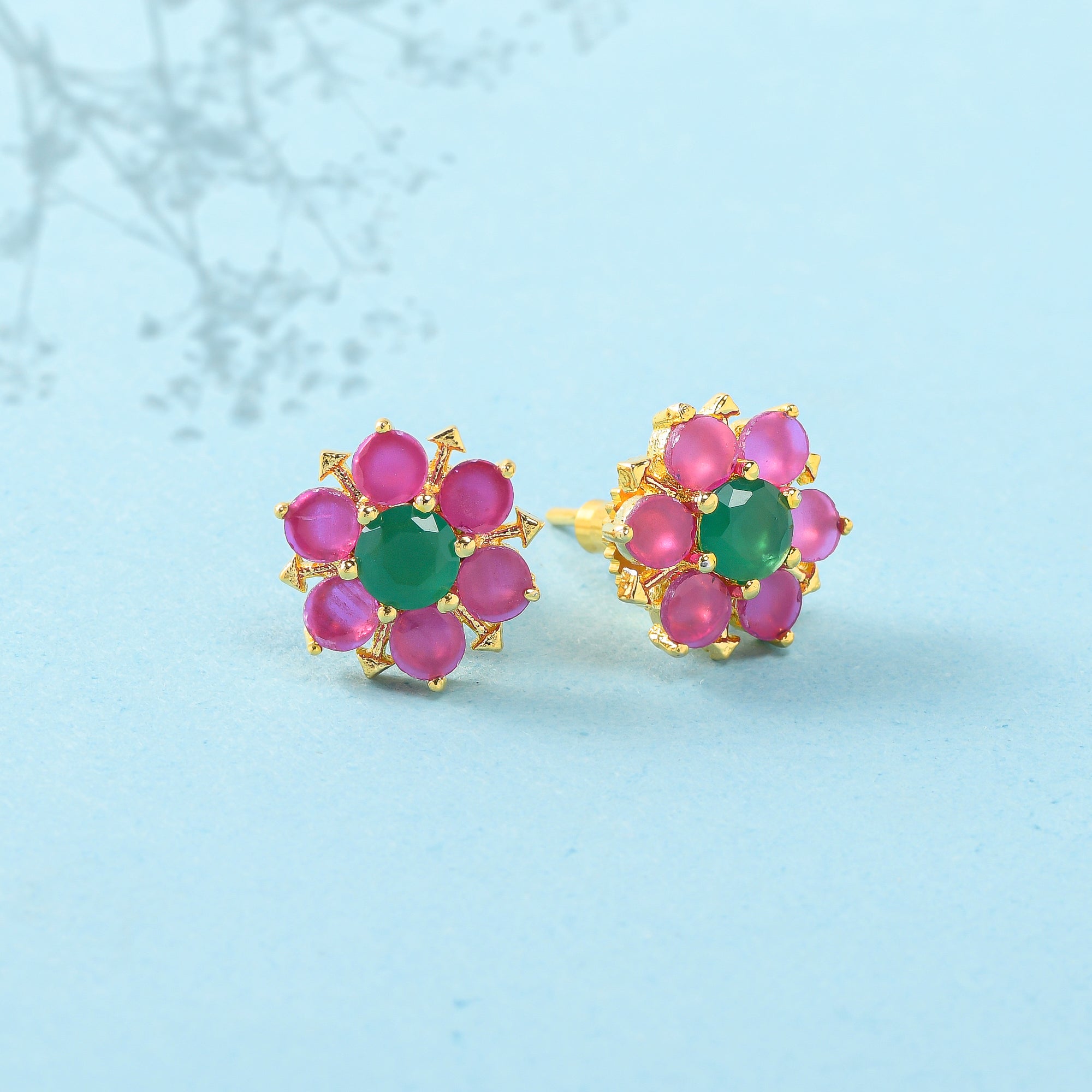 Pink and green, marquise and round cut CZ gems brass stud earrings with gold plating. Pair with everyday looks.
