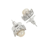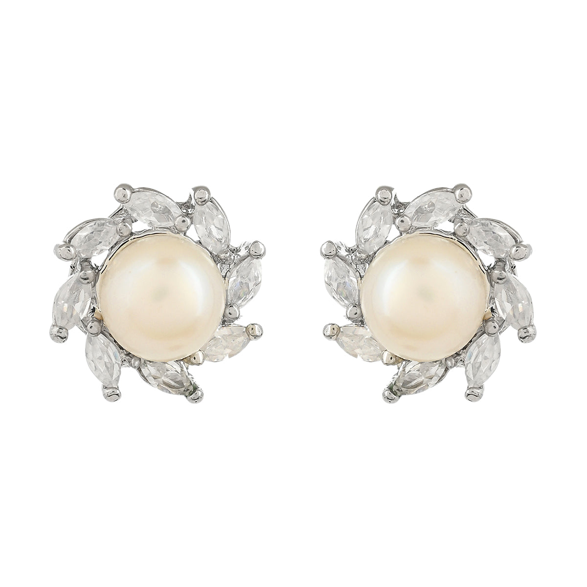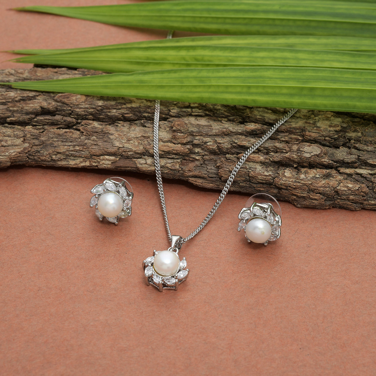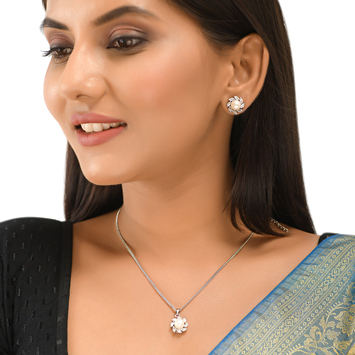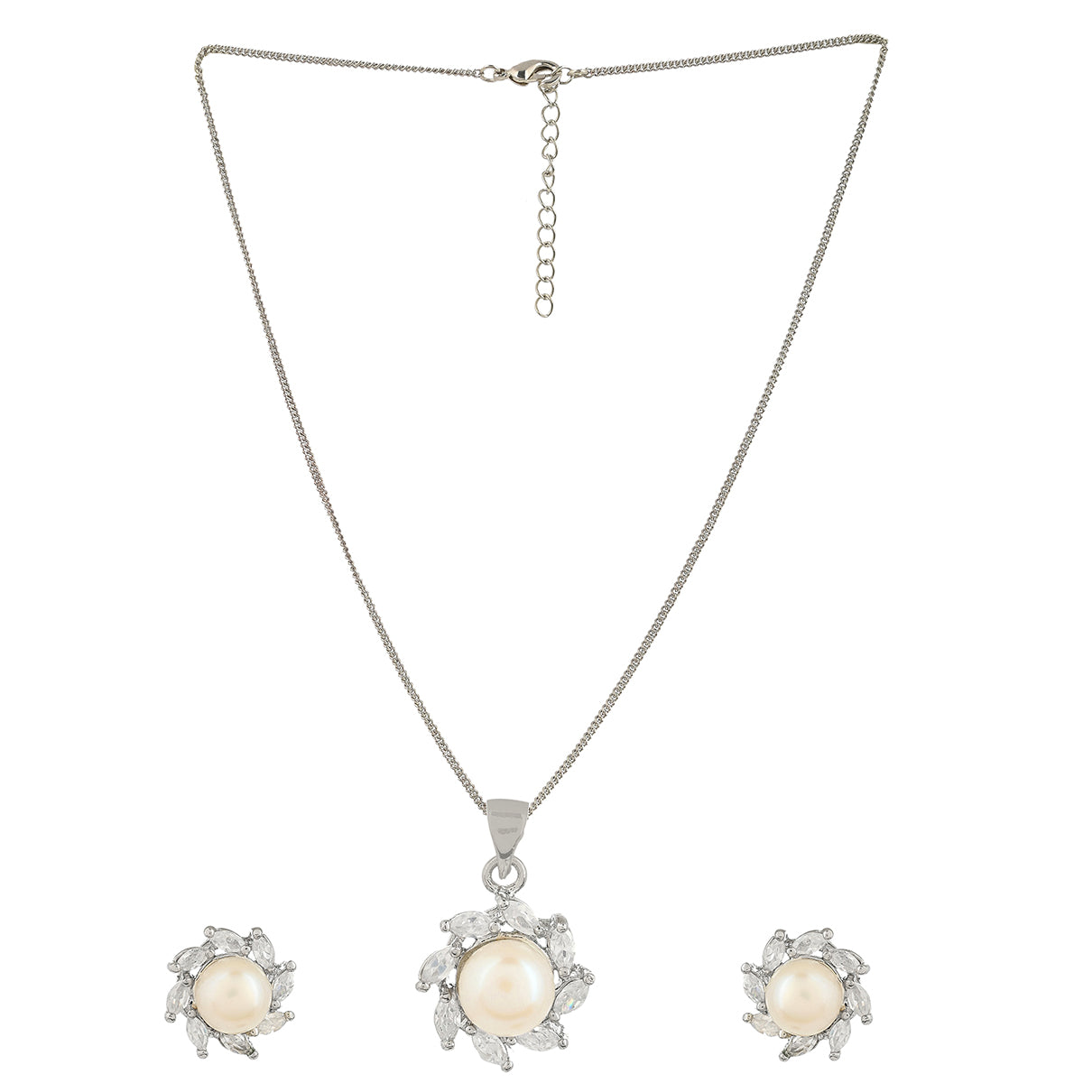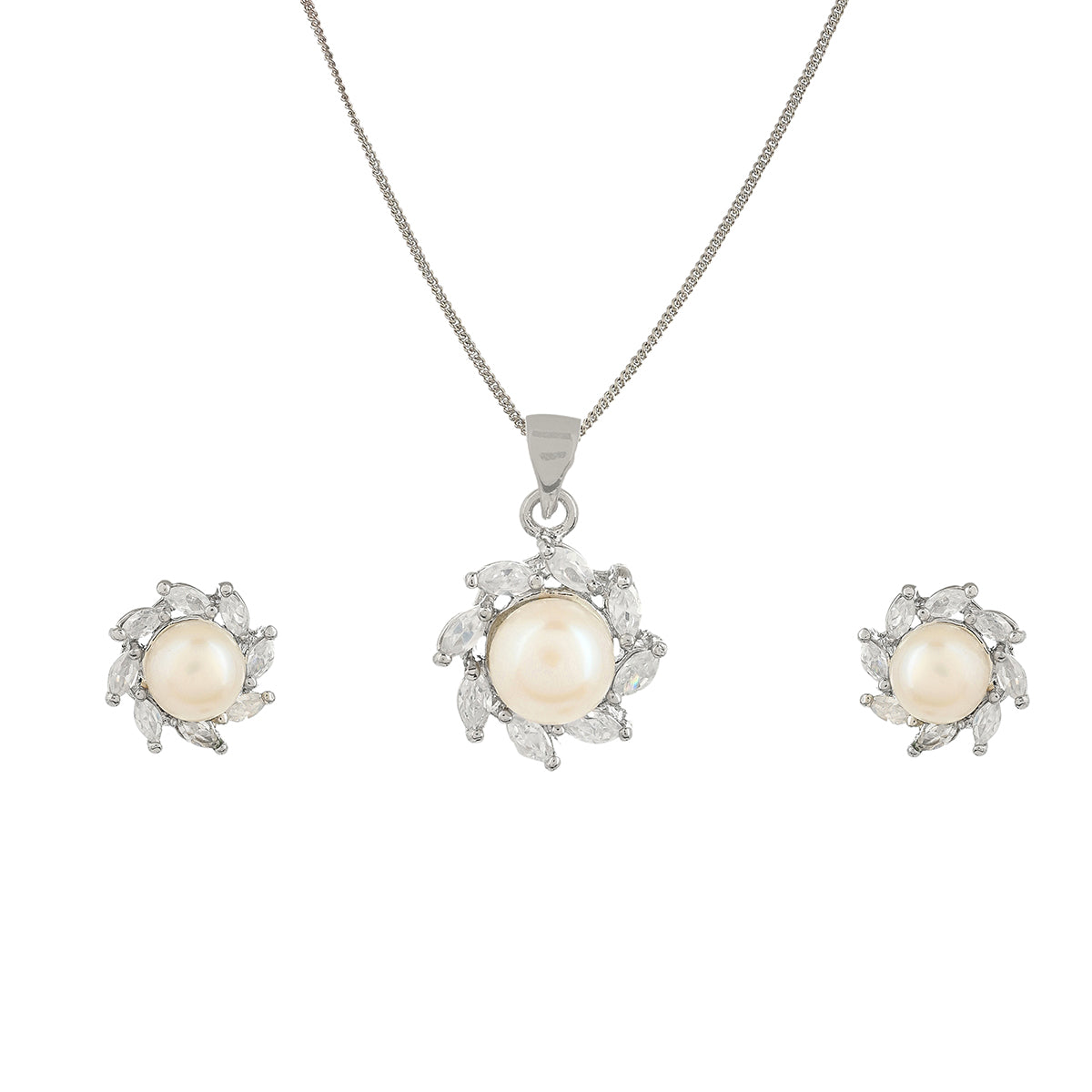 Brass pendant set, featuring a lovely silver plating that adds to its charm. The stud earrings and pendant have been embellished with faux pearls and marquise cut zircon gems. The set is a perfect match for casual, formal and semi