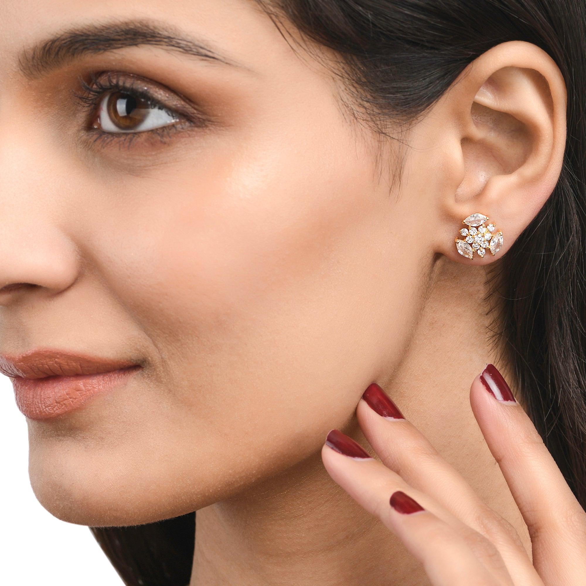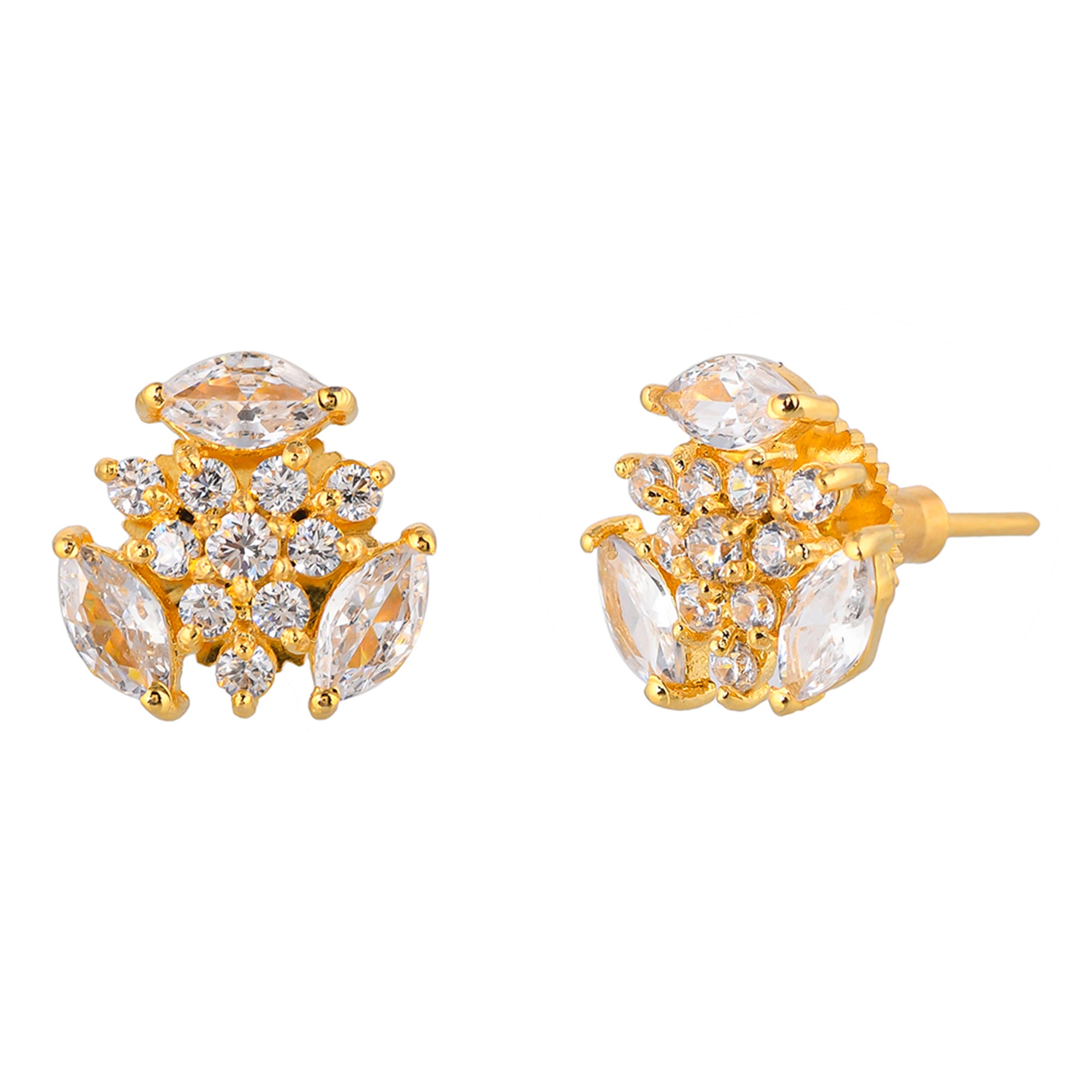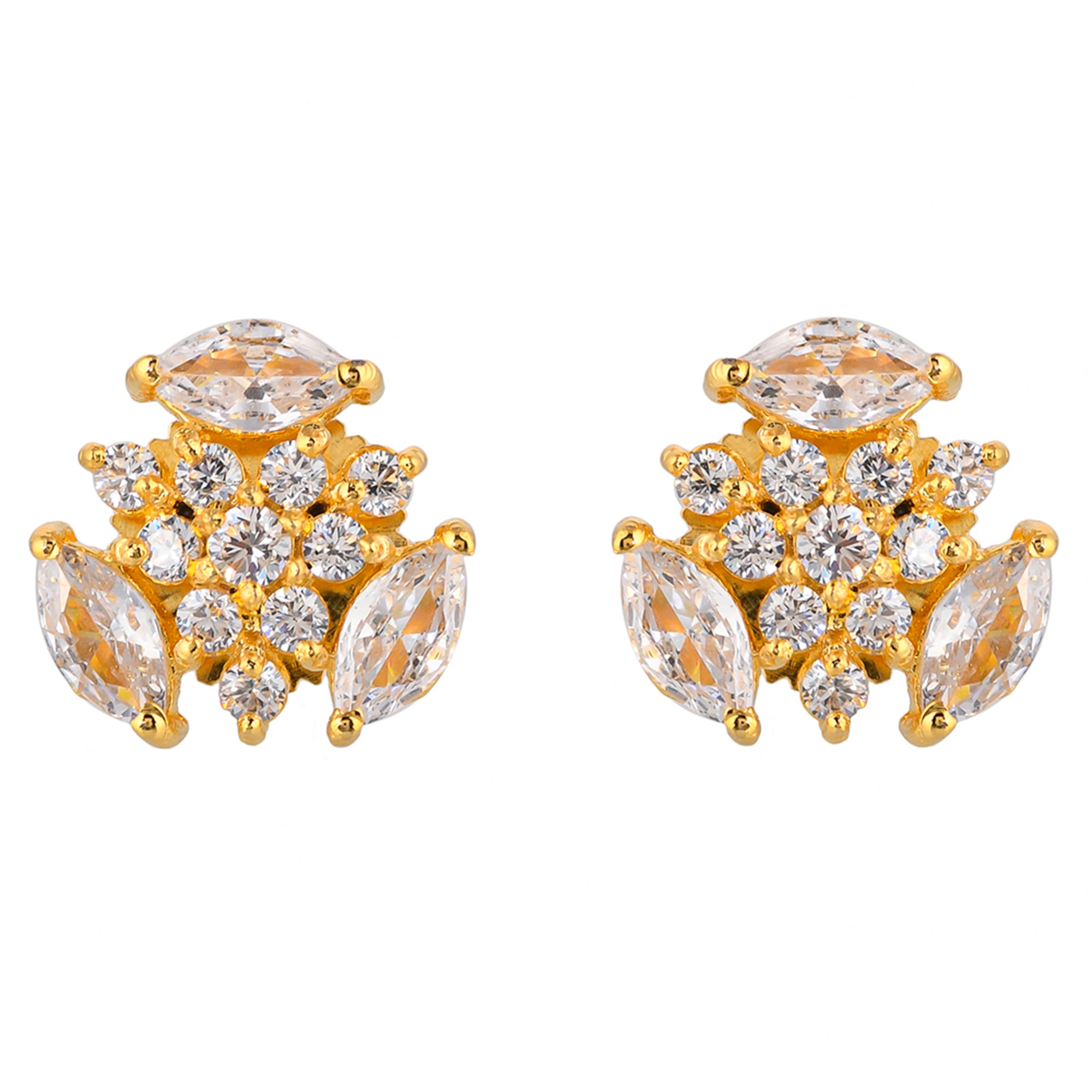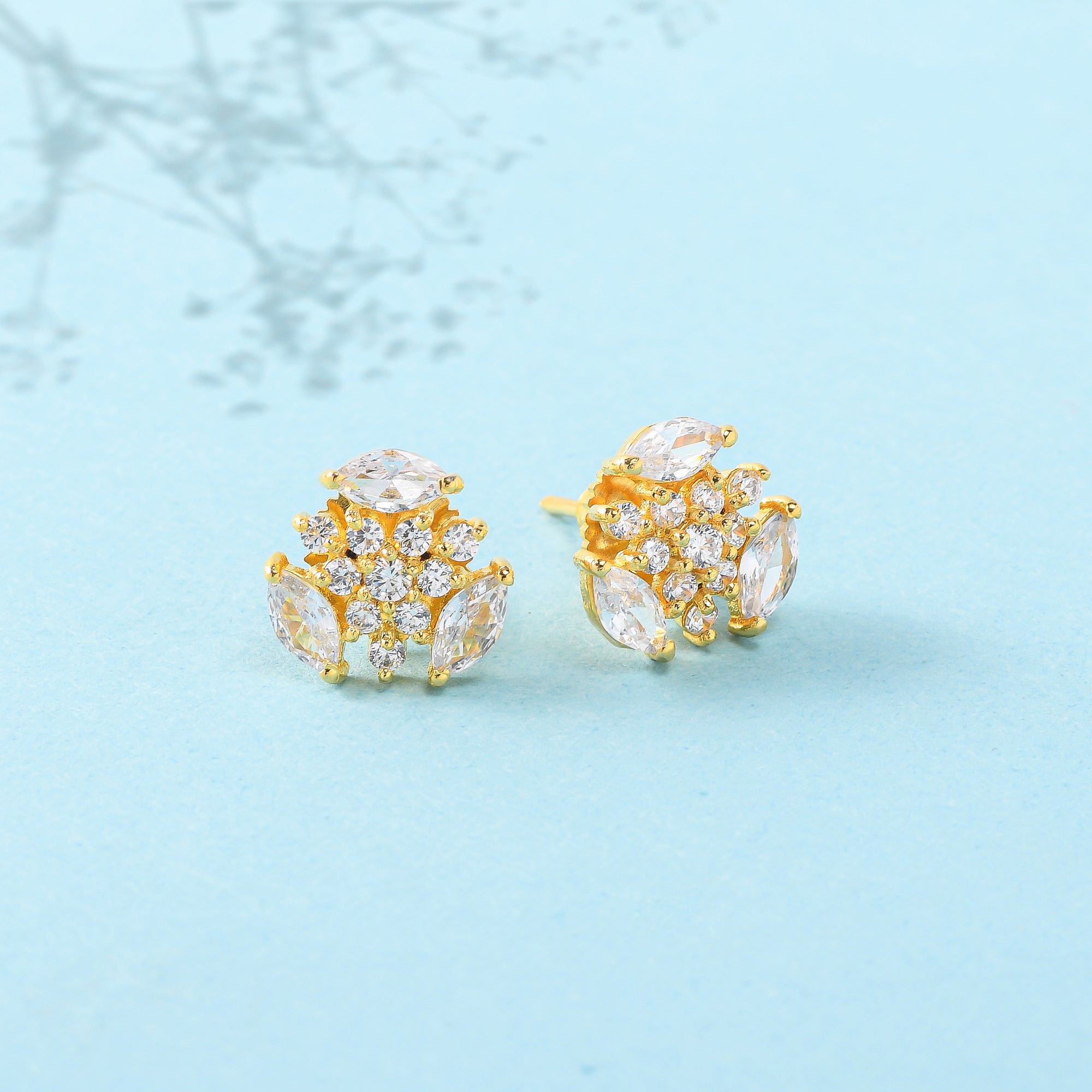 Marquise cut white zirconia gemstones stud earrings with classic gold plating. Fashioned out of brass. Lightweight, comfortable and versatile.