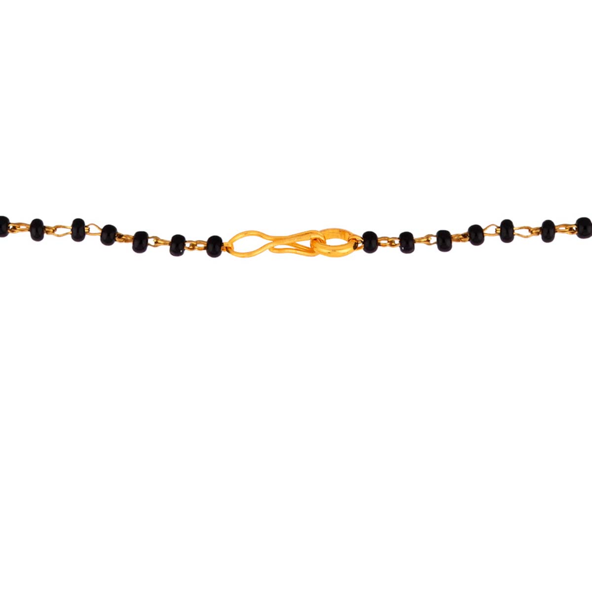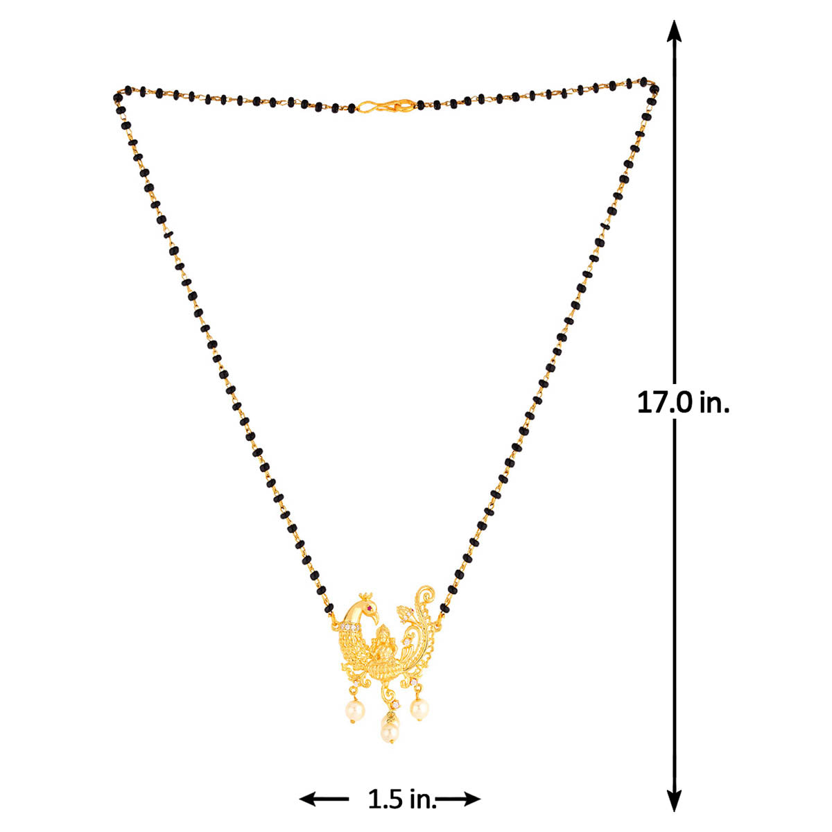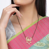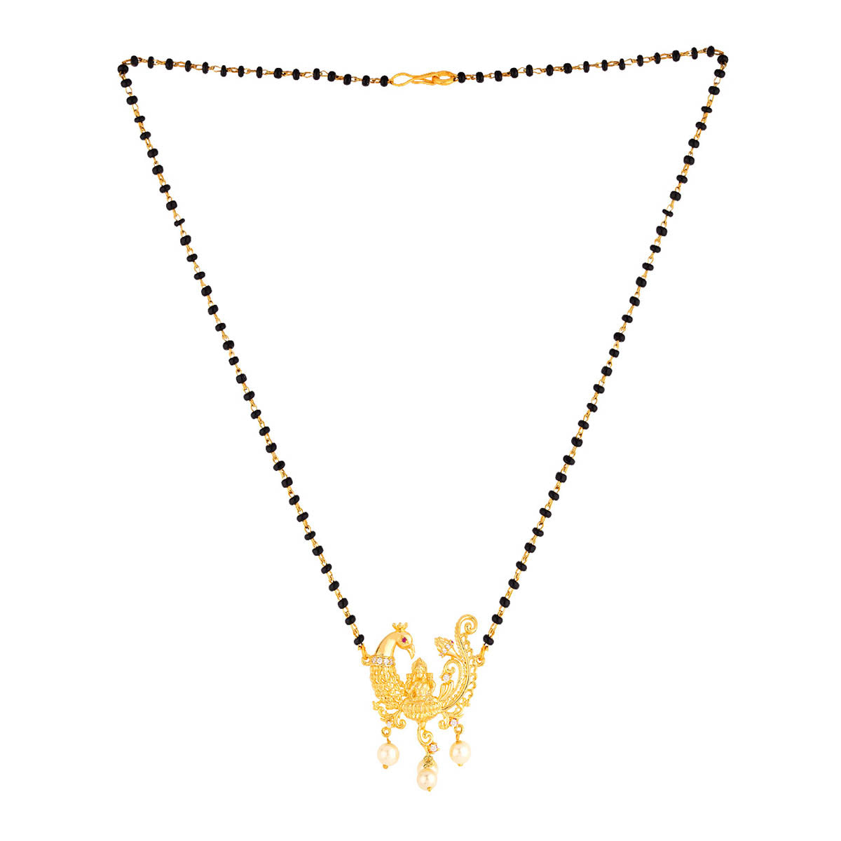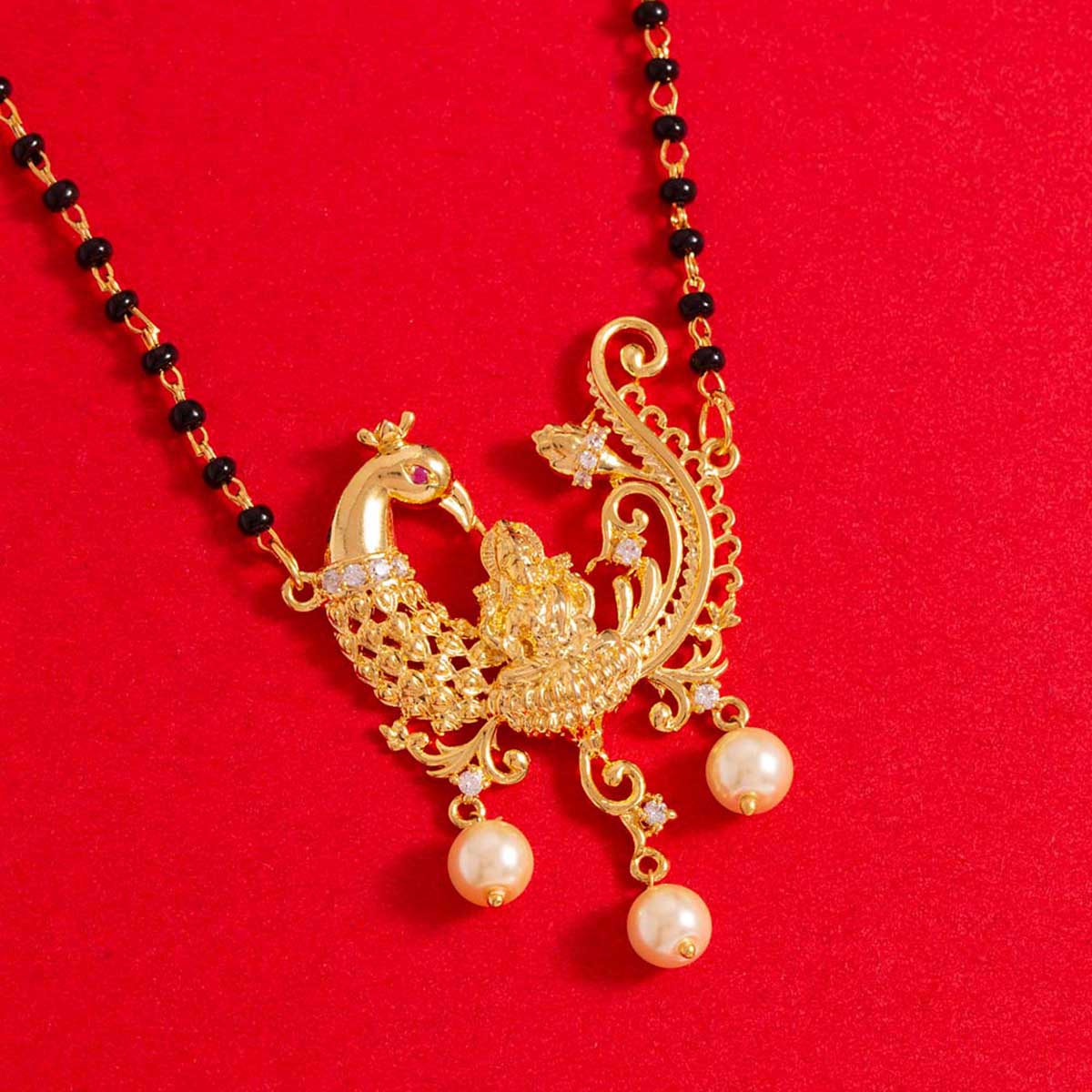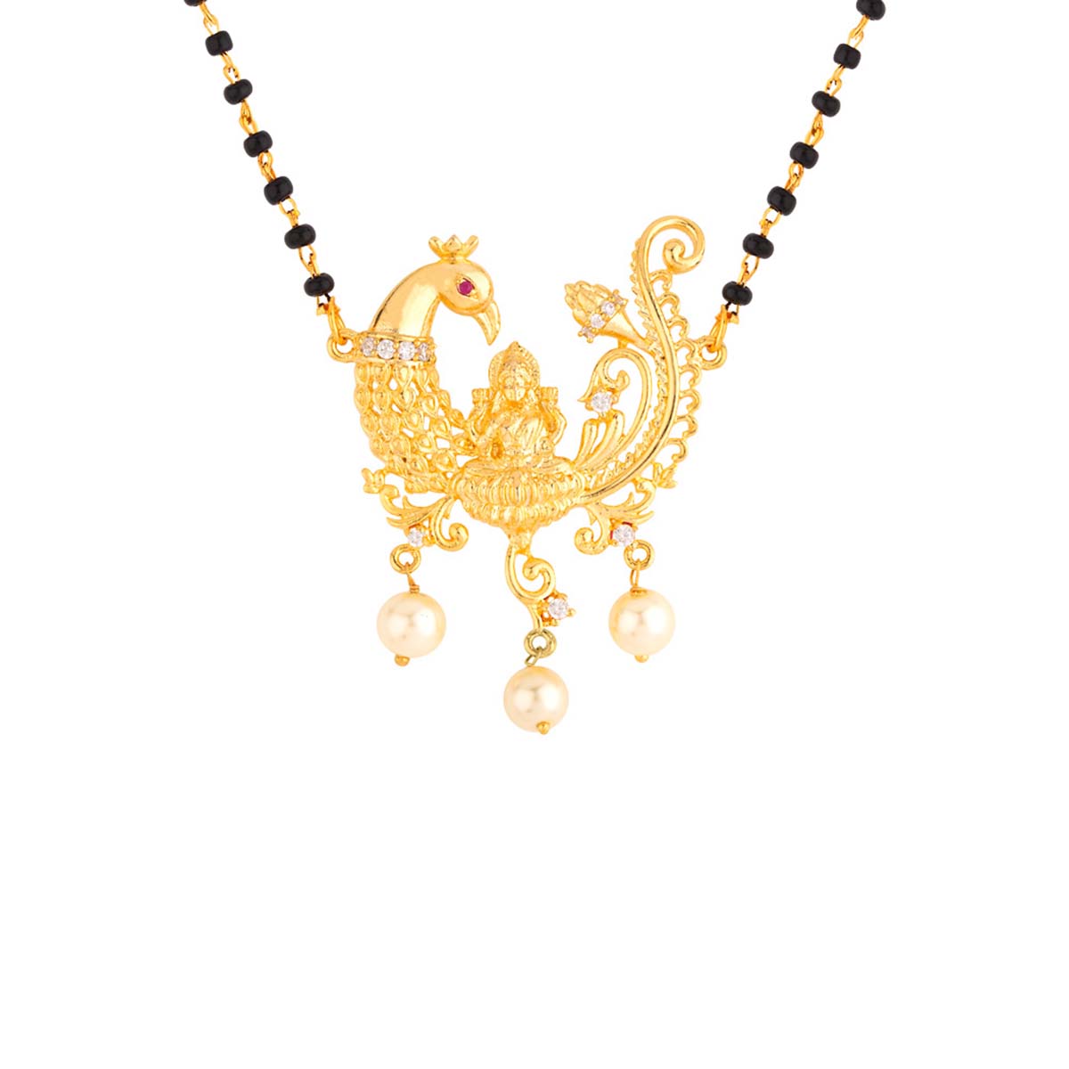 Gems and faux pearls adorned goddess motif brass mangalsutra. Yellow gold plated. Good for formal ethnic looks.