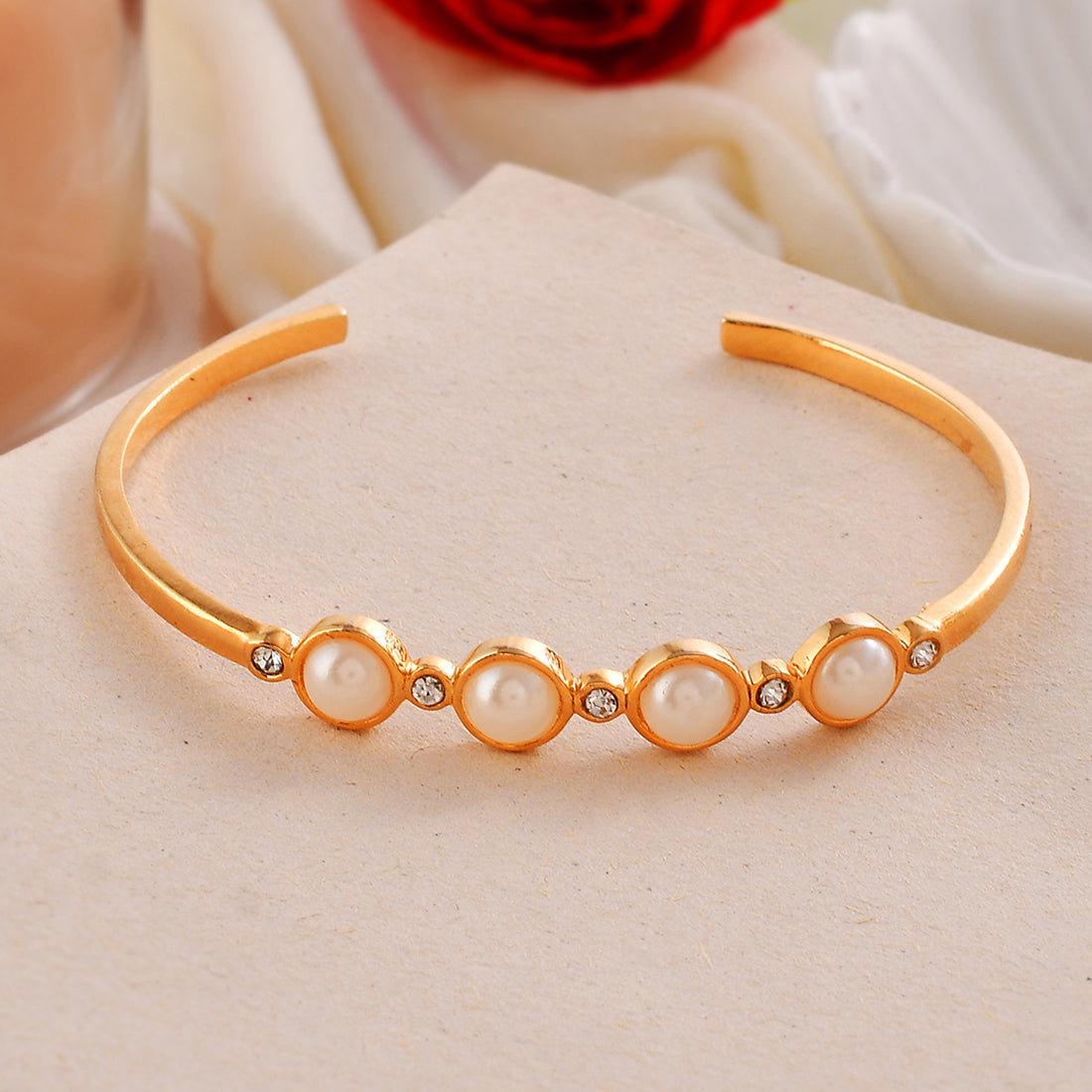 Add some sparkle to your mother's wrist with this beautiful Half Pearl and CZ Studded Cuff Bracelet from our Mothers Day Collection. The bracelet features a stunning combination of CZ stones and half pearls, set in a beautiful pattern, making it a perfect addition to any outfit. The adjustable cuff design ensures a comfortable fit for all wrist sizes.