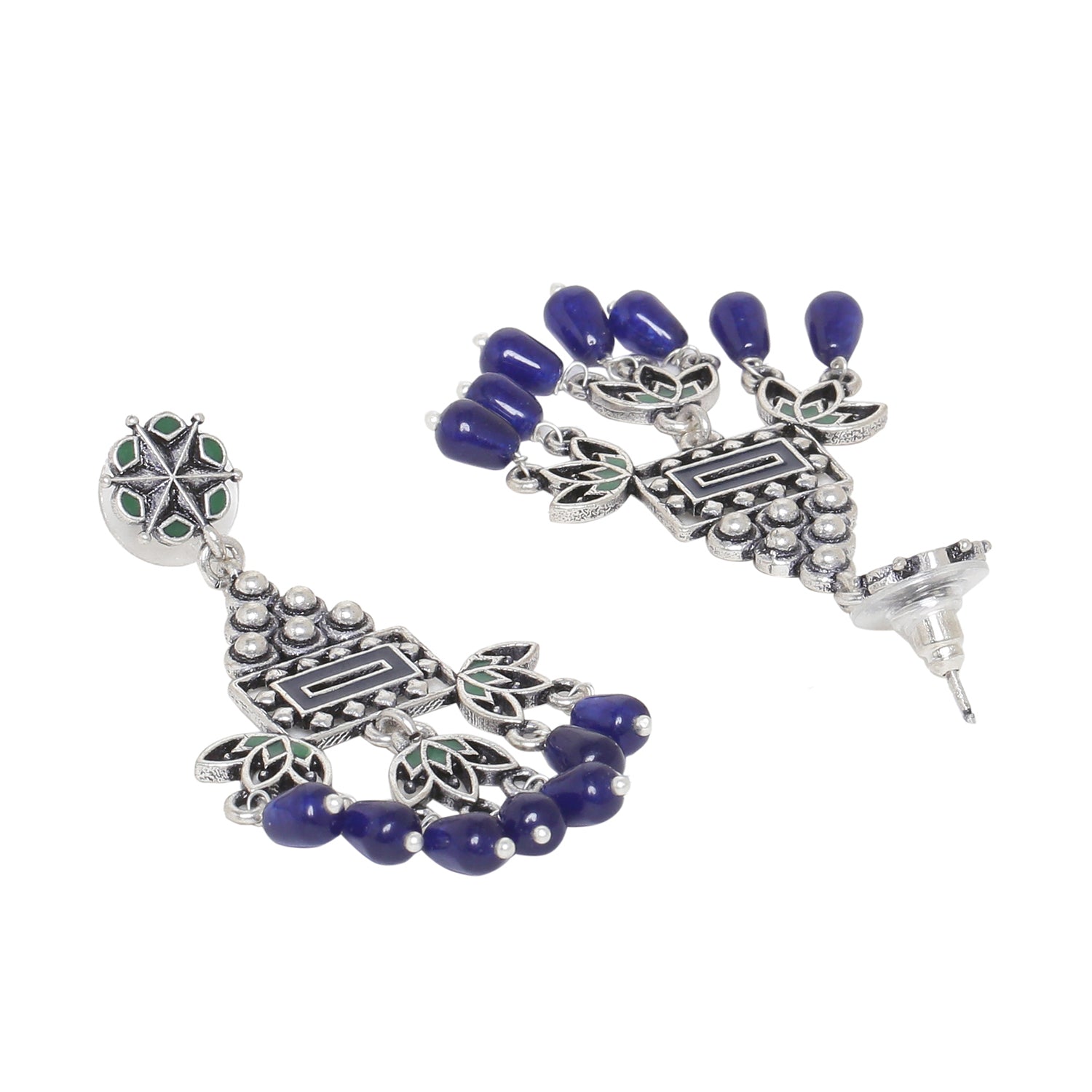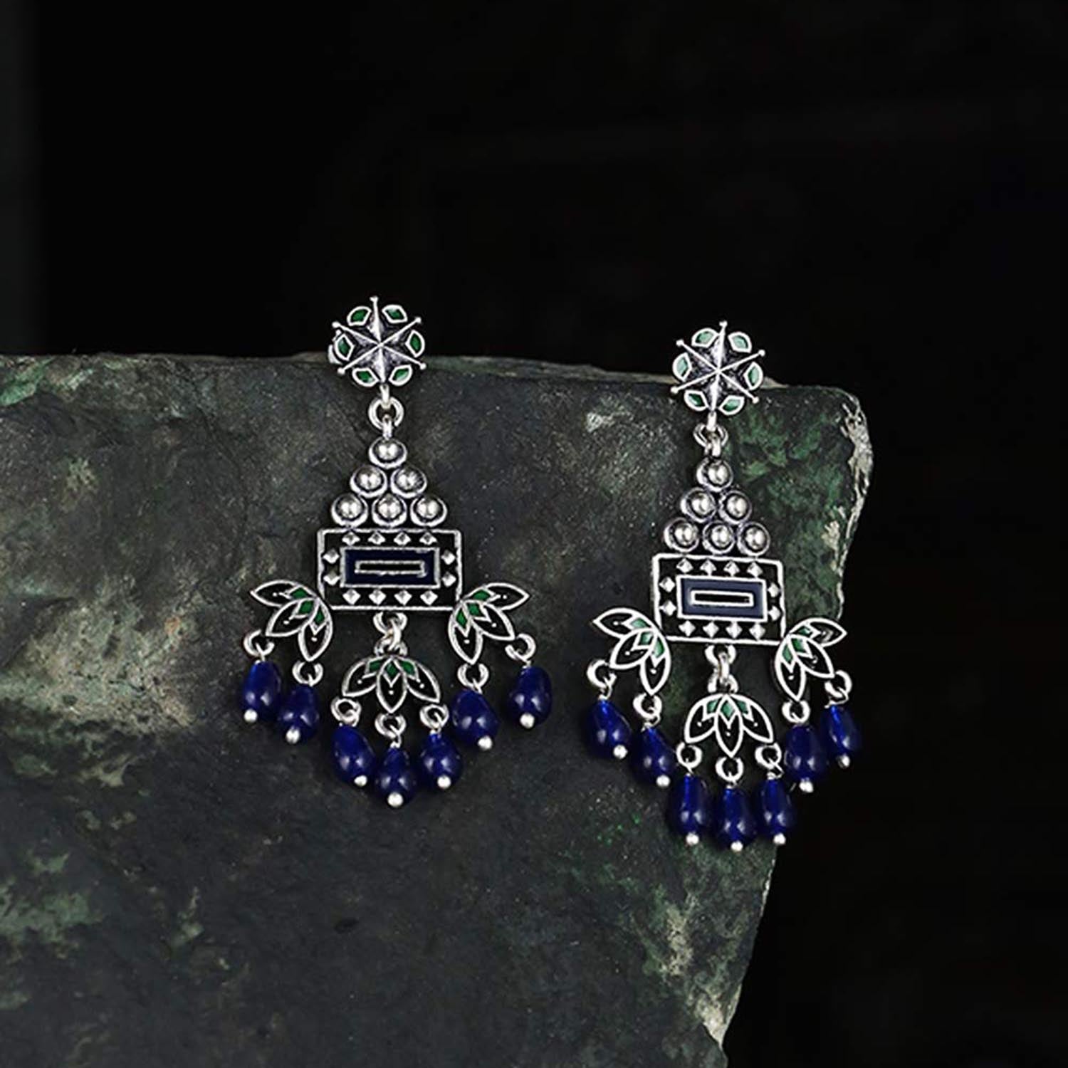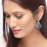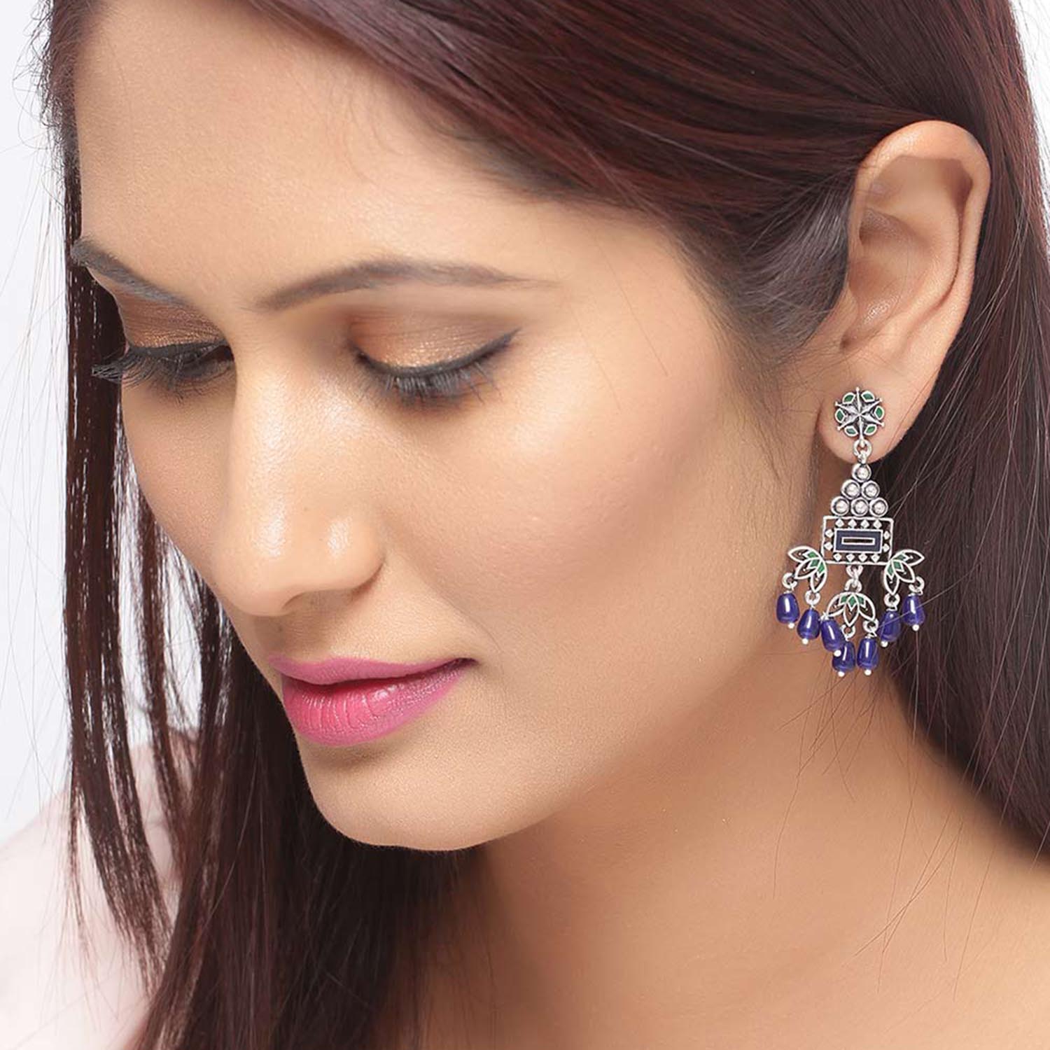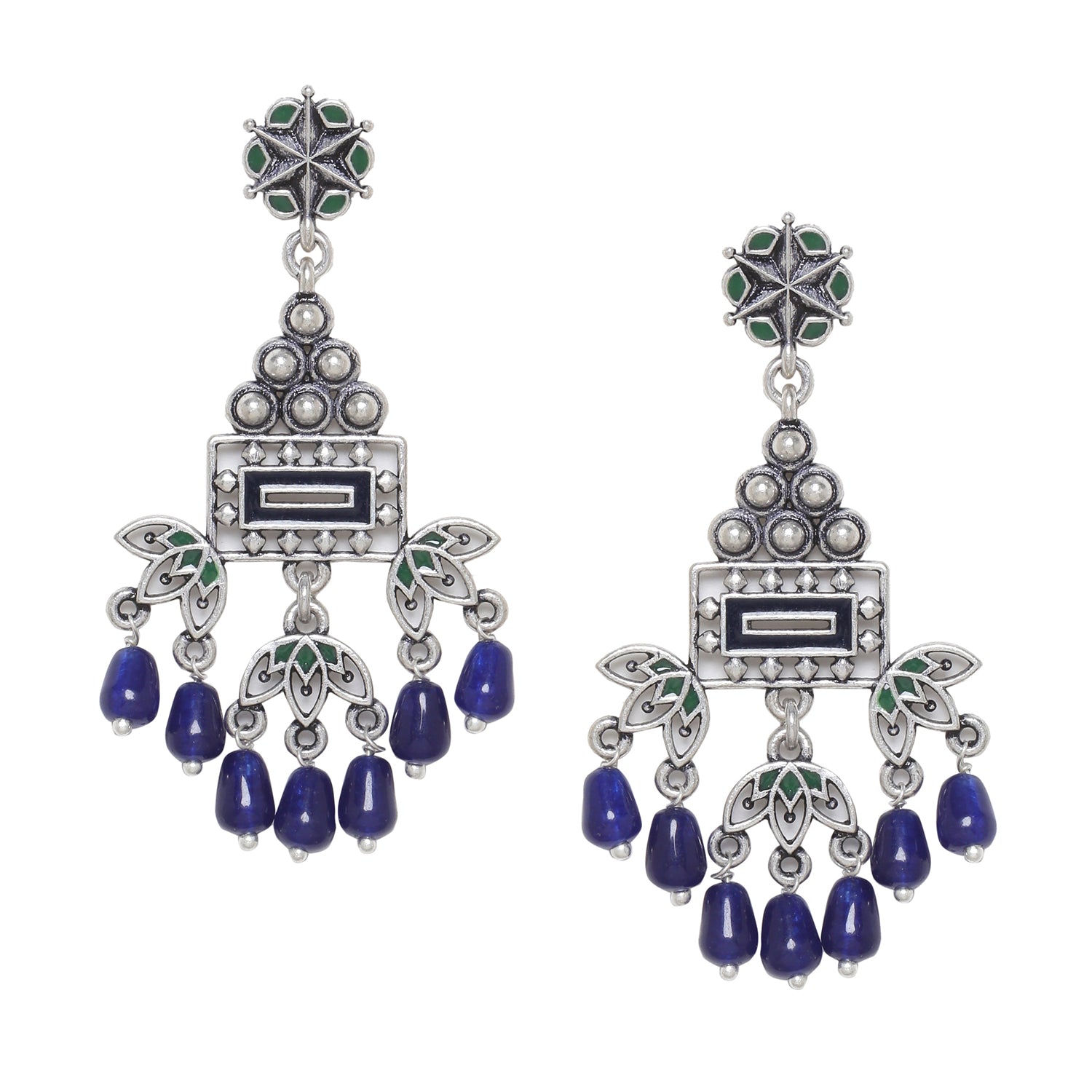 Floral motifs adorned drop earrings inspired by traditional Mughal jewelry designs and the beauty of nature. Made from brass and oxidized silver plated. Good for ethnic looks.