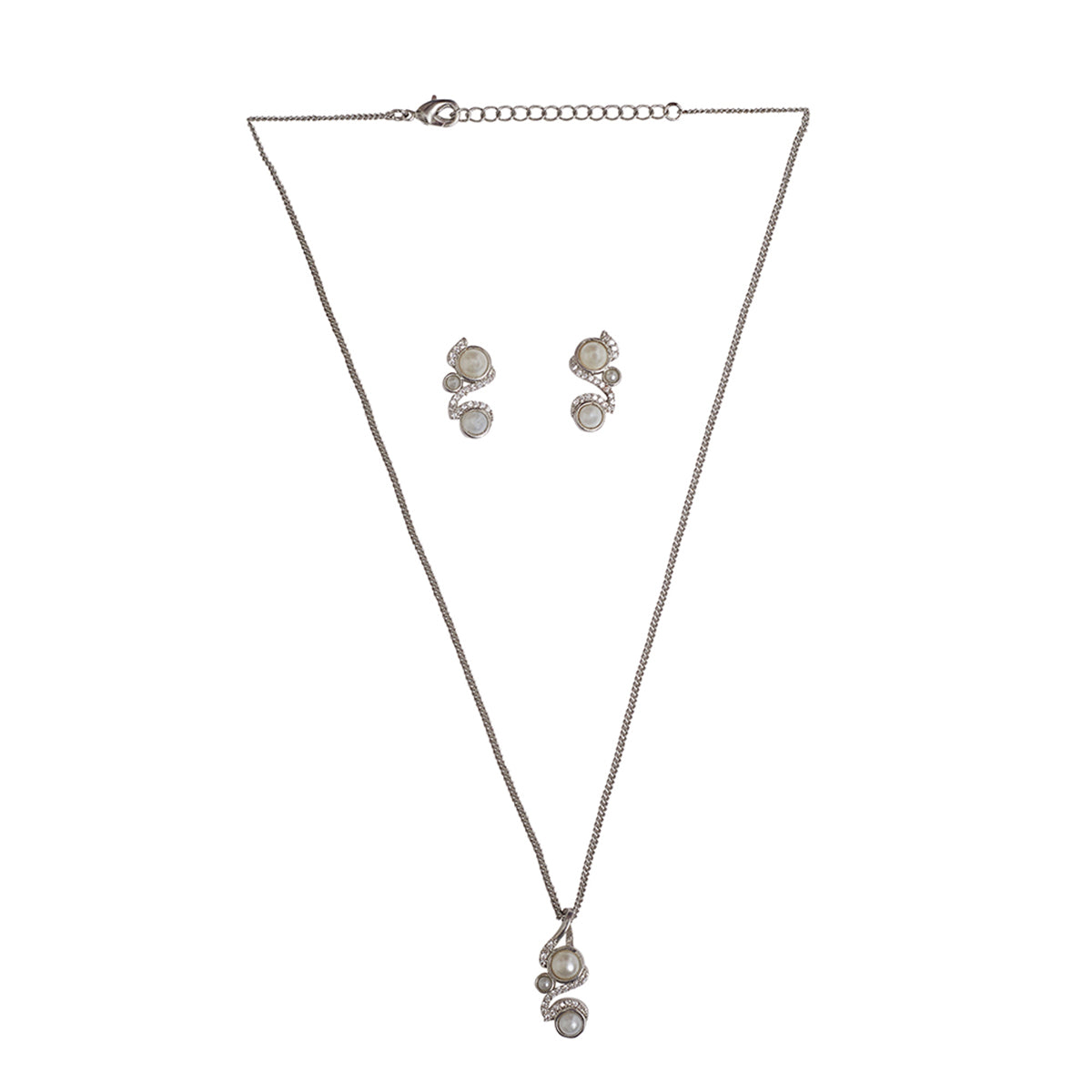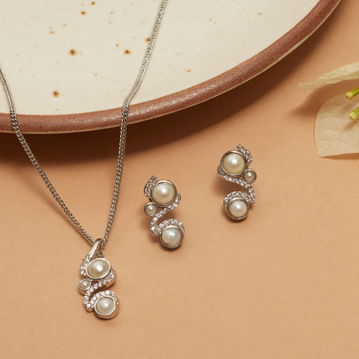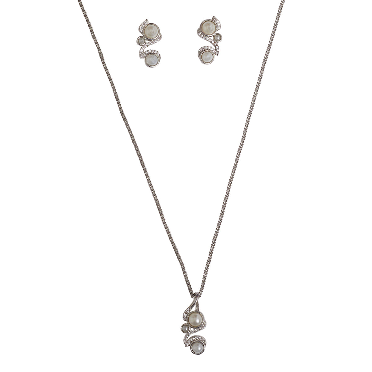 Minimalistic Faux Pearls and CZ Embellished Brass White Rhodium Plated Pendant Set