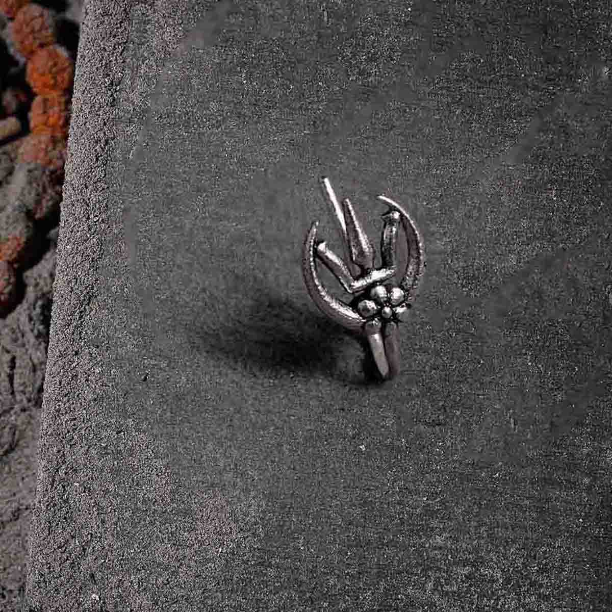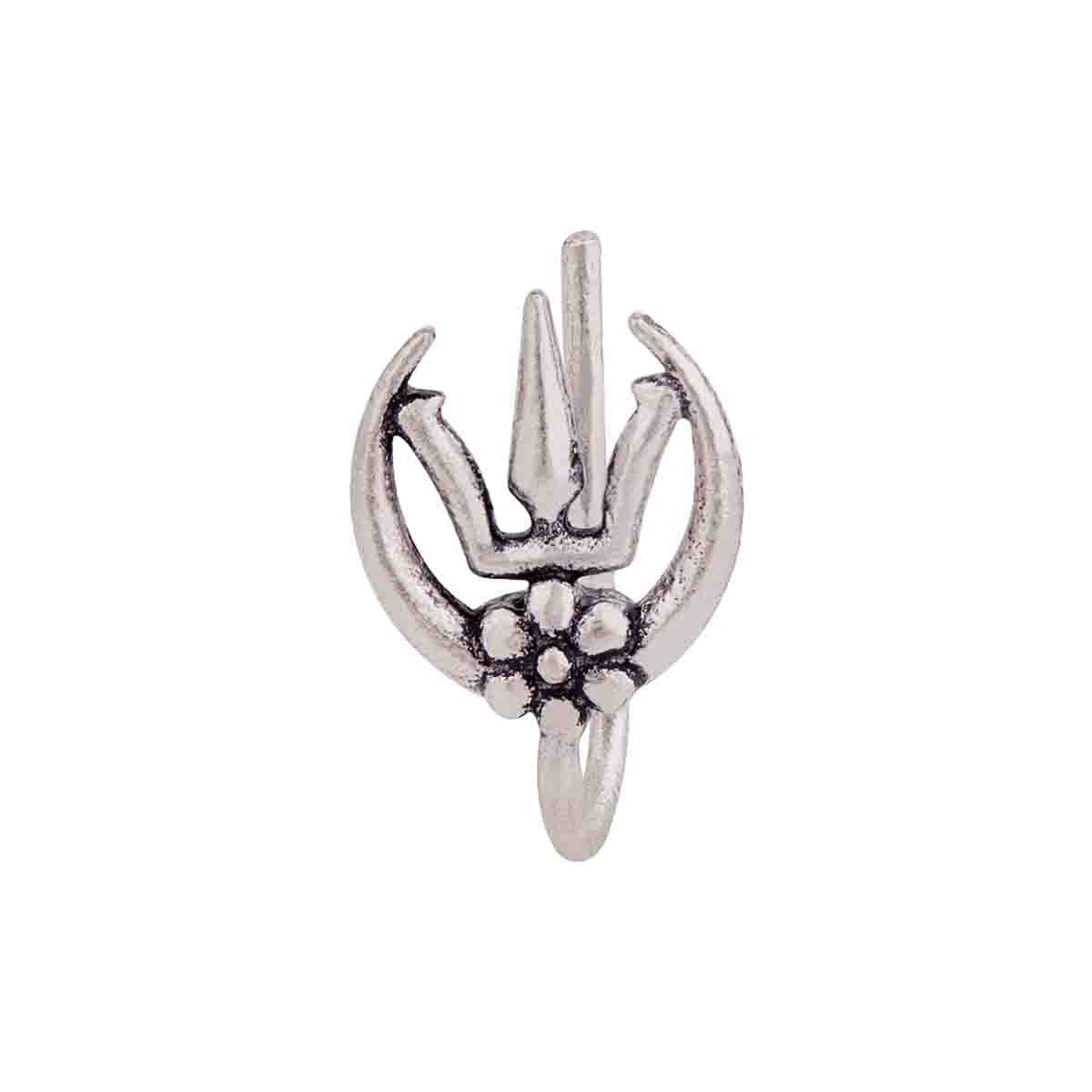 Trishul motif nose ring with oxidized silver plating. Made from brass, comfortable and good for everyday wear.