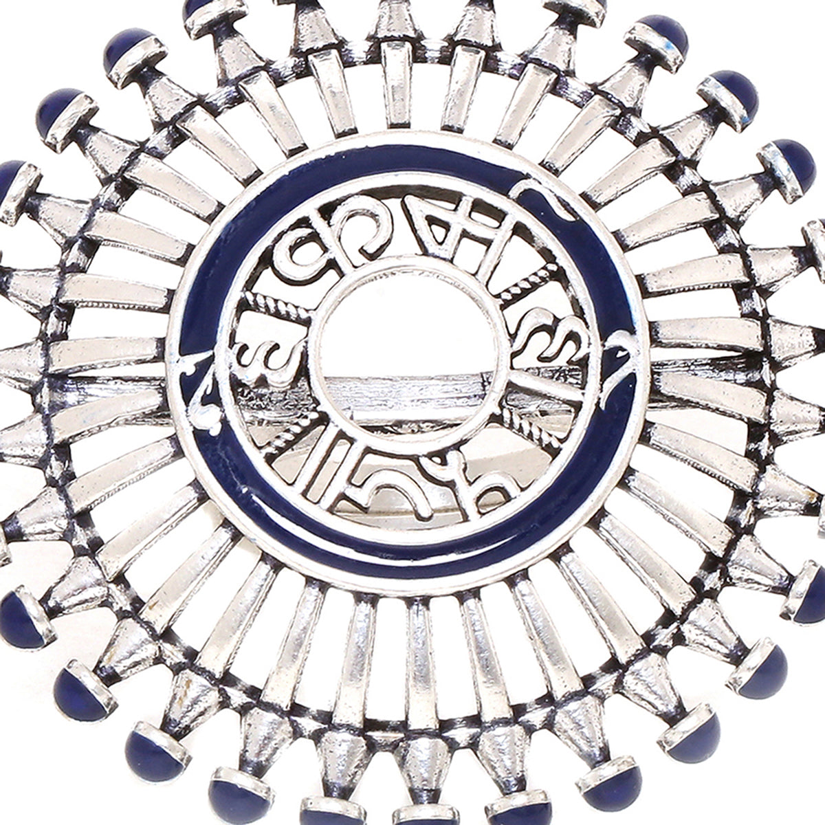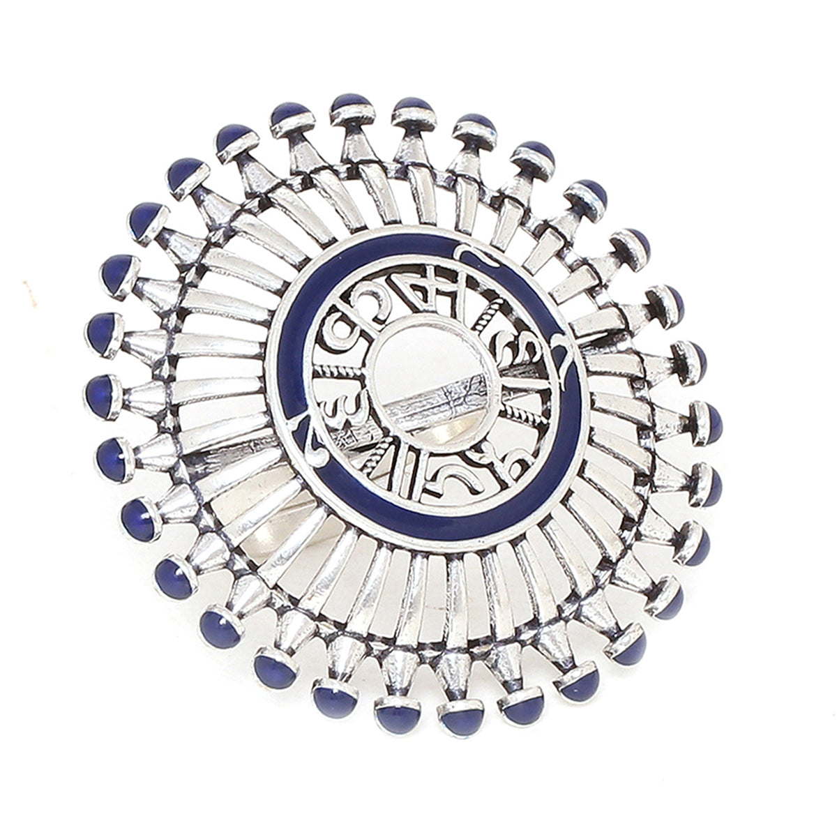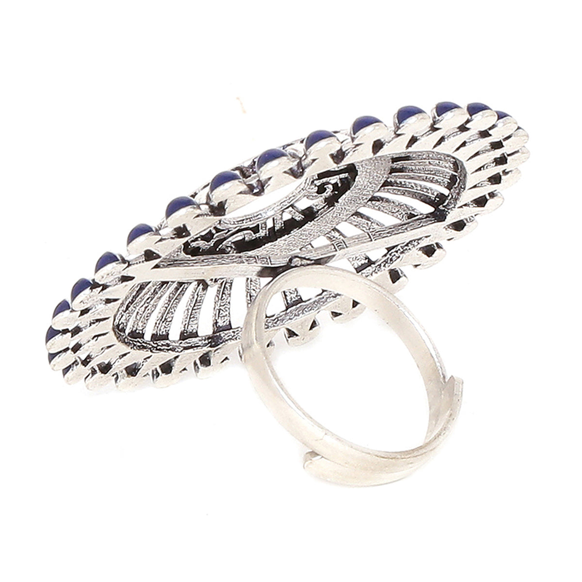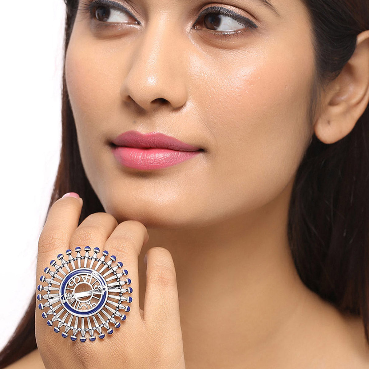 Inspired by mythological symbols, this ring has been fashioned out of brass and bears shloka inscriptions. Oxidised plated, the ring can be worn with ethnic and Indo-Western outfits.