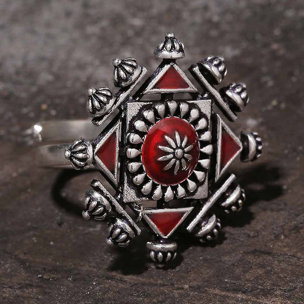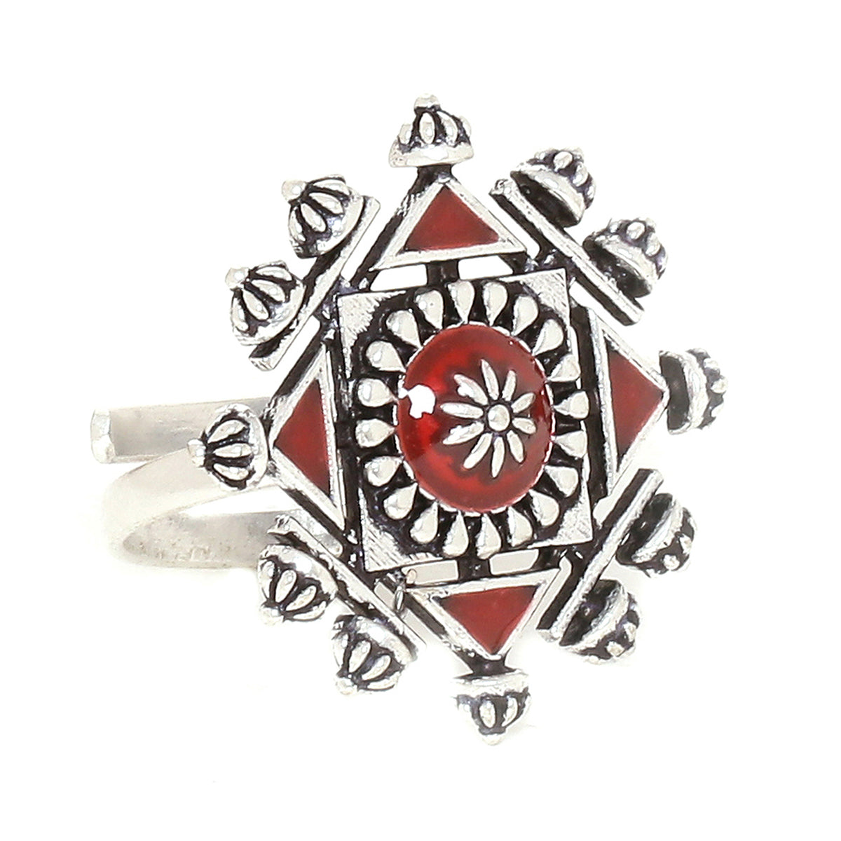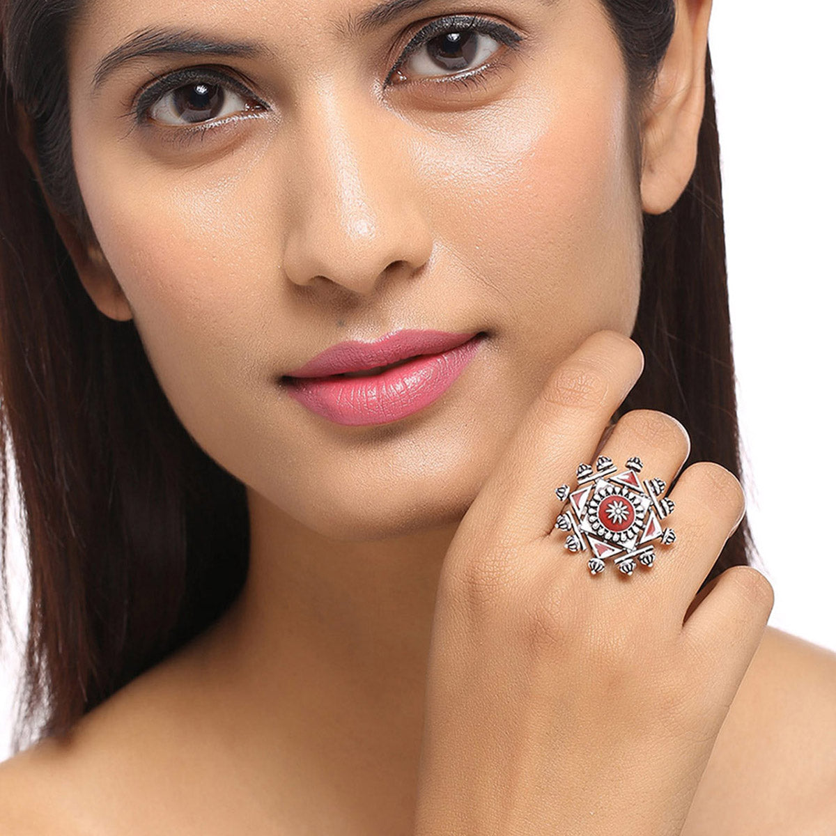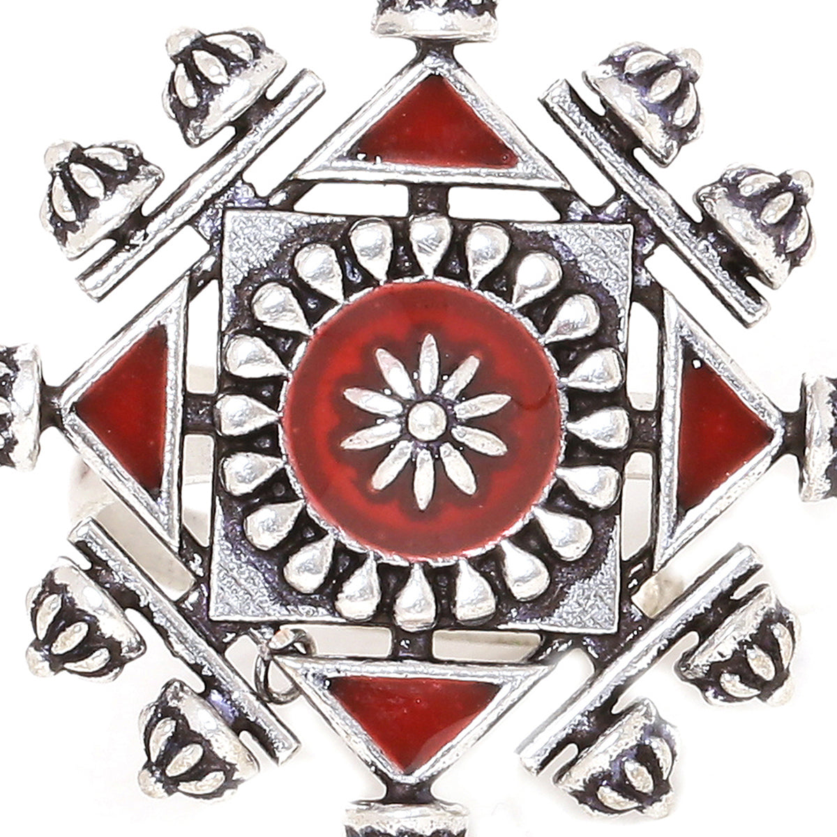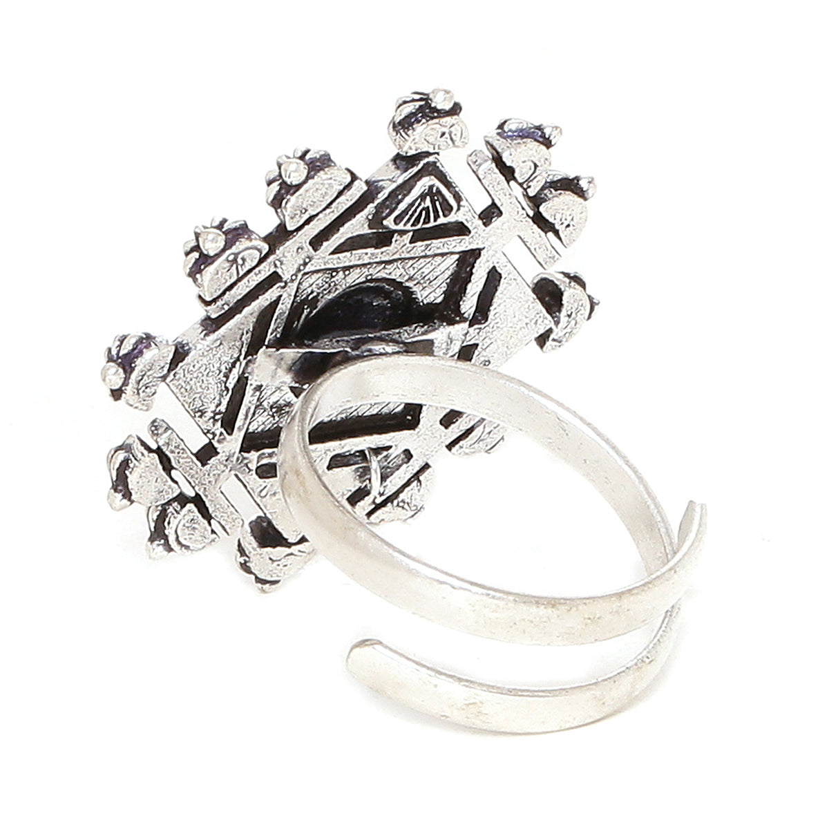 Inspired by Indian mythological symbols, this ring has been crafted from brass. Oxidised plated and perfect for casual and occasional wear.