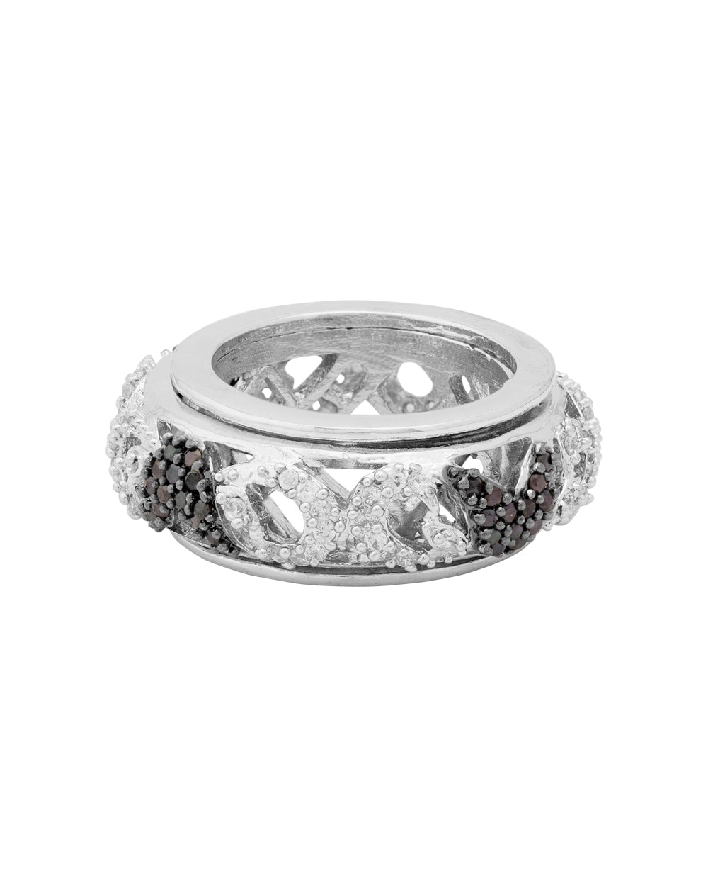 Decorate your pretty fingers with this lovely band ring from the house of Voylla. This ring is the very definition of luxury and impeccable design. Heavily embellished with white and black cubic zirconia gems, the monochrome ring has been fashioned out of brass. Silver plating adds to the charm of this stunning jewelry. This piece of jewelry comes with the Voylla assurance of quality and durability.