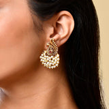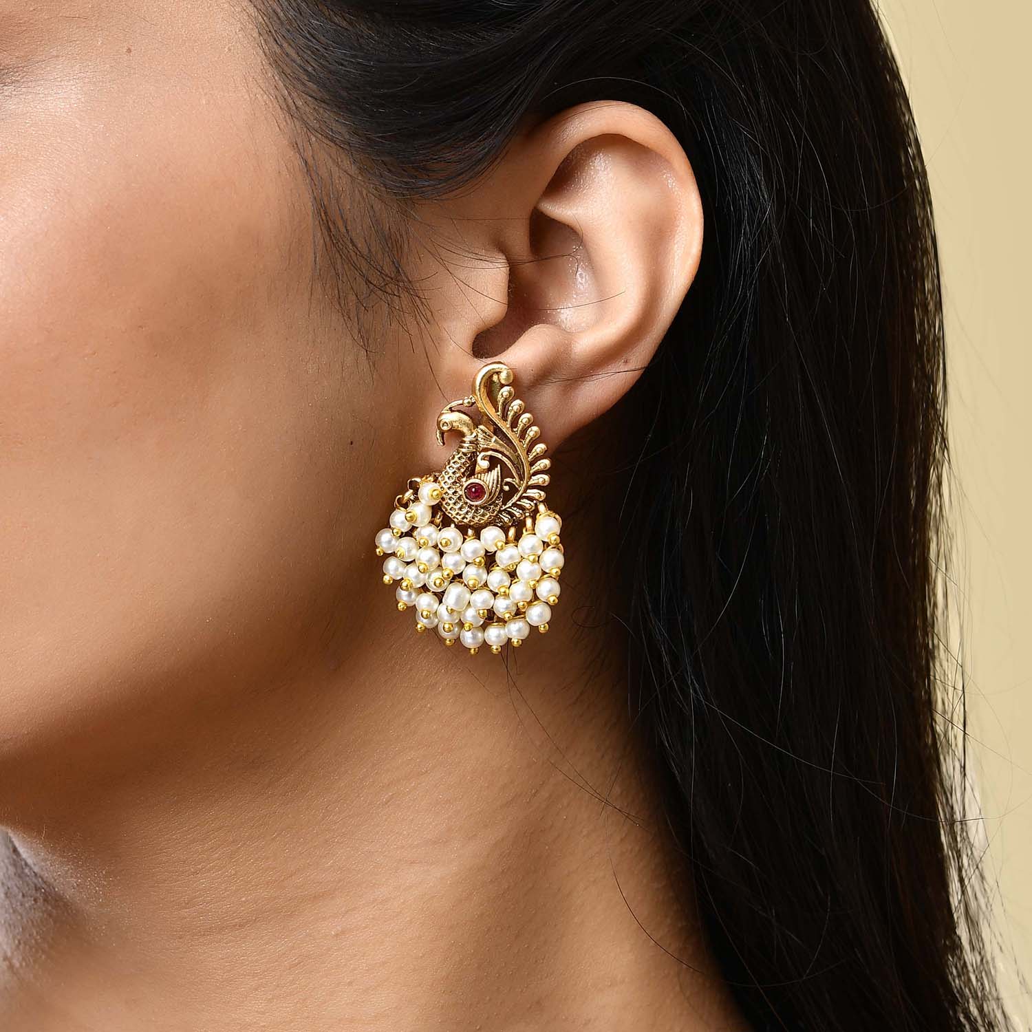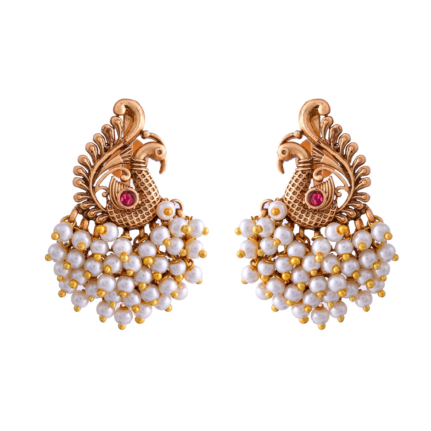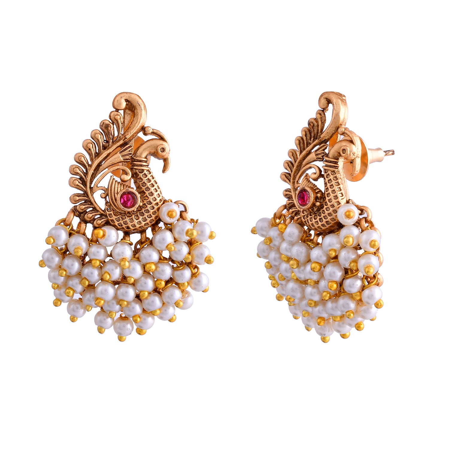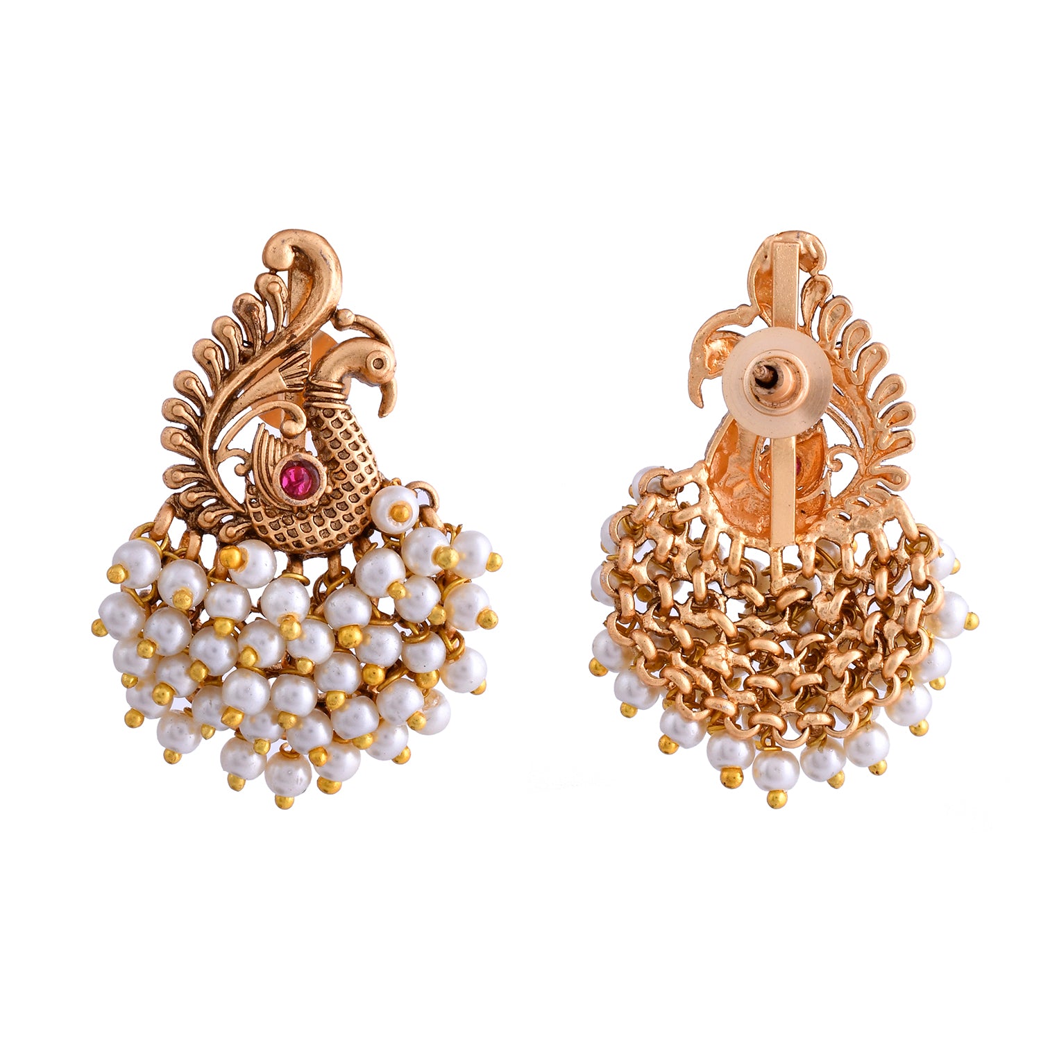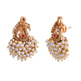 The Mor Mahal Temple Danglers Earrings from the Gold Opulence Collection are a stunning blend of traditional craftsmanship and modern elegance. These earrings are meticulously designed with an intricate peacock motif, adorned with lustrous white pearls and a striking red stone at the center, symbolizing royalty and grace. Crafted from high-quality alloy and plated with antique matte gold, these earrings exude a timeless charm. Perfect for weddings, festive occasions, and pooja ceremonies, they add a touch of sophistication to any ethnic attire. Pair them with a silk saree or an elegant lehenga to make a statement. These earrings also make a thoughtful gift for women on special occasions like Valentine's Day, Diwali, Rakshabandhan, Christmas, and New Year. Whether for a mother, sister, girlfriend, wife, or friend, these earrings are sure to be cherished. Embrace the essence of South Indian temple jewelry with these exquisite danglers that promise to elevate your festive and wedding wear with their royal appeal.