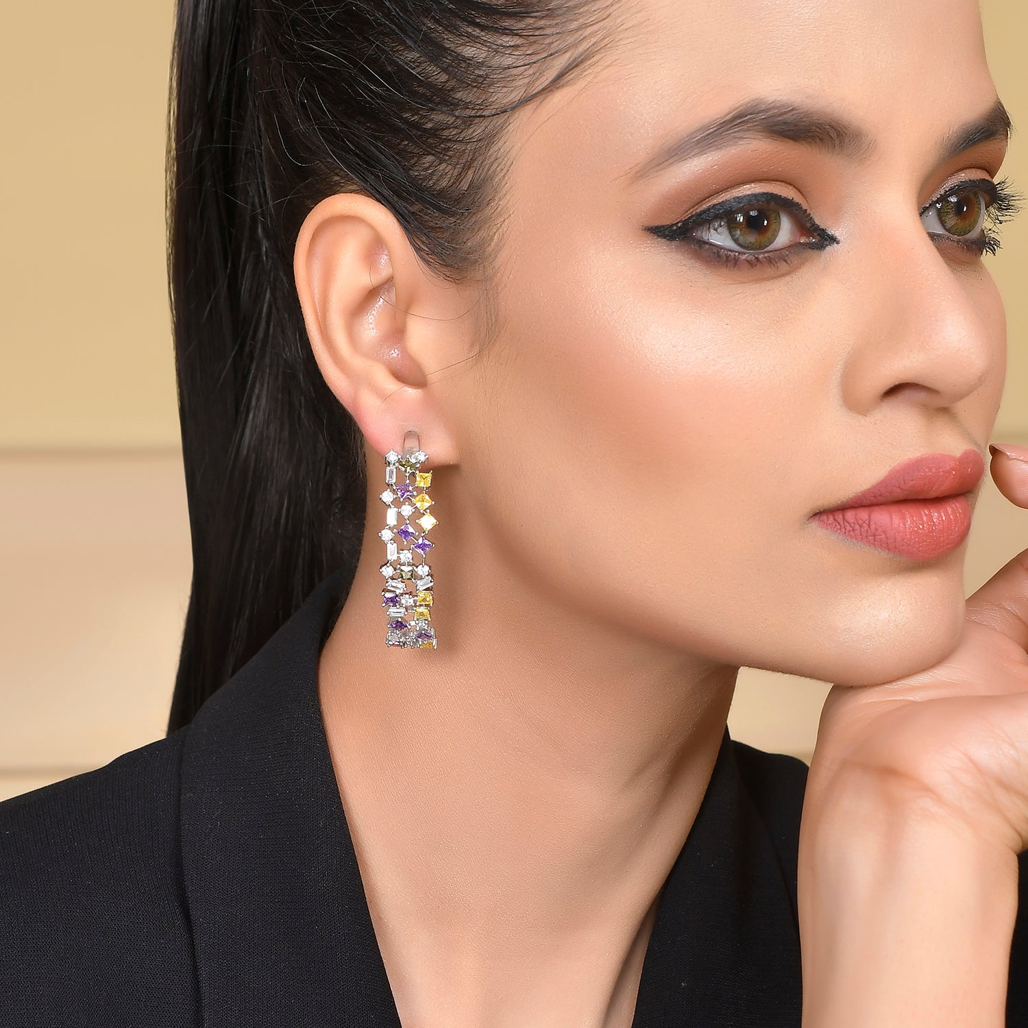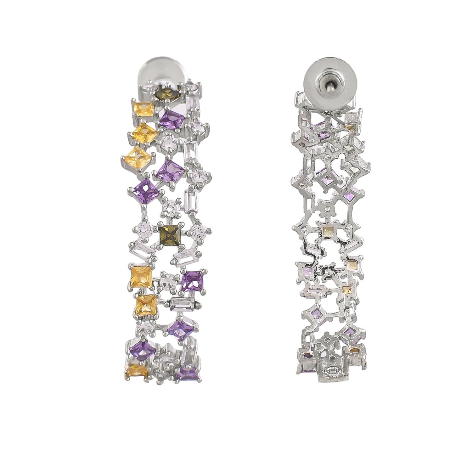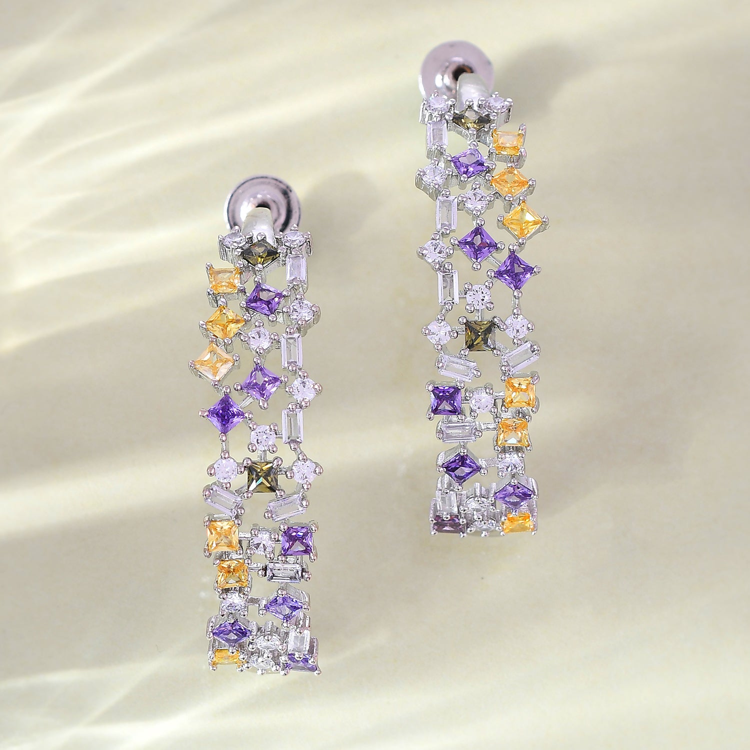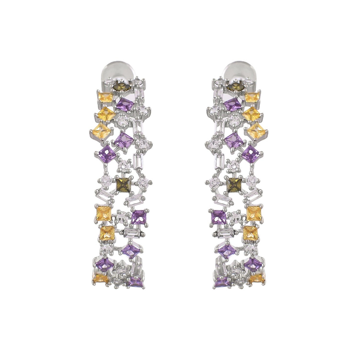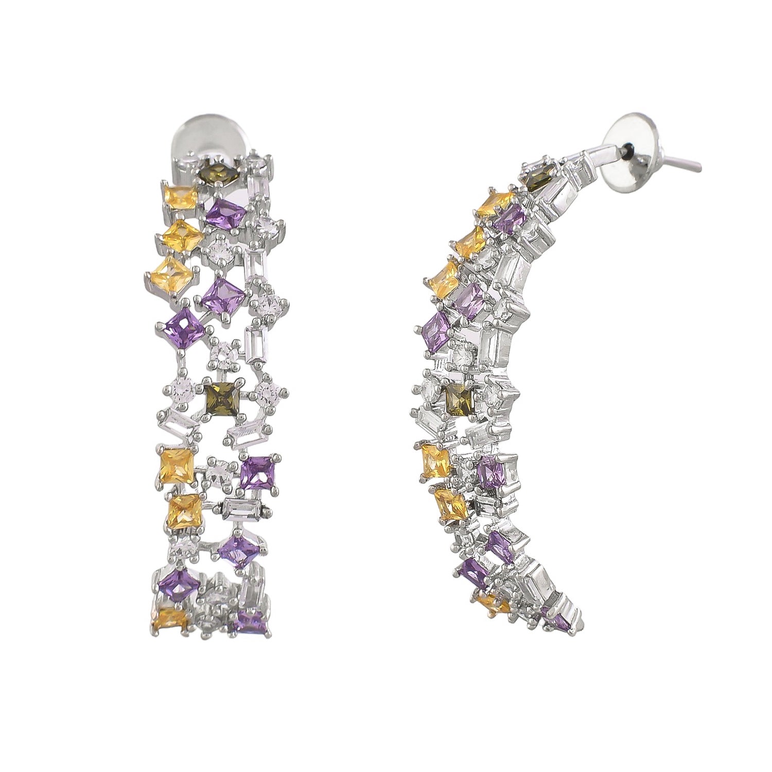 Inspired by Cubism, these multicolored hoops feature cubic zirconia stones, capturing the avant-garde spirit. Elevate your mood with this contemporary accessory, perfect for adding a touch of glamour and sophistication to any ensemble.