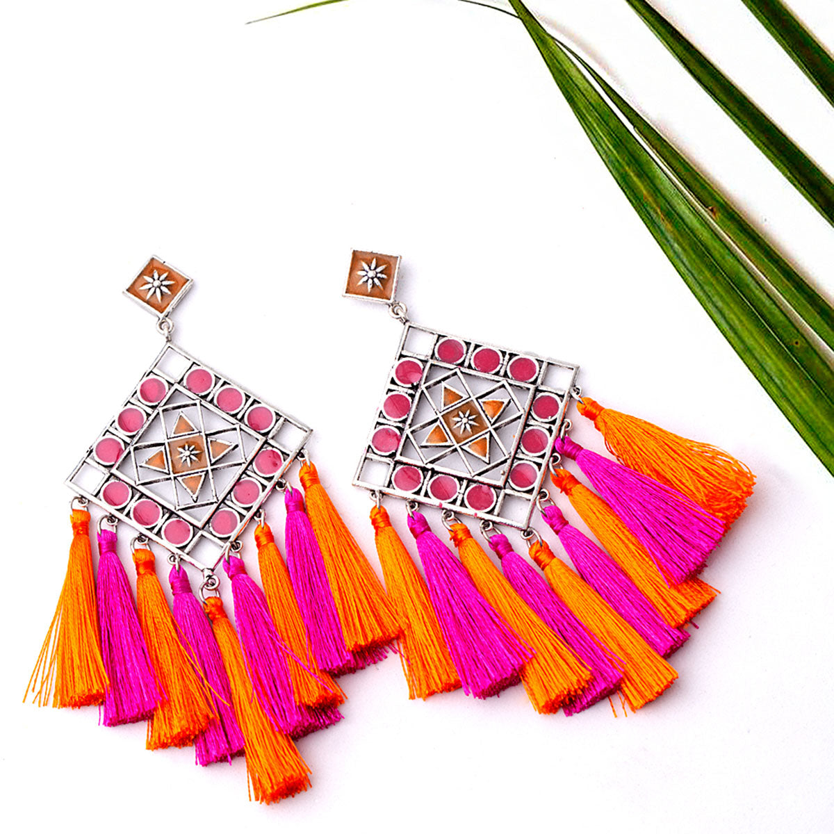 Coloured tassels enameled earrings with filigree design. Oxidised plated and made from brass. A good match for Indo-Western looks.