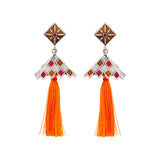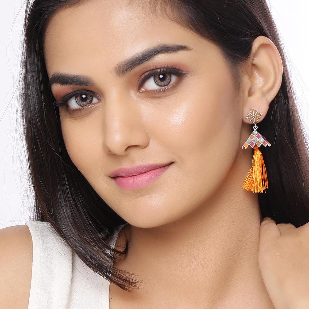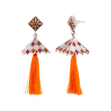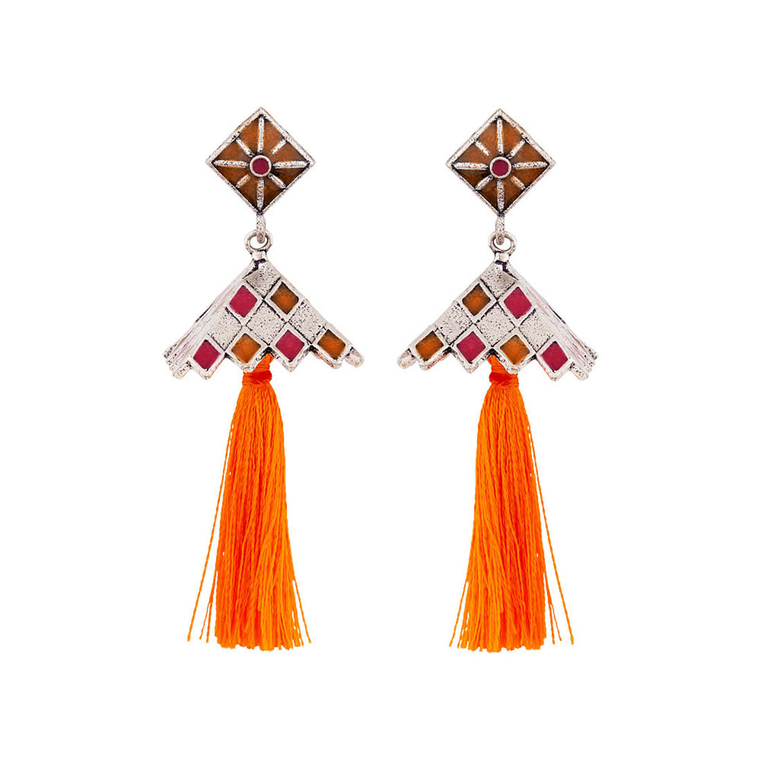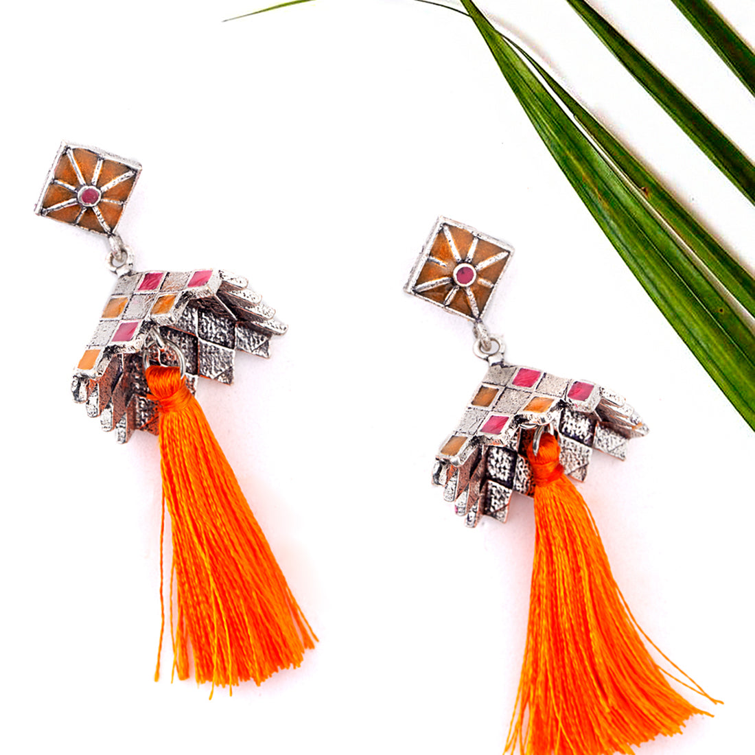 Ethnic design tassels drop earrings made from brass. Enameled and oxidised plated. Good for Indo-Western looks.