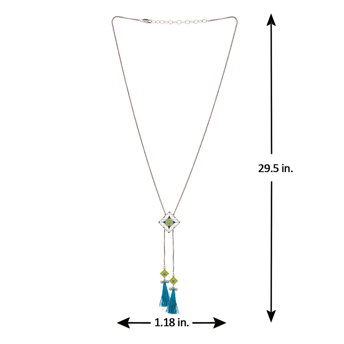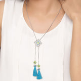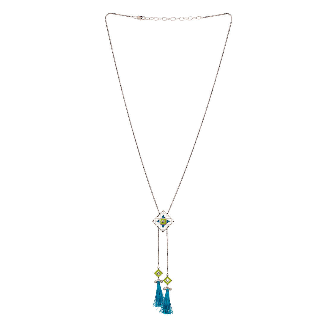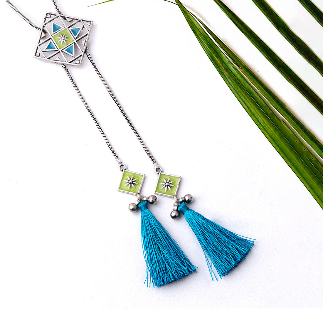 Filigree design tassels drop necklace made from brass. Enameled and oxidised plated. Wear with an ethnic skirt and kurta outfit.