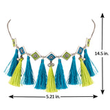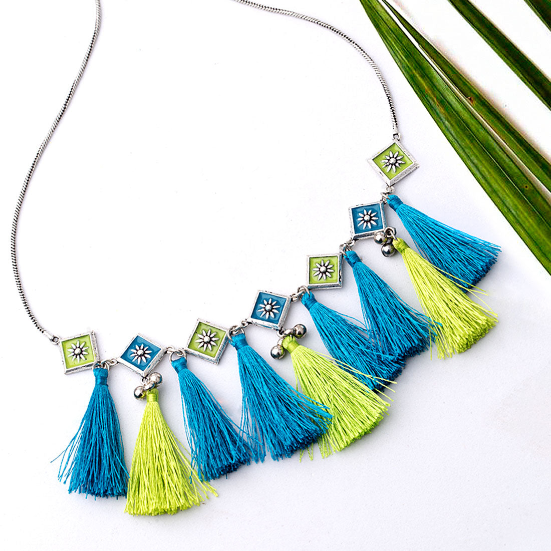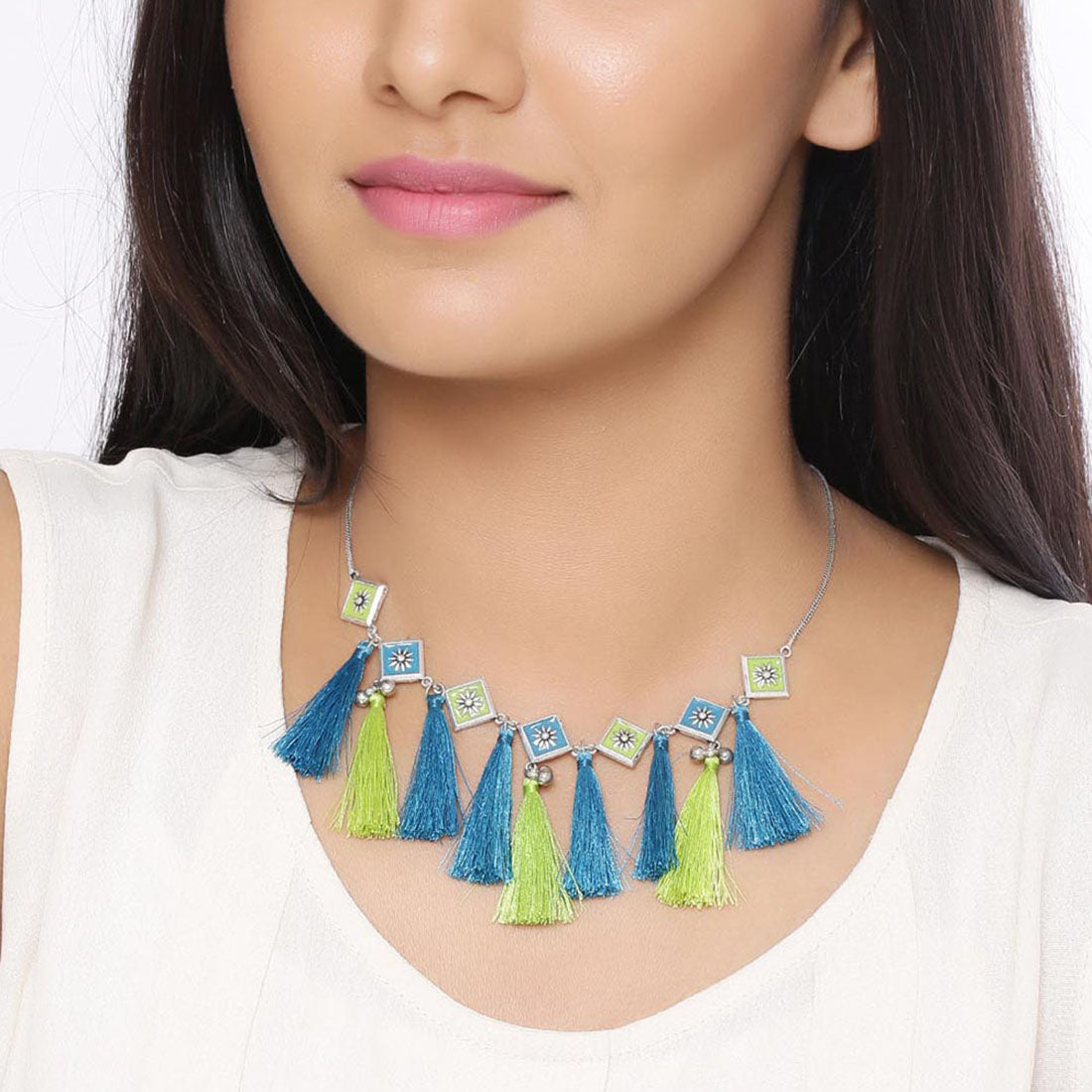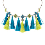 Lightly embellished coloured tassels drop necklace. Made from brass and oxidised plated. Wear the enameled necklace with a casual kurta.
