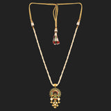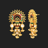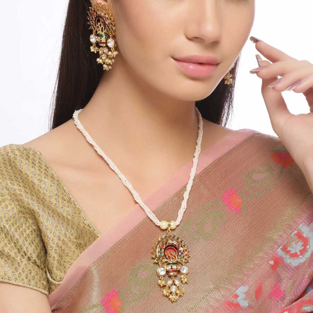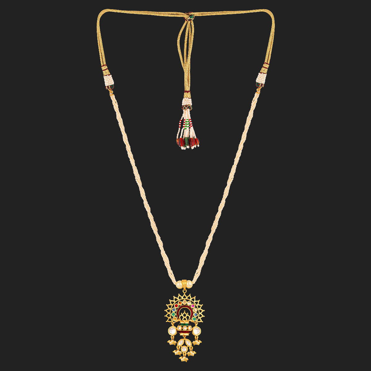 Featuring an ethnic rangoli style design, this brass necklace set has been inspired by classic nine gemstones Indian jewelry. Embellished with American Diamond gems and faux pearls, the yellow gold plated set is lightweight, comfortable and a good match for formal ethnic looks.