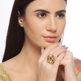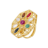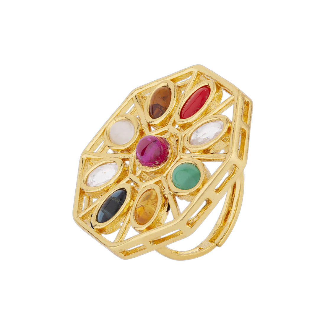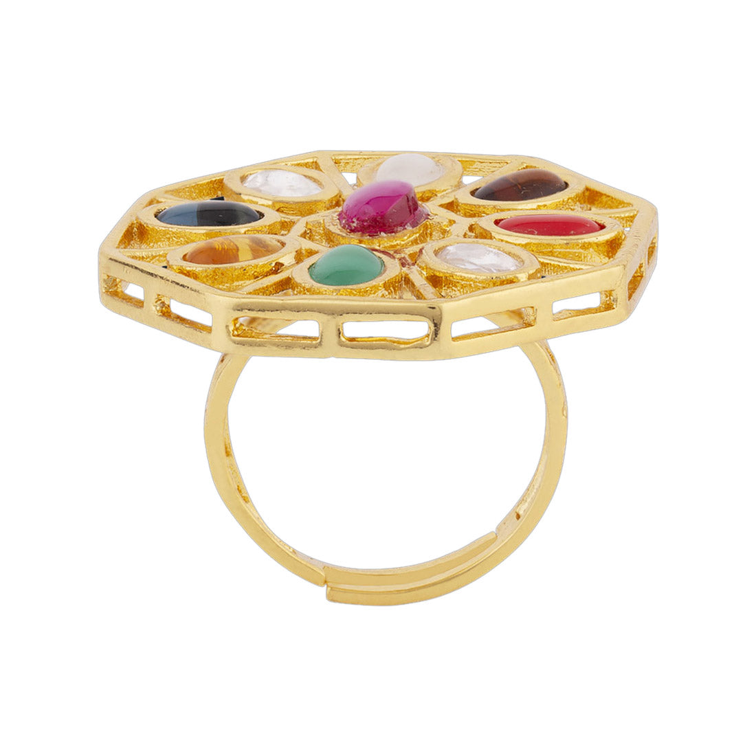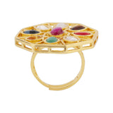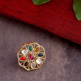 Statement ring embellished with zircon gemstones, inspired by the opulent, nine gems jewelry of royal households. Made from brass, the yellow gold plated ring would make a suitable addition to your formal ethnic looks.