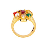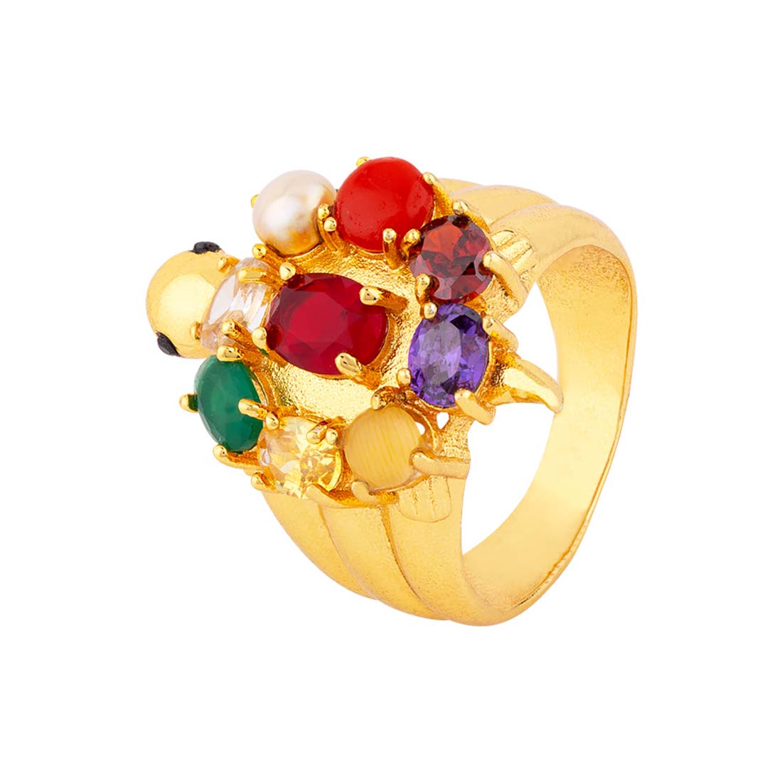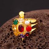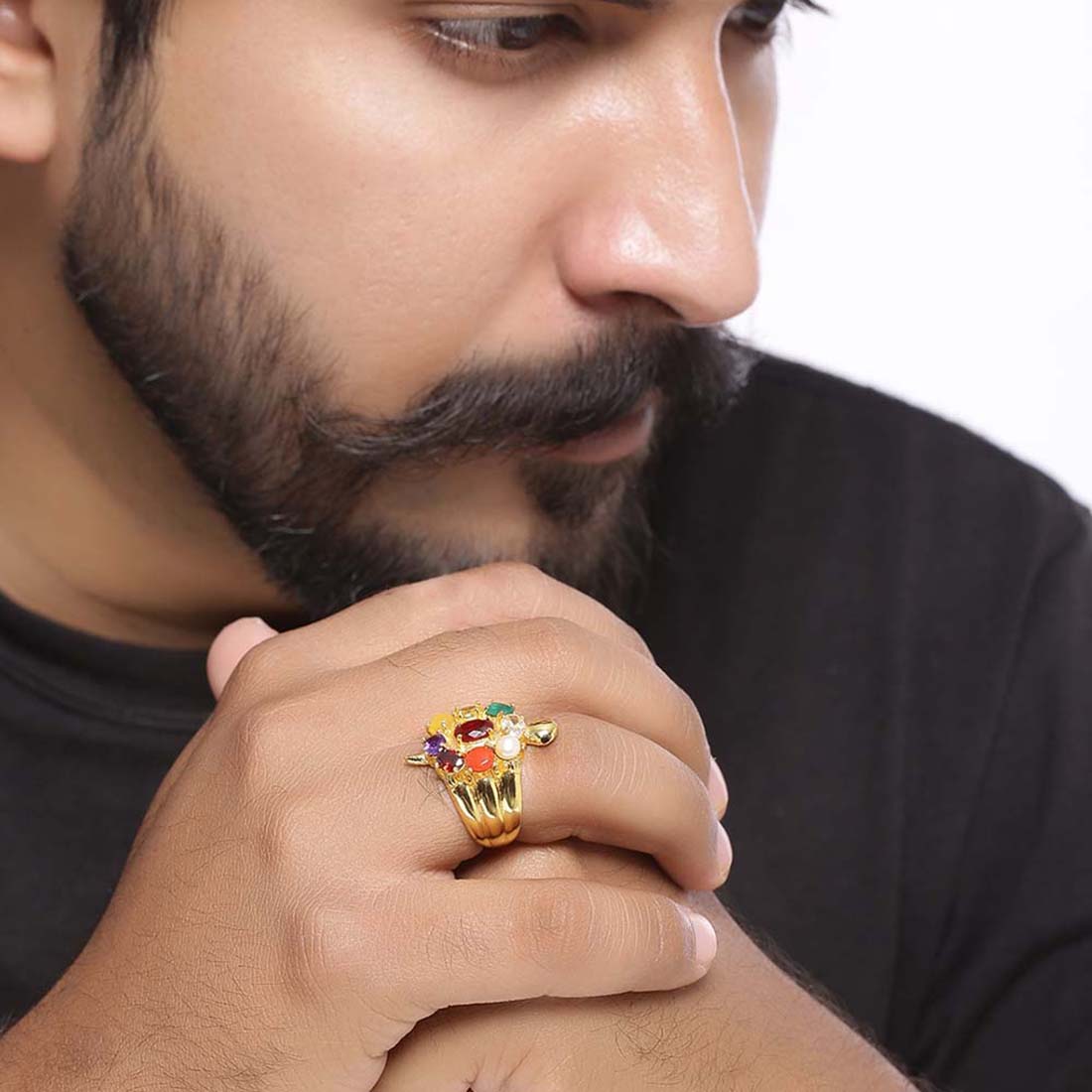 Antique inspired men's brass ring with yellow gold plating. Embellished with CZ gems. Pair with formal ethnic looks.