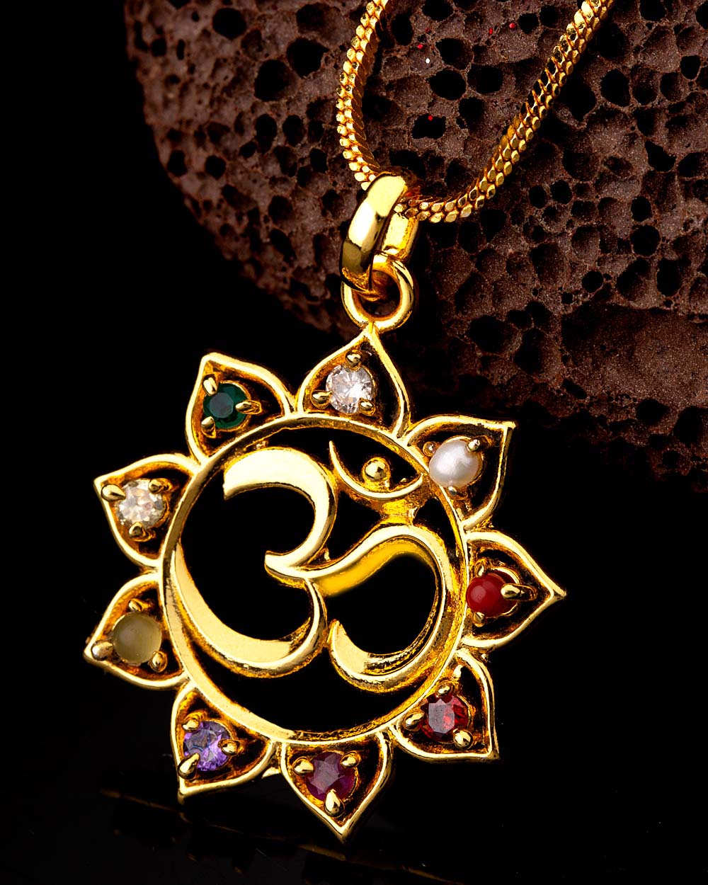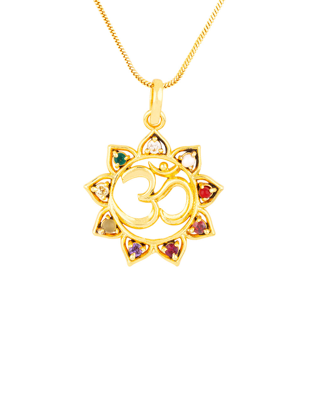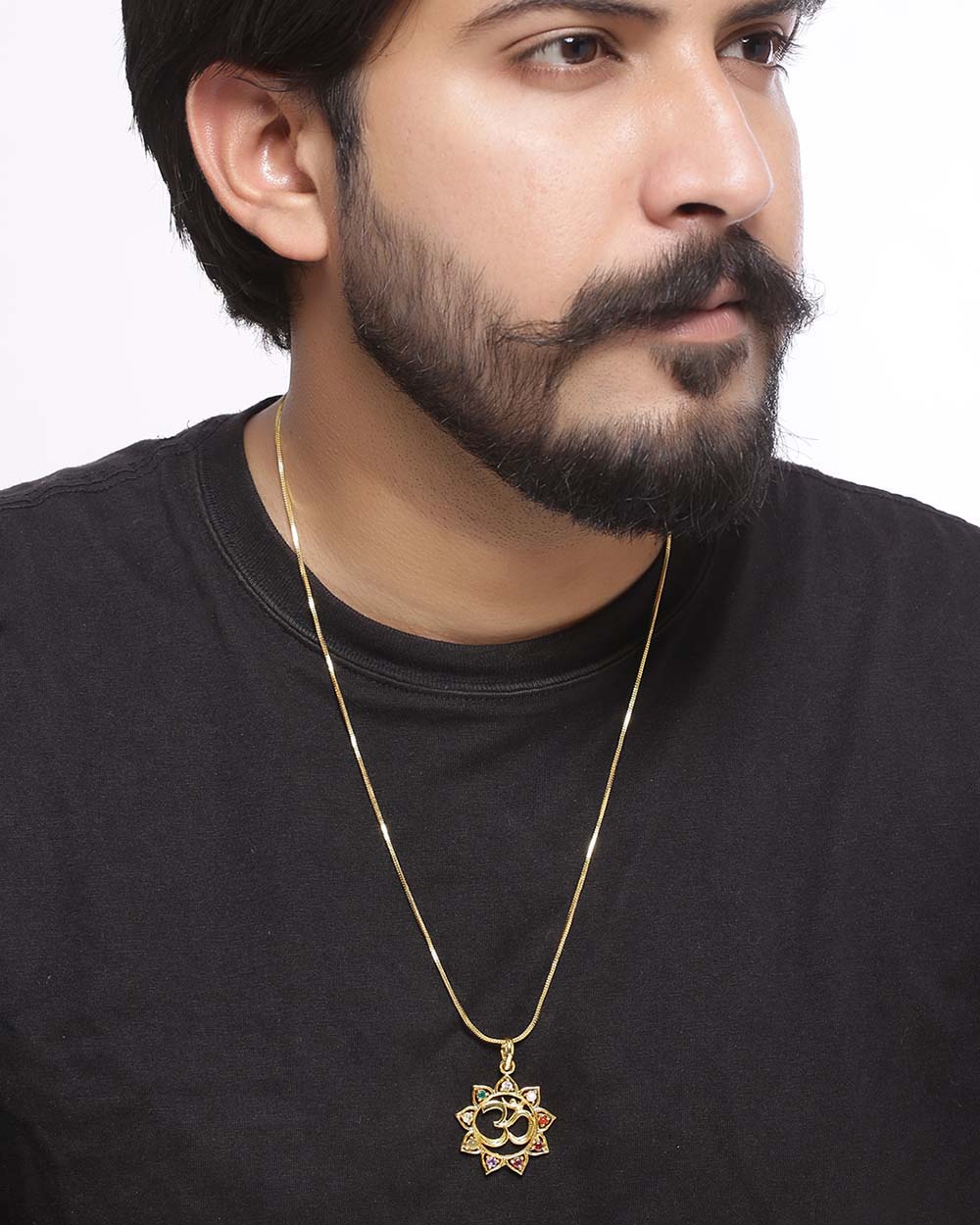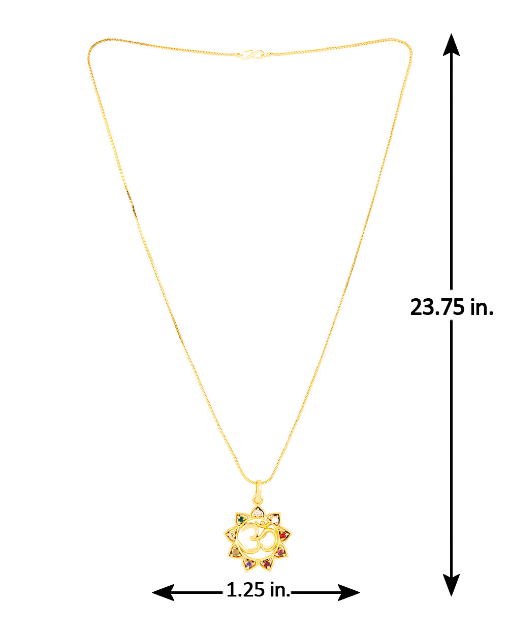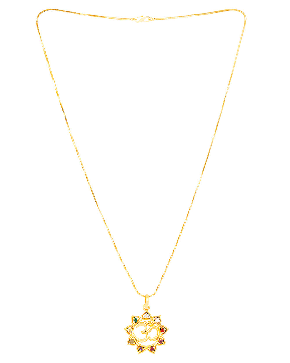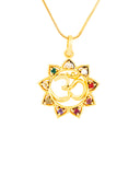 OM pendant embellished with CZ gems. Made from brass and yellow gold plated. Wear with formal ethnic attire.