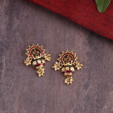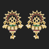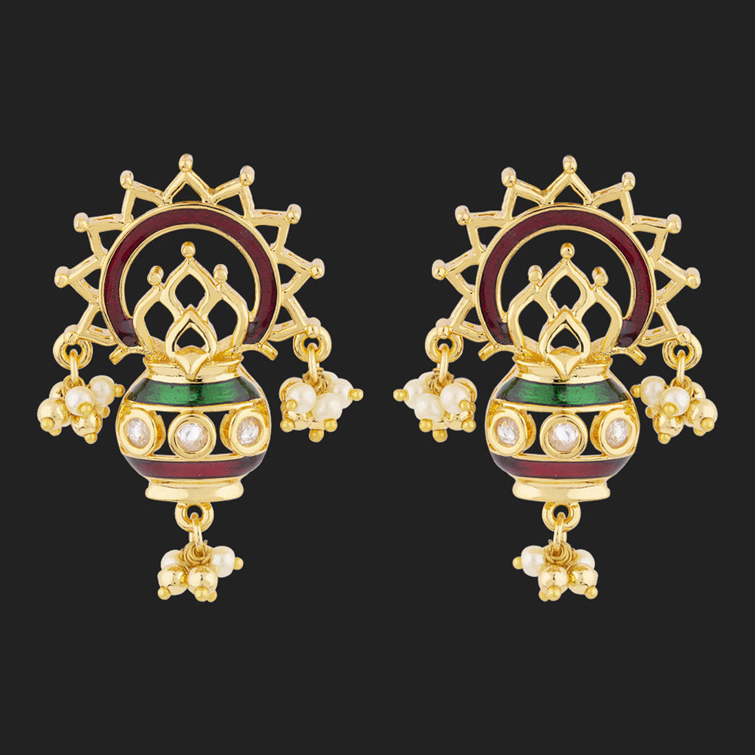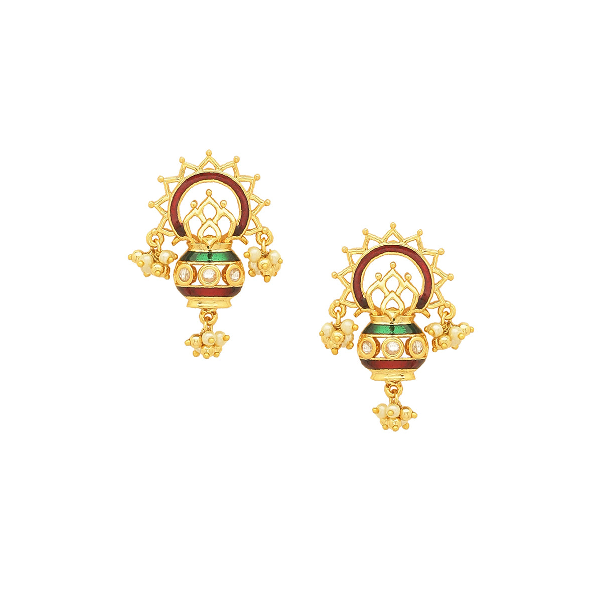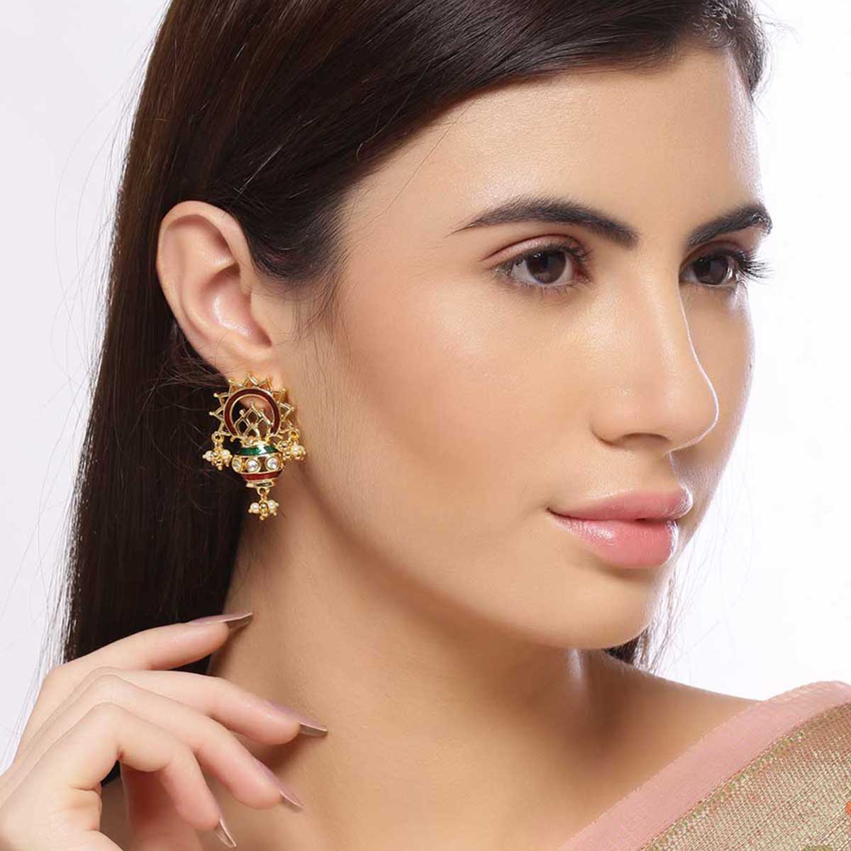Traditional ethnic jewelry that was embellished with nine precious, royal gems has inspired these earrings, which have been crafted from brass into a delicate filigree design. Embellished with American Diamond gems, the yellow gold plated pair is lightweight and comfortable. Pair with a dark hued saree of your choice.