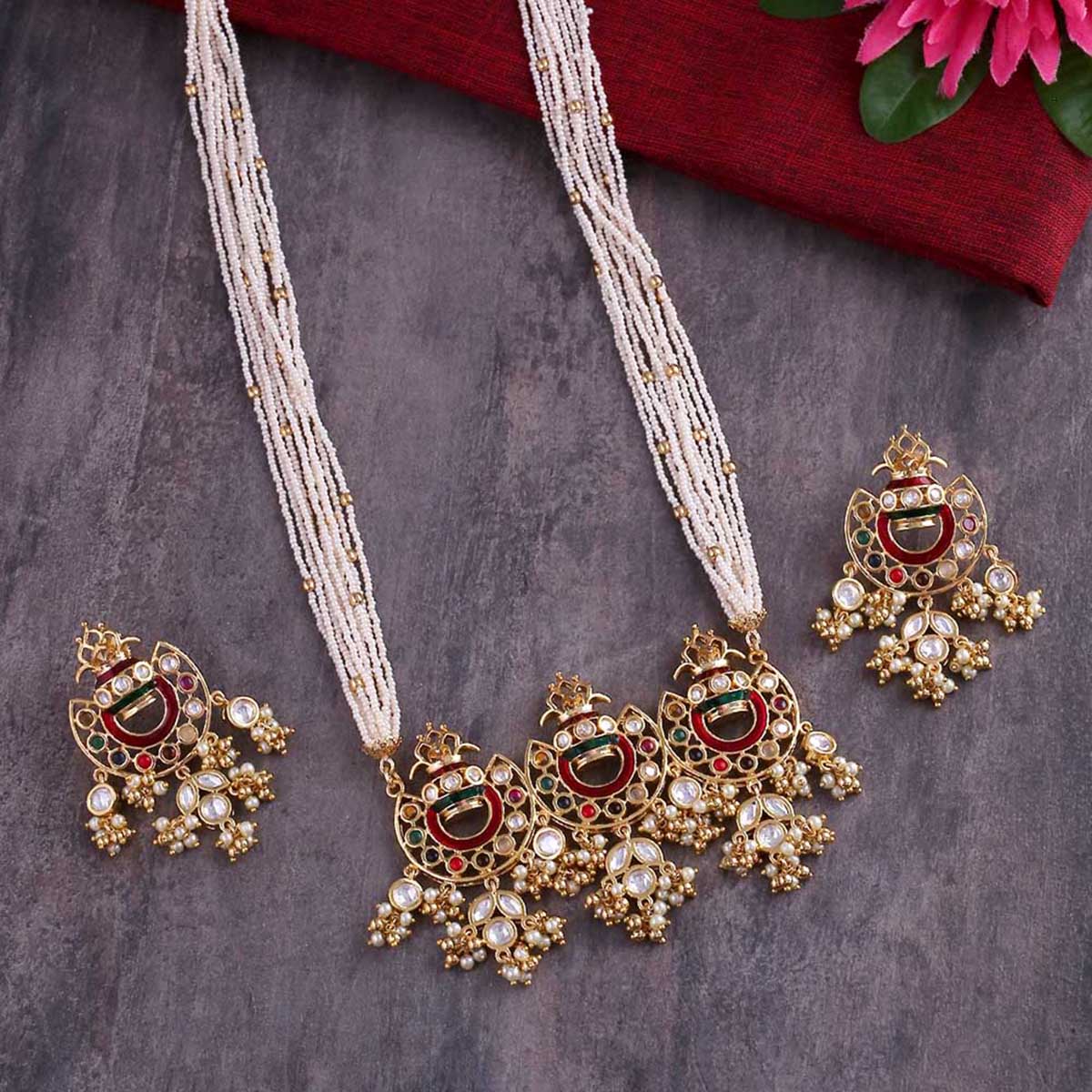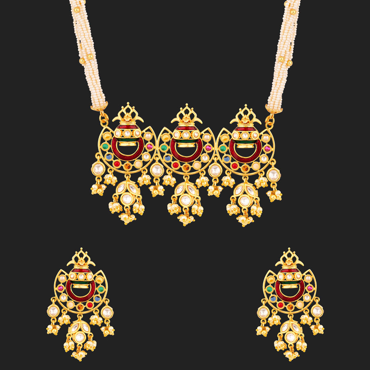 Navratan Pearls and CZ Gems Necklace Set