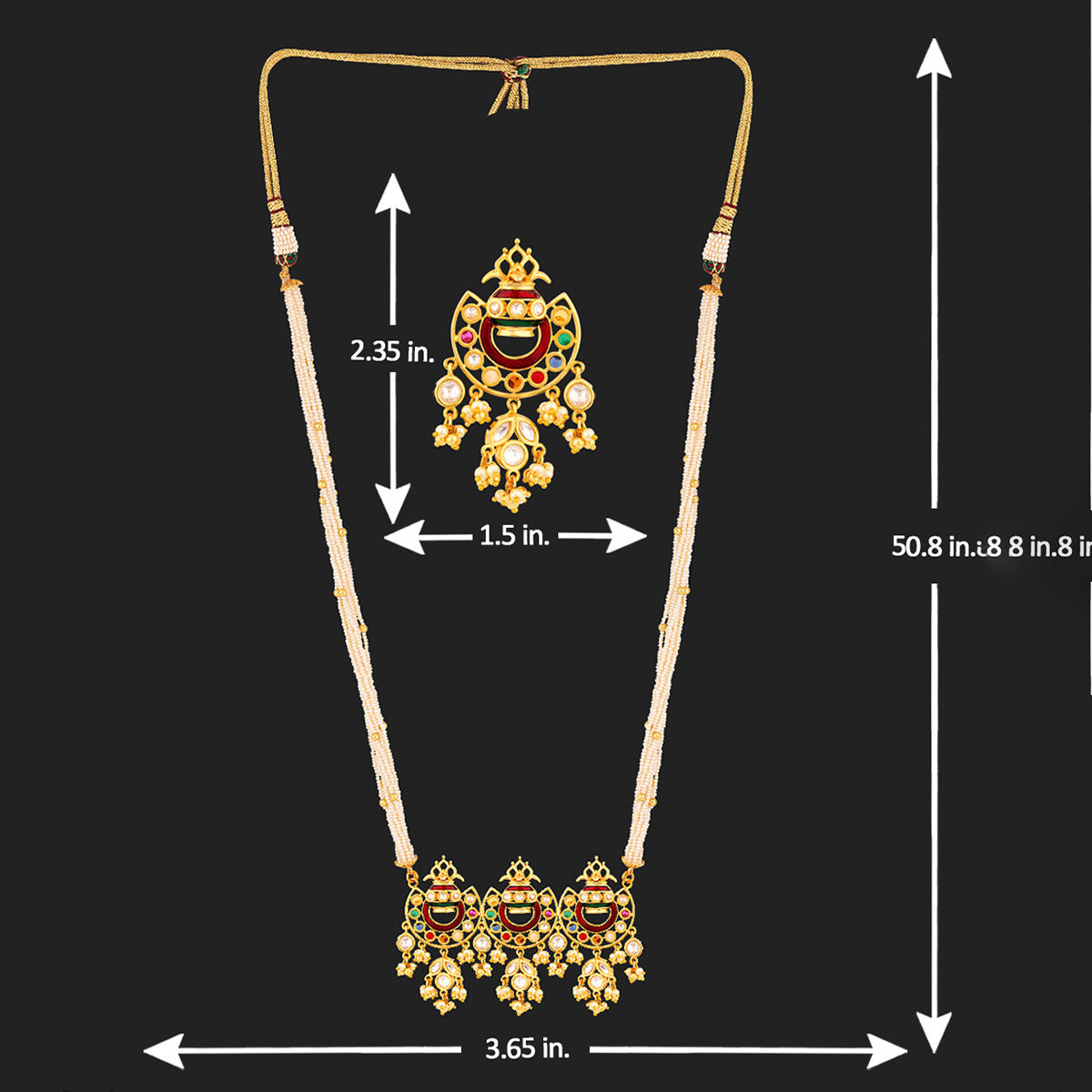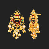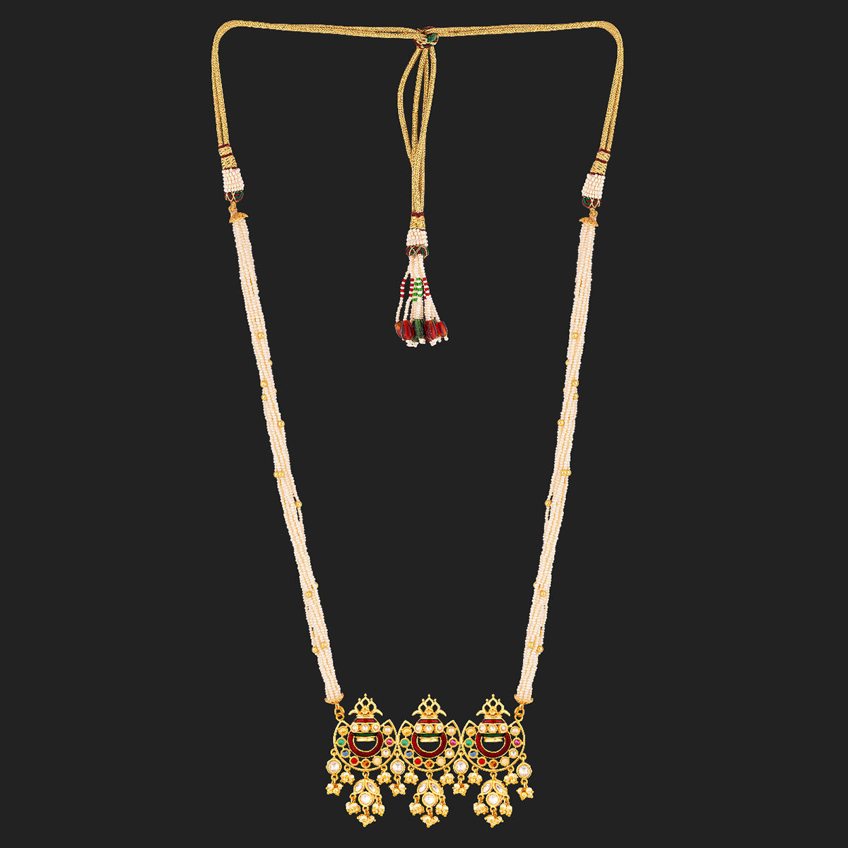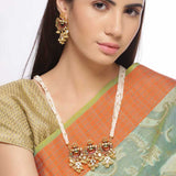 Royal jewelry pieces featuring classic nine precious gems have inspired this necklace set, which has been crafted from brass. Yellow gold plated and embellished with faux pearls and colourful American Diamond gems, the set is a good match for formal ethnic looks.