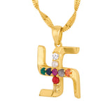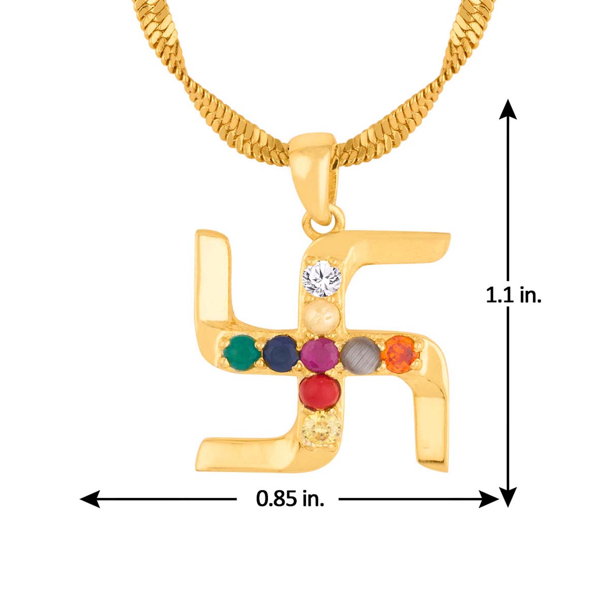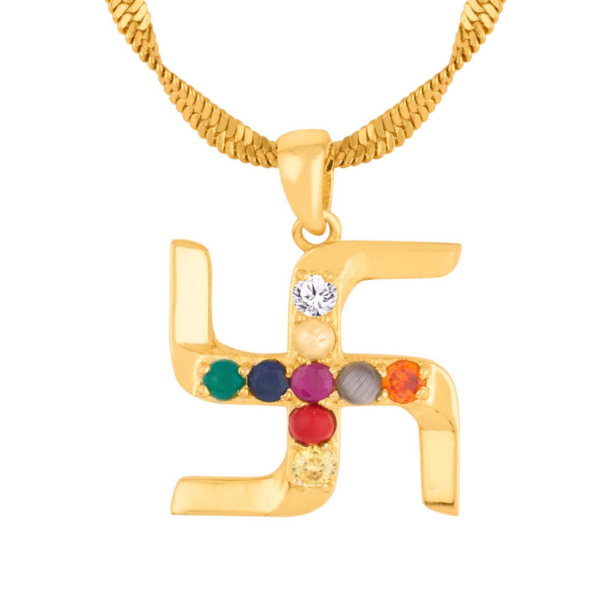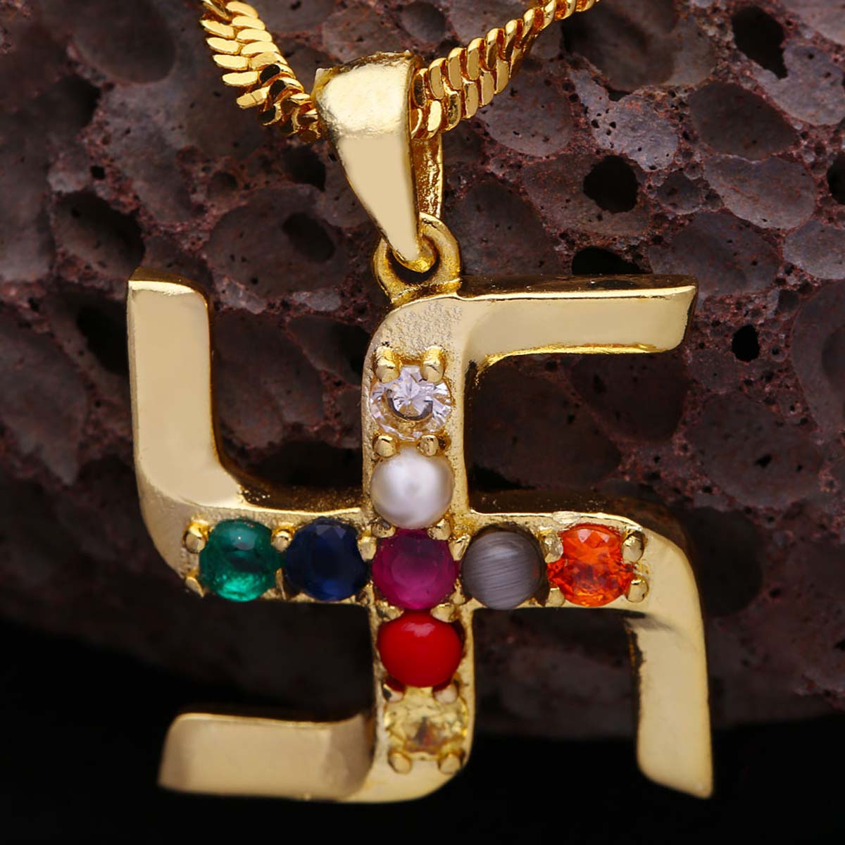 The Accessory: The bold Swastik motif studded with attractive colourful stones make this Navratan pendant a stunning piece.