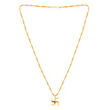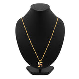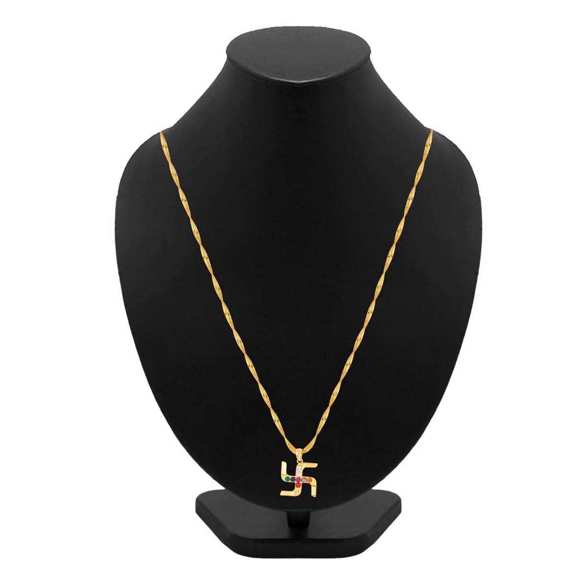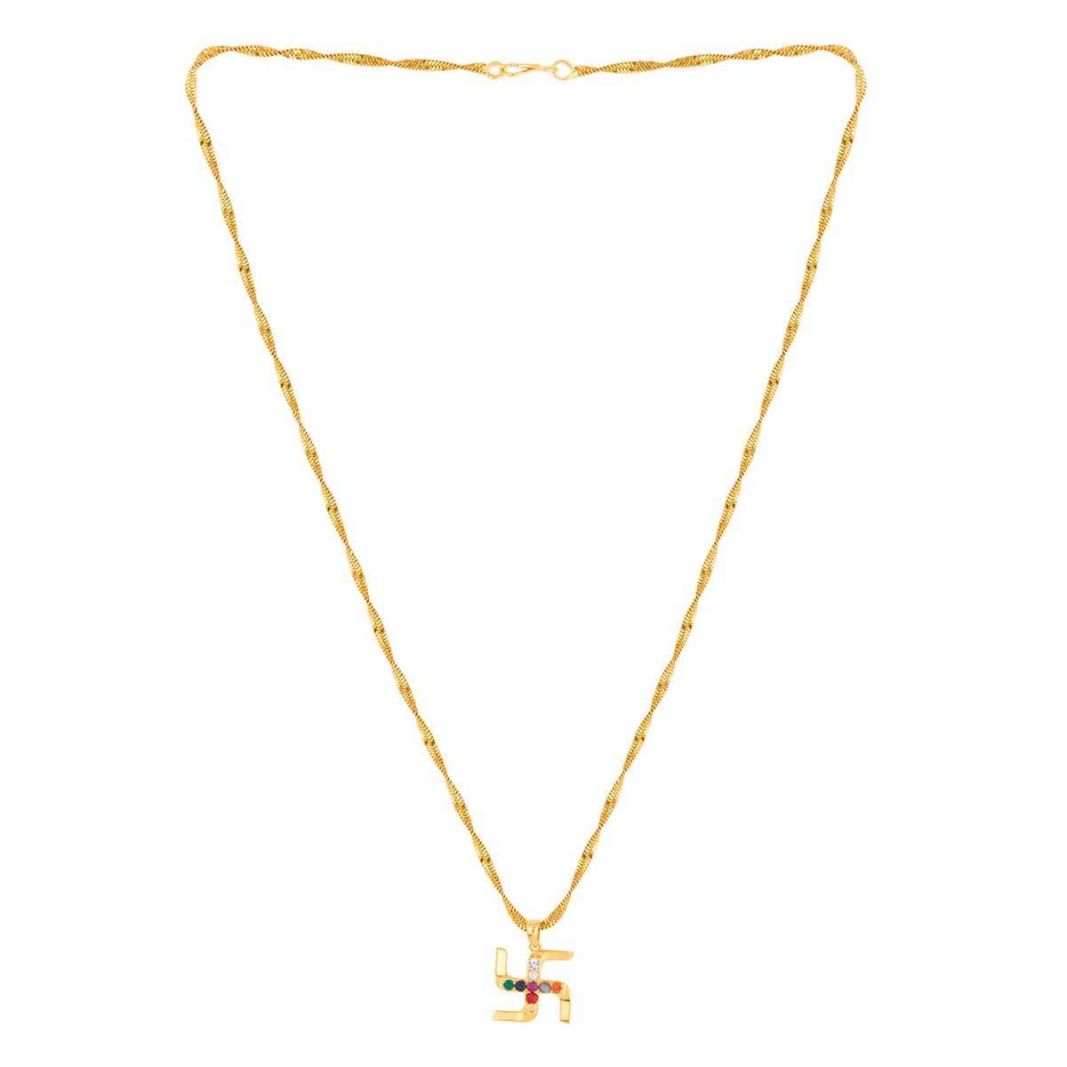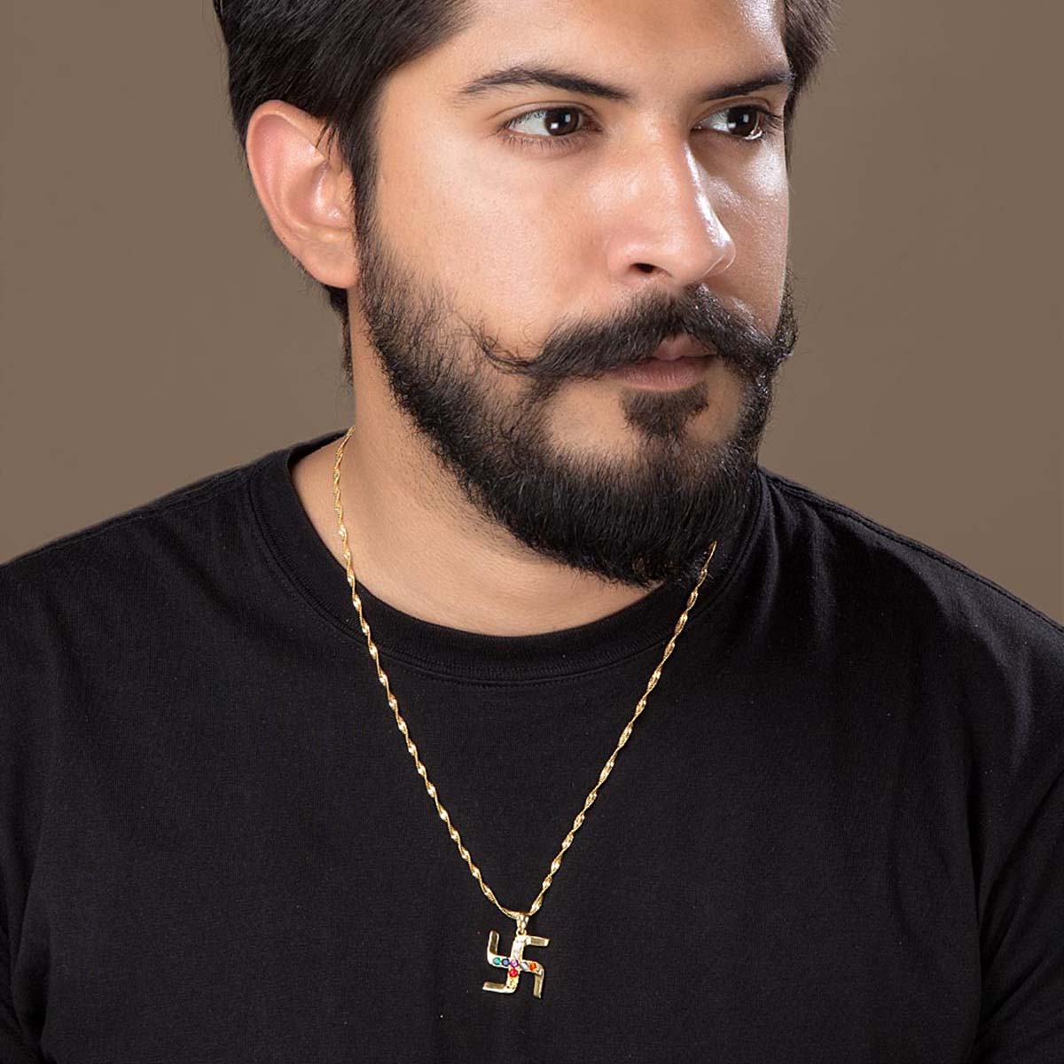 The Accessory: The bold Swastik motif studded with attractive colourful stones make this Navratan pendant a stunning piece.