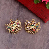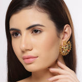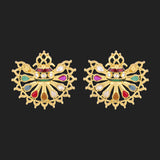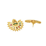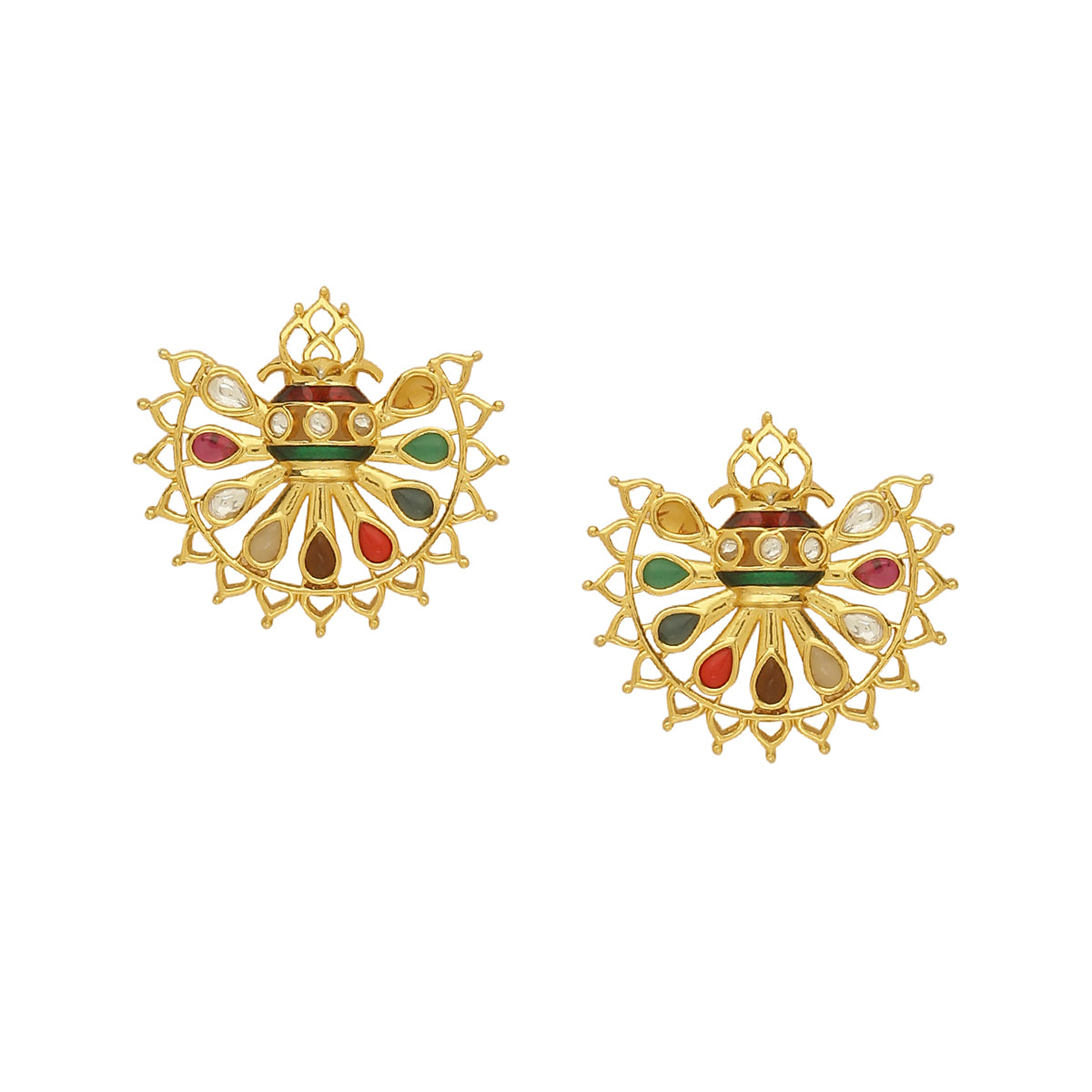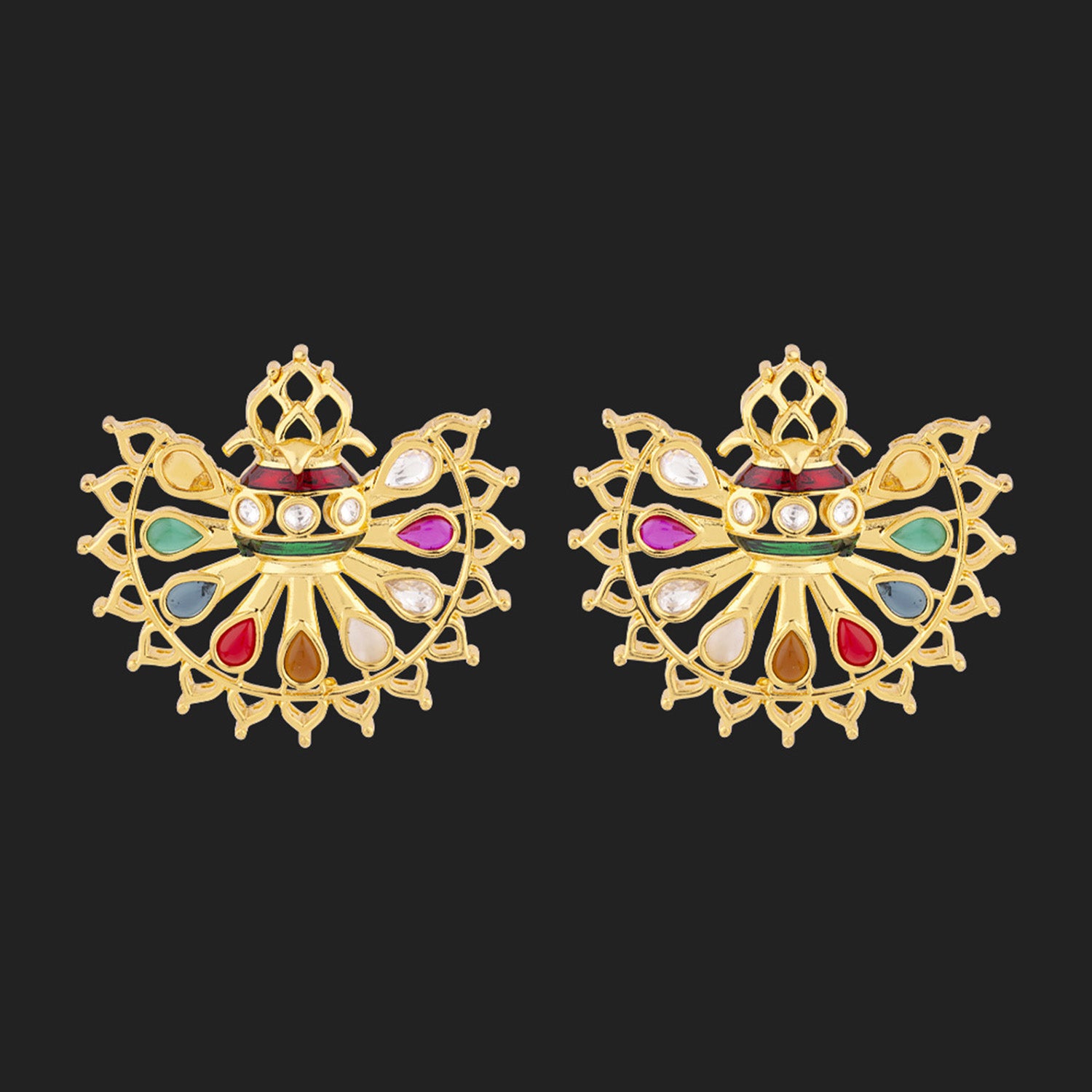 Temple design earrings inspired by traditional nine gems jewelry. Made from brass, the pair has been embellished with zircon gemstones. Yellow gold plated, lightweight and a good match for formal ethnic looks. This piece of jewelry comes with the Voylla assurance of quality and durability.