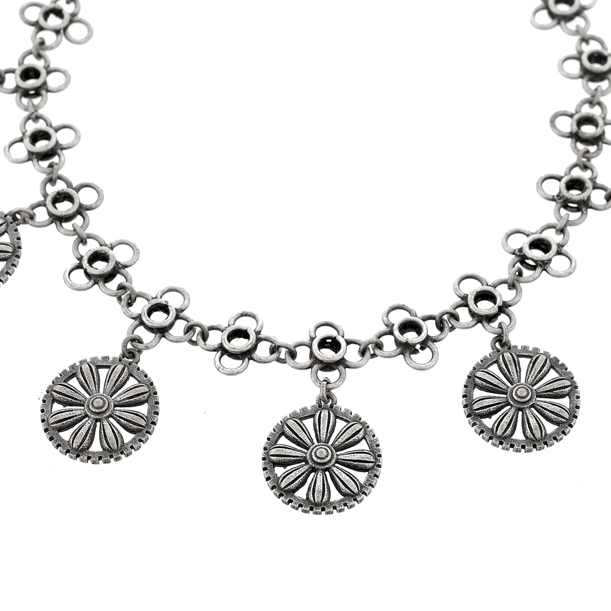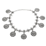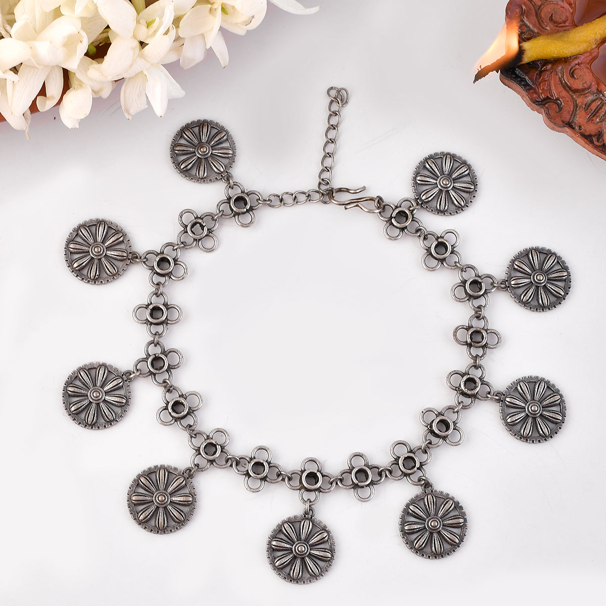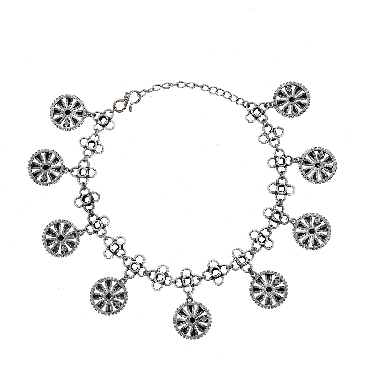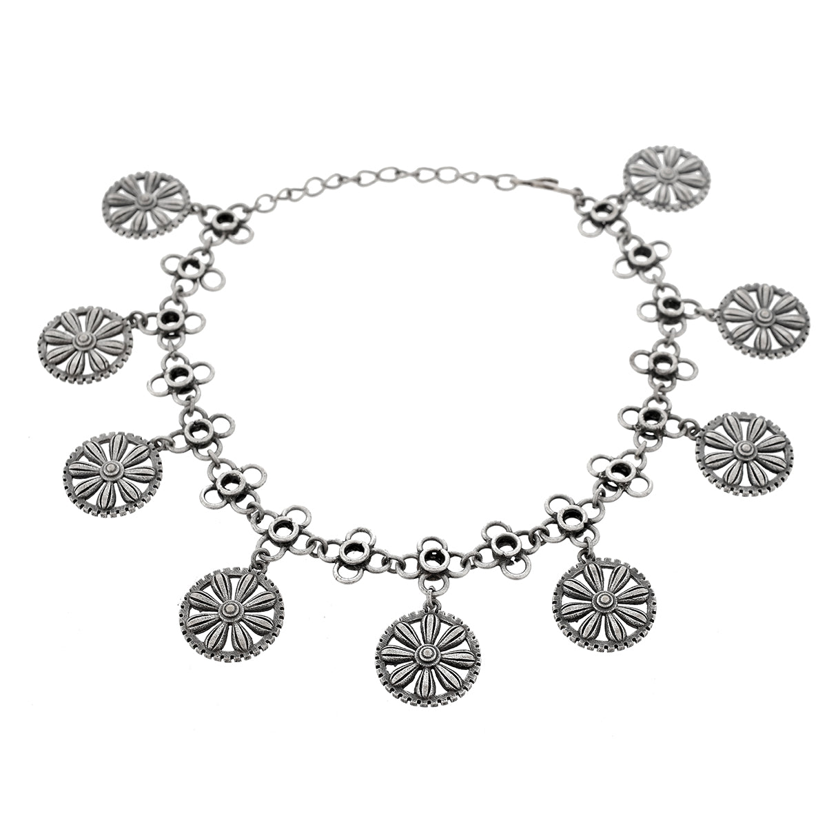 Traditional banjara designs and elements of Navratri have inspired these brass anklets, which have been lightly embellished and feature antique style charms. Silver oxidized plated and can be paired with a wide range of looks and styles.