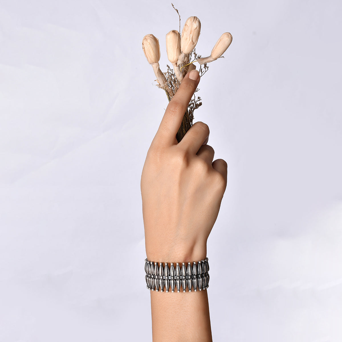 An antique inspired brass bracelet, inspired by the festivities and essence of garba dance and beautiful banjara designs. Silver oxidized plated and adjustable for maximum comfort, the statement bracelet is versatile and eye-catching.