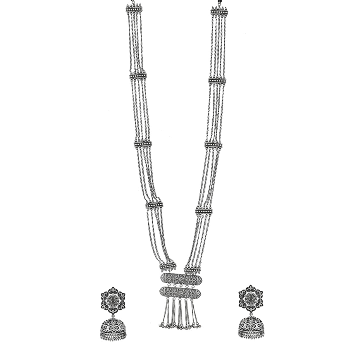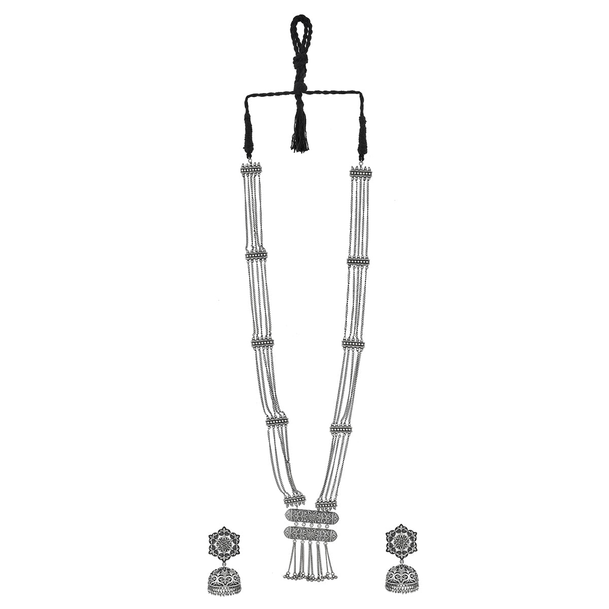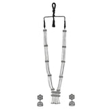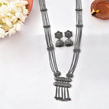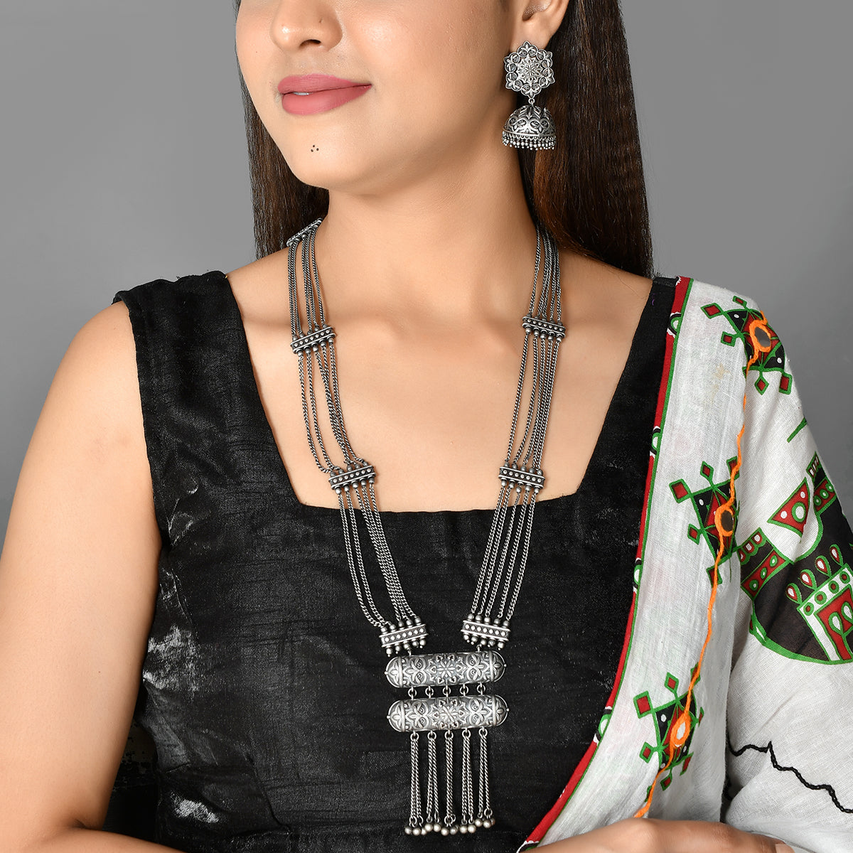 Inspired by beautiful banjara designs and the elements of Navratri, this Boho design jewellery set has been fashioned out of brass. The long necklace and matching earrings have been given an oxidized silver plating. Lightweight, comfortable and versatile.