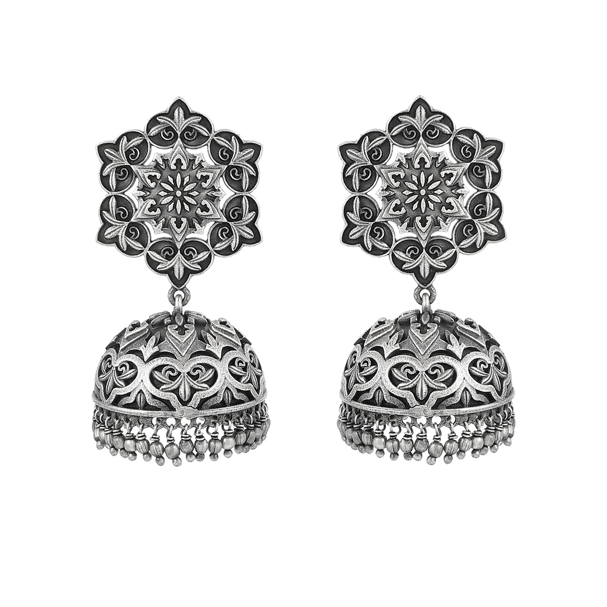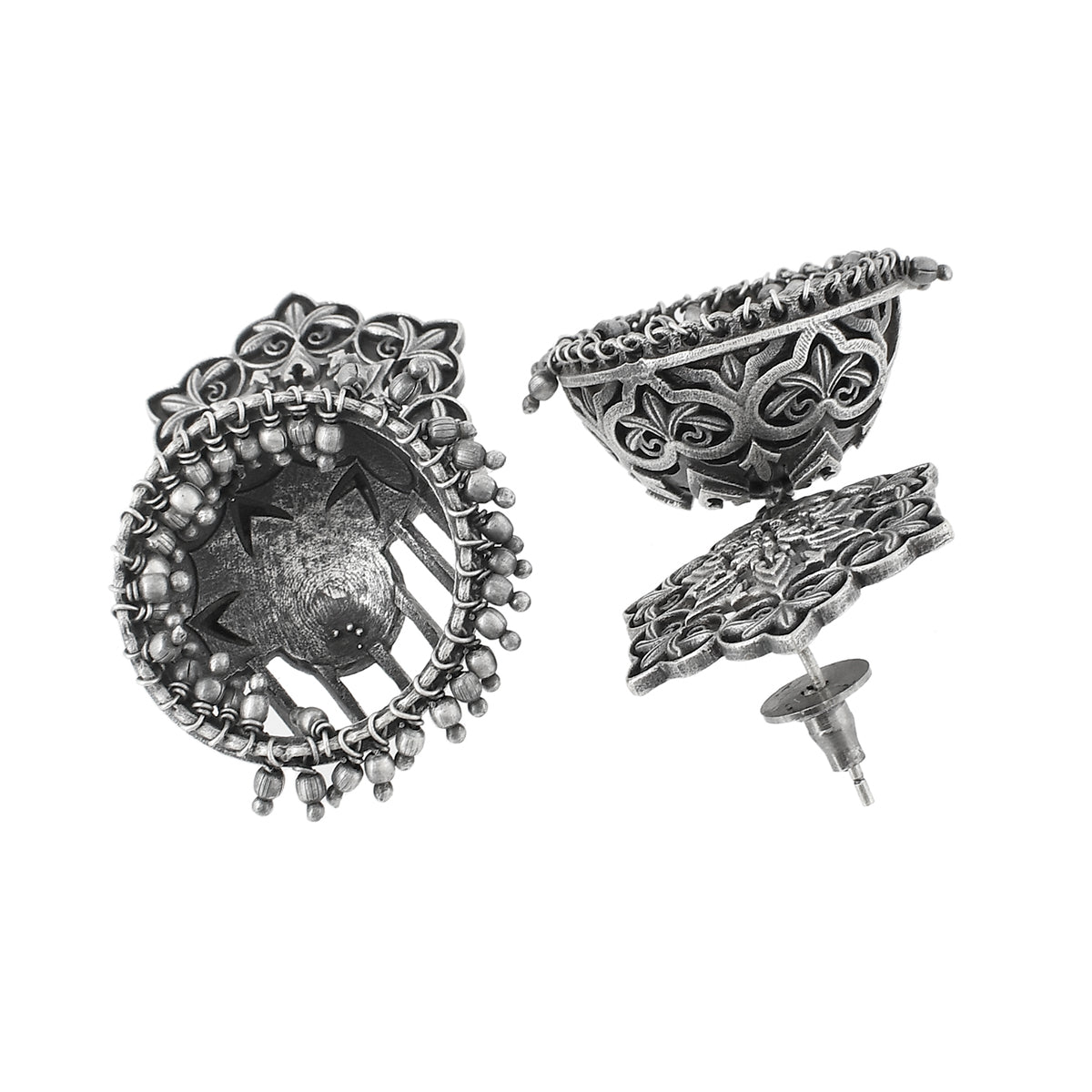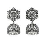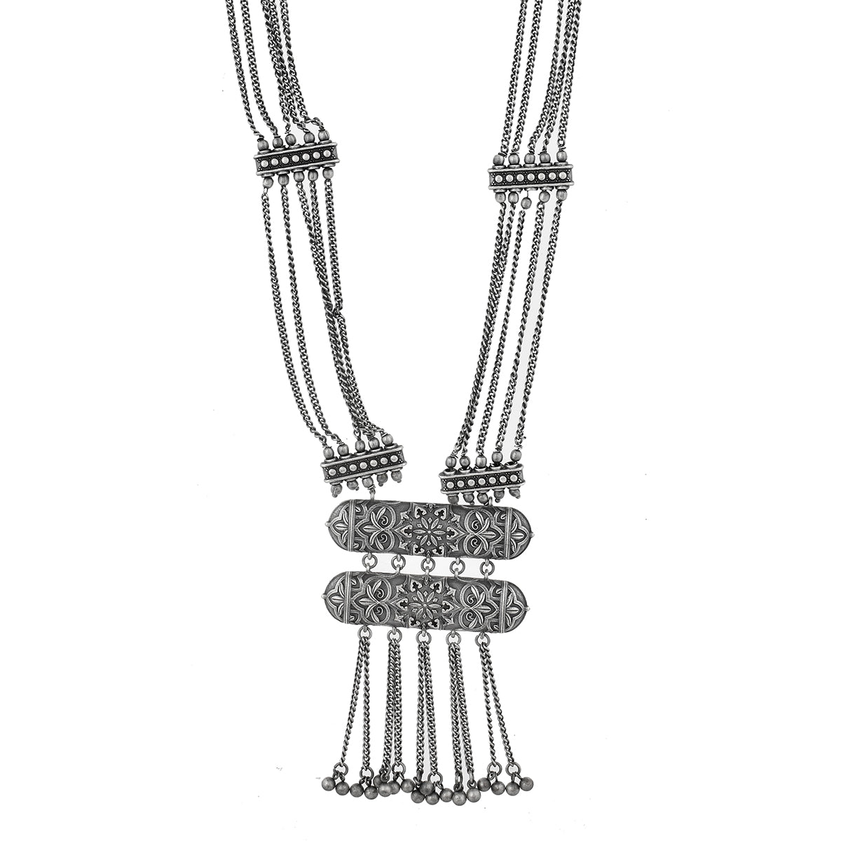 Inspired by beautiful banjara designs and the elements of Navratri, this Boho design jewellery set has been fashioned out of brass. The long necklace and matching earrings have been given an oxidized silver plating. Lightweight, comfortable and versatile.