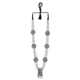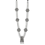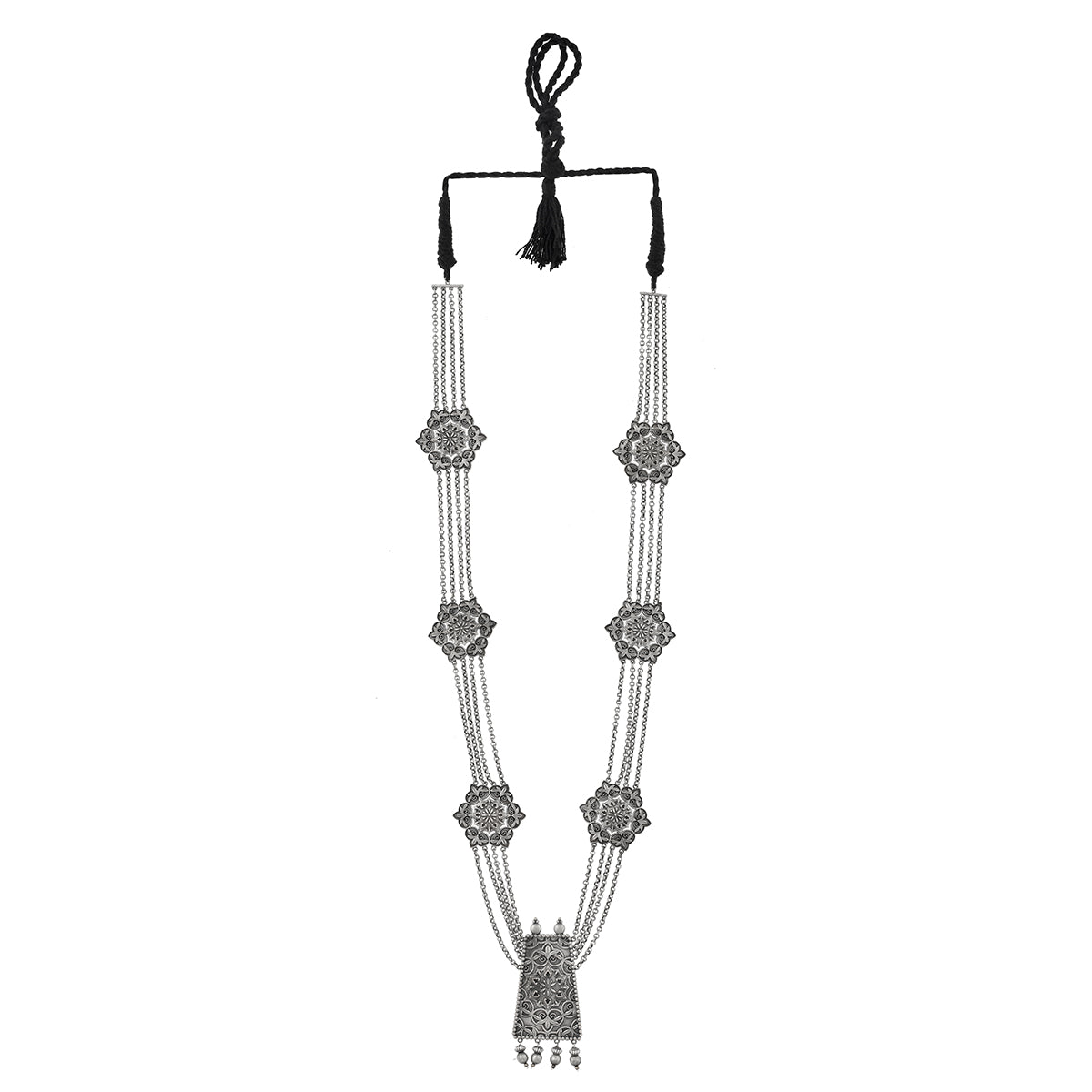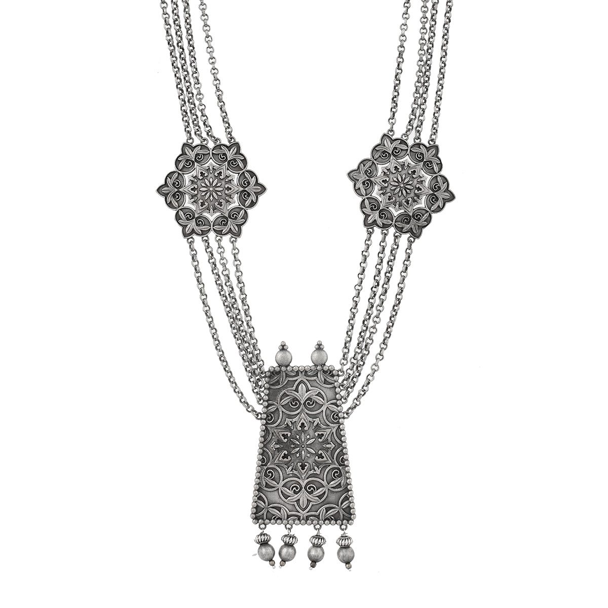 The elements and essence of the Indian festival of Navratri have inspired this cutwork design statement necklace, which features delicate floral designs. Made from brass and oxidized silver plated. Pair with an ethnic skirt or traditional kurta.